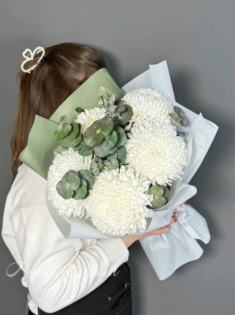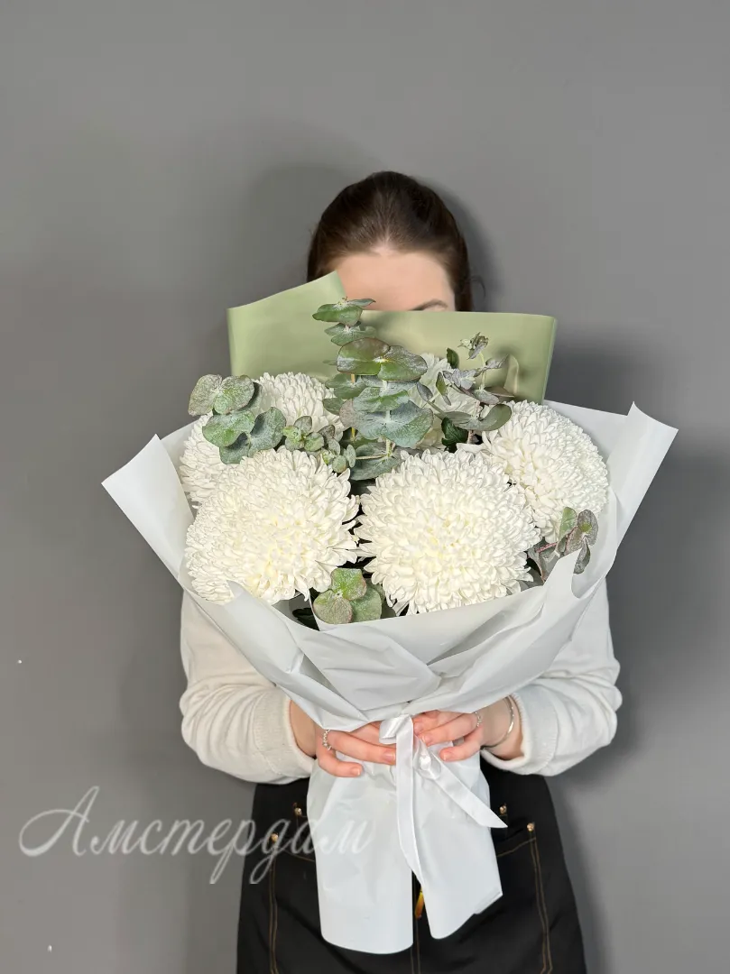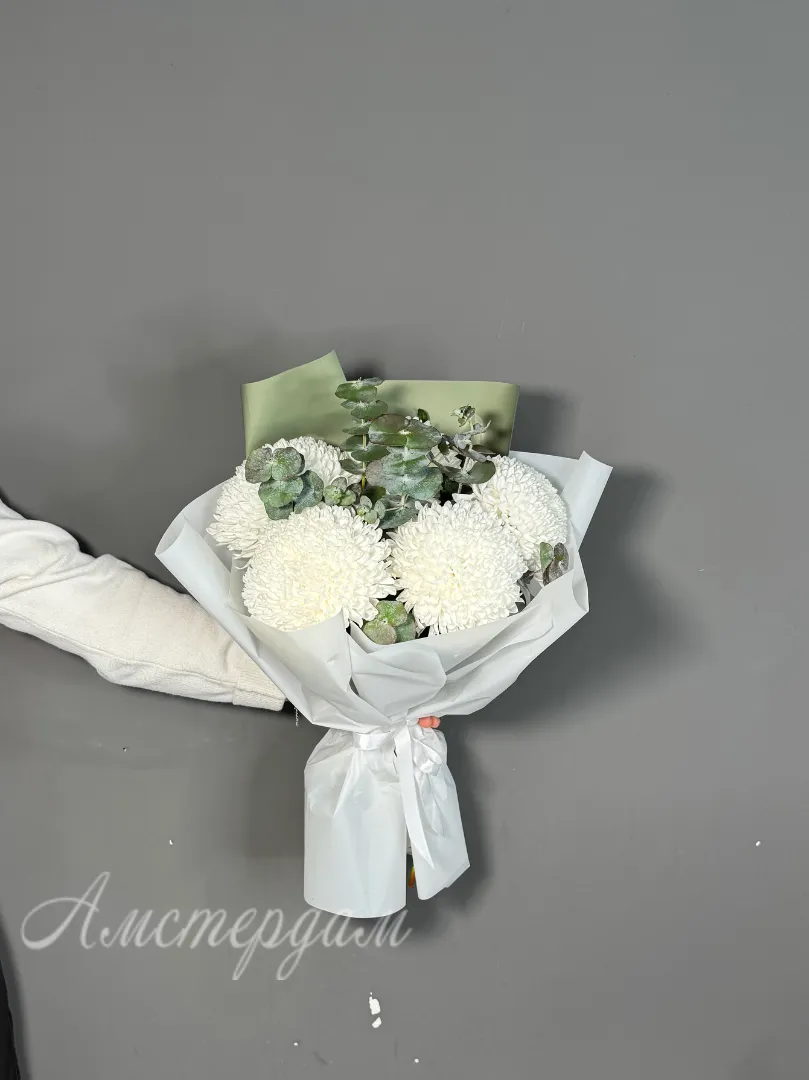 Этот букет сочетает в себе изысканность и свежесть. В его состав входит красивая упаковка, подчеркивающая элегантность композиции. Основой букета являются одноголовые хризантемы, создающие яркий и аккуратный акцент. В дополнение к цветам добавлен эвкалипт, придающий композиции ароматную нотку и свежий зелёный оттенок. such яркий декоративный ансамбль отлично подойдет для праздничных мероприятий или в качестве приятного подарка. Уникальное сочетание цветов и зелени делает этот букет стильным и запоминающимся.