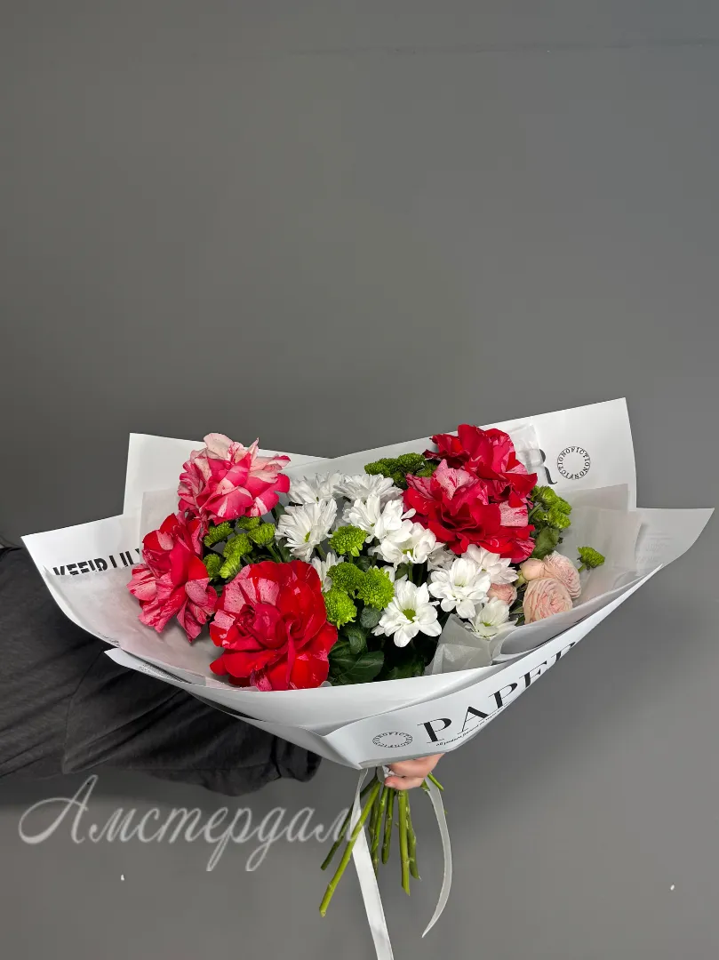 Этот элегантный букет сочетает в себе французские розы, хризантемы и Сантини, создавая изысканное цветочное решение. Композиция включает упаковку, кустовую розу и французскую розу, подчеркивая утонченность и стиль. Такой букет станет отличным подарком для особого случая или украшением интерьера. Изысканное сочетание цветов подарит радость и настроение на долгое время.