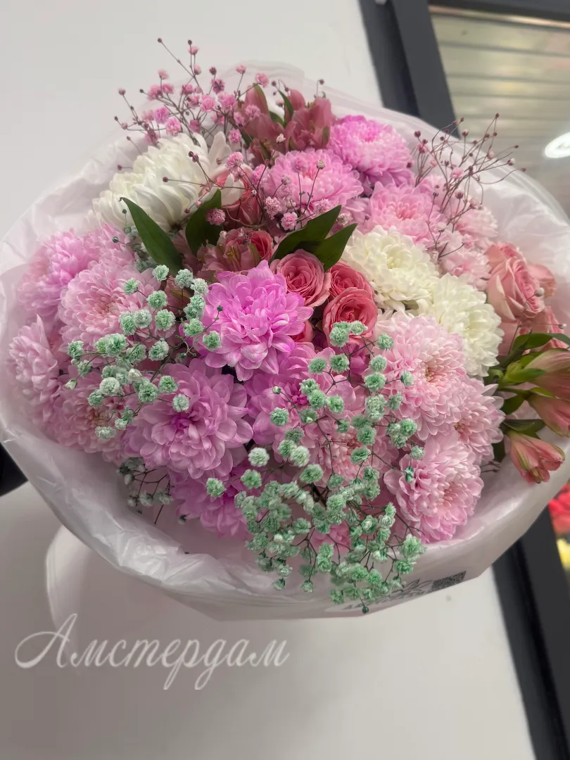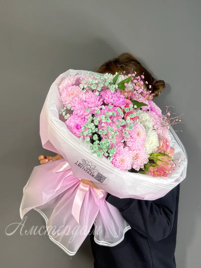 Этот букет весел и ярко украшен, создавая настроение радости и свежести. В его составе есть изящная упаковка, которая придает композиции завершенный вид. Центральную часть букета занимают красивые альстромерии, добавляющие нежность и элегантность. Радужная гипсофила обвивает цветы своей пестрой и воздушной текстурой. Кустовые хризантемы привносят объем и насыщенность, создавая гармонический баланс. Кустовые розы добавляют романтичности и теплоты, делая букет еще более привлекательным. Каждая ветка тщательно выбрана и собрана для достижения идеальной композиции. Такой букет отлично подойдет для любого праздничного случая или в качестве подарка для близкого человека.