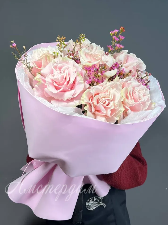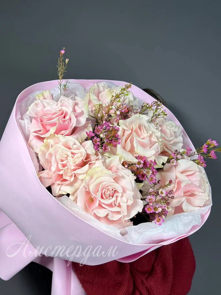 Букет из нежных французских роз и хамелациумом