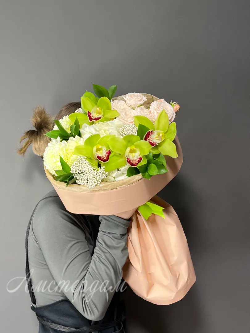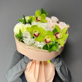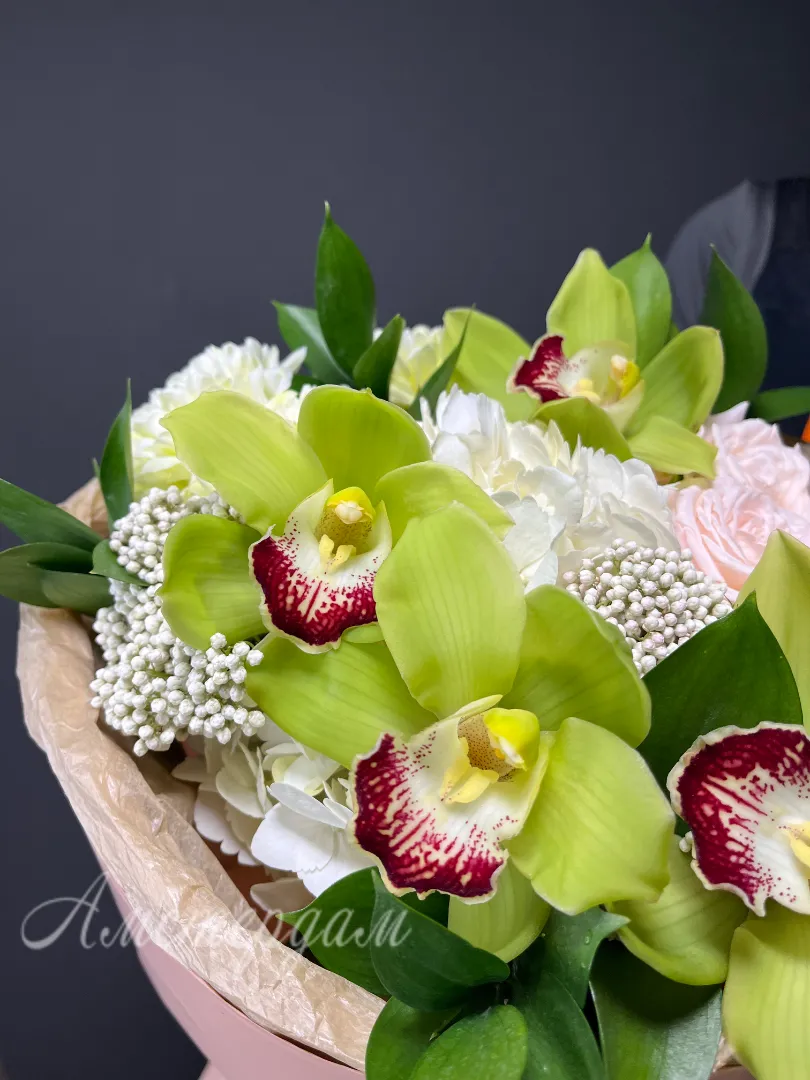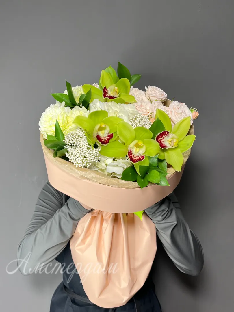 Букет «Алия» — это изысканное сочетание нежных цветов, созданное для особых случаев. В его состав входят изящные орхидеи, элегантные гортензии и пышные кустовые хризантемы, придающие композиции объем и утонченность. Дополняют букет озатамнус и рускус, добавляя ему текстурных и цветовых акцентов. Кустовые пионы-розы подчеркивают романтичность и богатство букета. Все цветы аккуратно собраны в стильную дизайнерскую упаковку, украшенную атласной лентой. Такой букет станет прекрасным подарком для человека, ценящего красоту и элегантность.