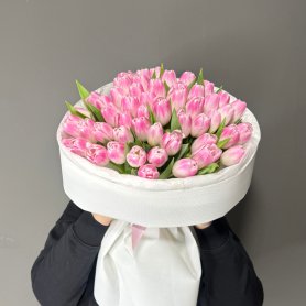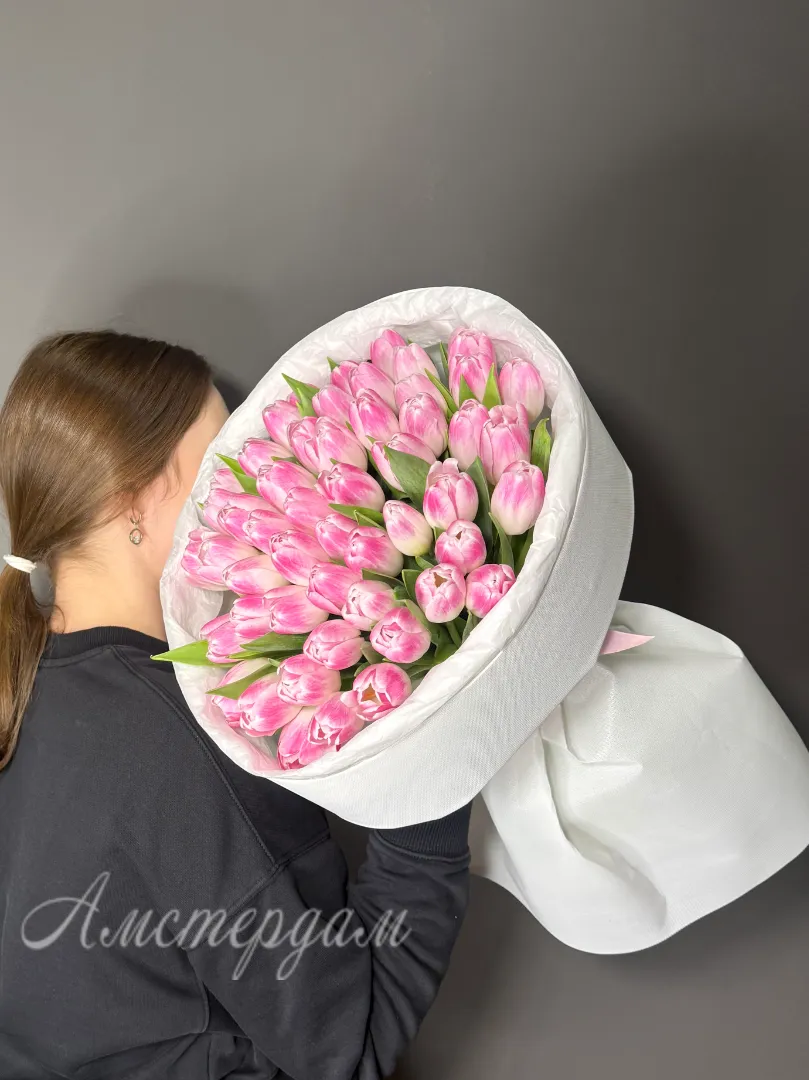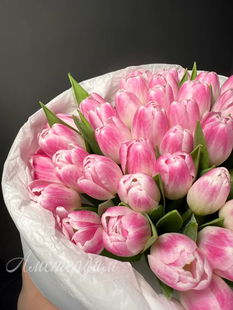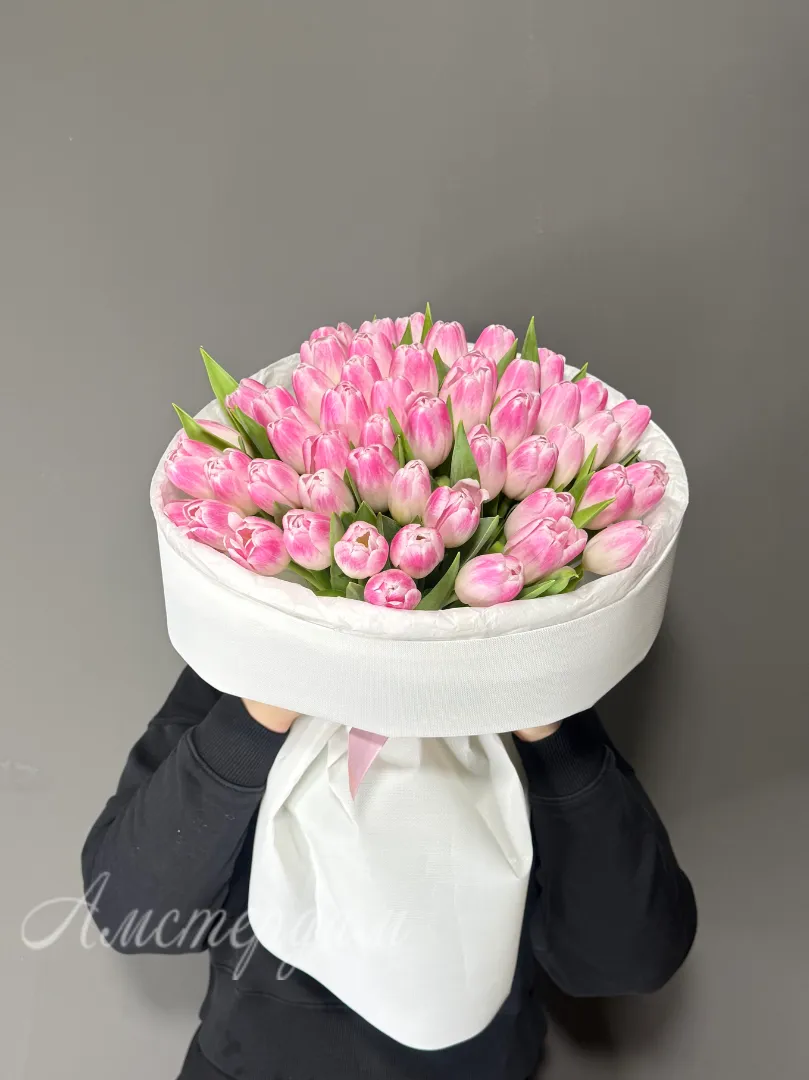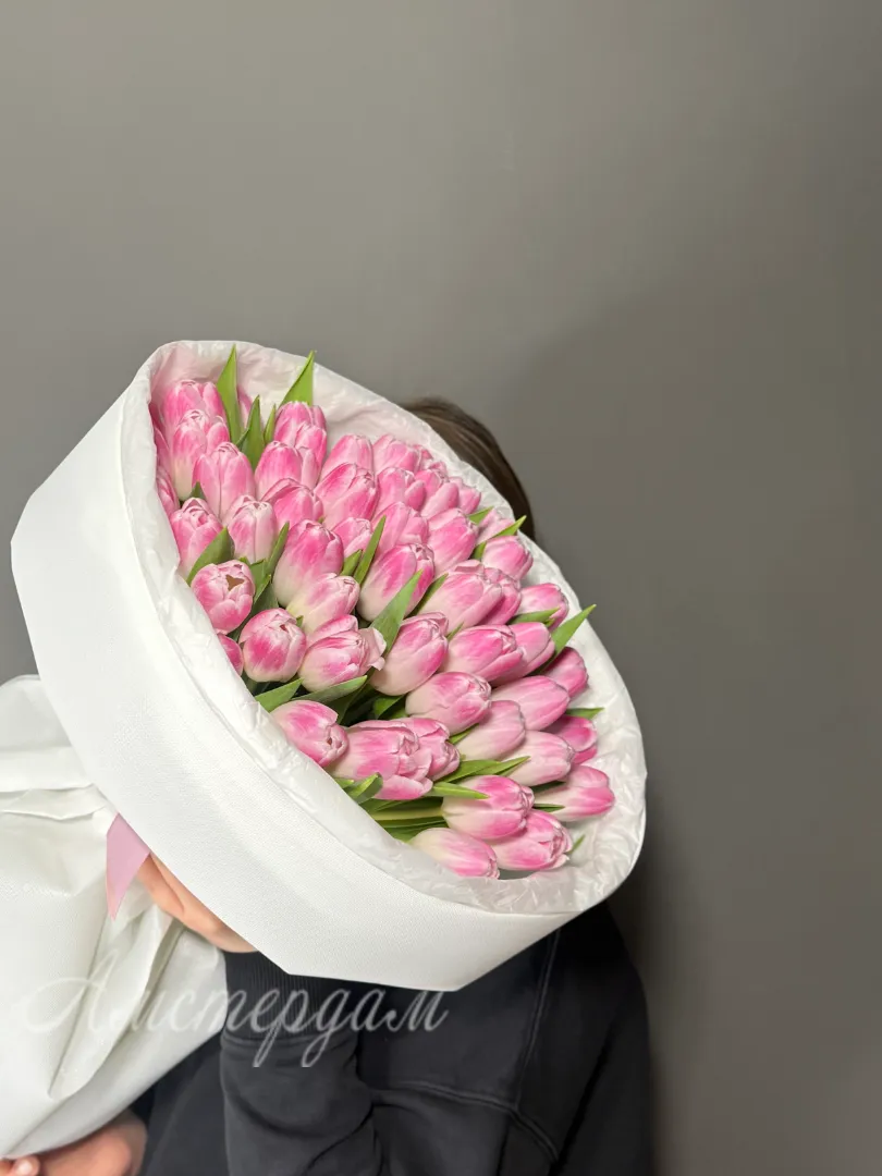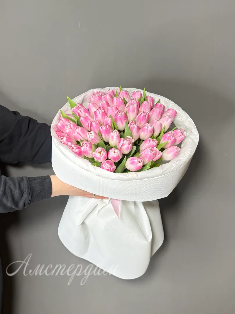 Этот изящный букет состоит из 51 бело-розового тюльпана, аккуратно оформленного в элегантную упаковку. Украшенный атласной лентой, он выглядит стильно и празднично. Такой букет отлично подойдет для выражения нежности и любви.