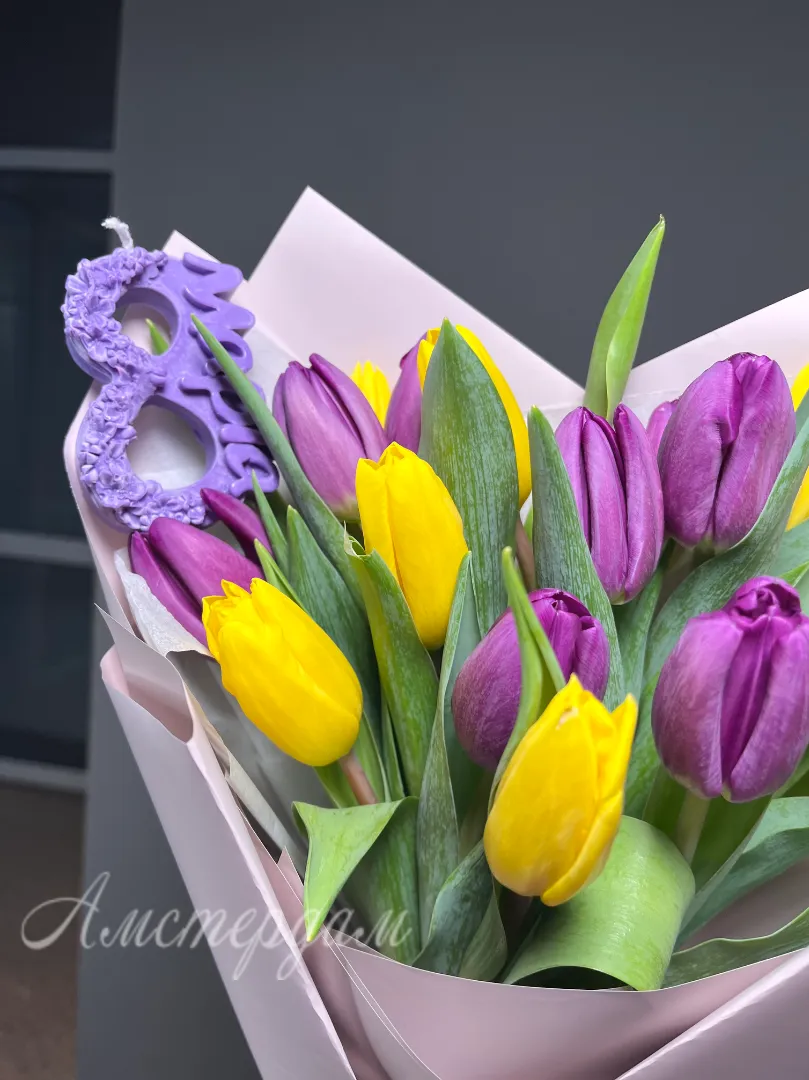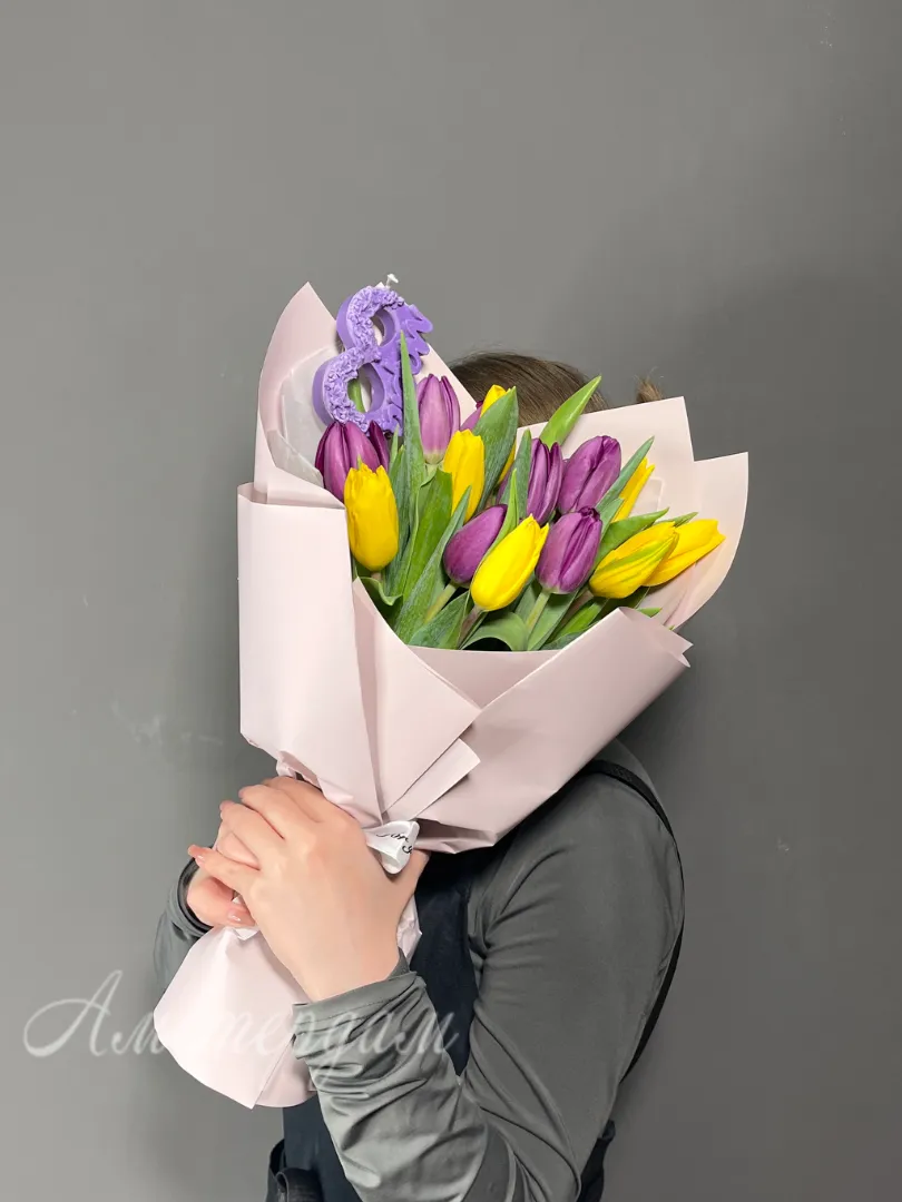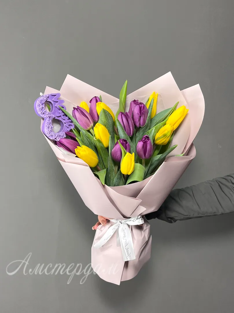 Подарочный букет «8 марта» отлично подчеркнёт особенность праздника и порадует any женщину. В составе букета — тюльпаны, украшенные стильной дизайнерской упаковкой и атласной лентой, а также свечка «8 марта». Этот элегантный комплект станет оригинальным и трогательным подарком к Международному женскому дню.