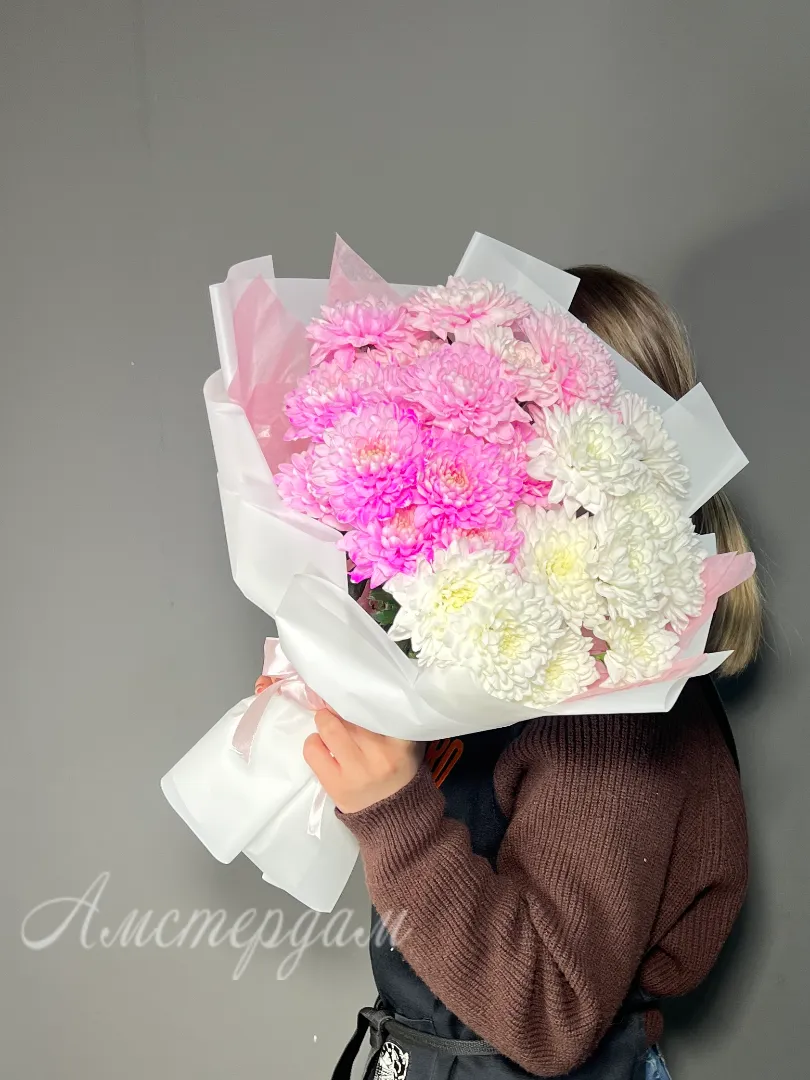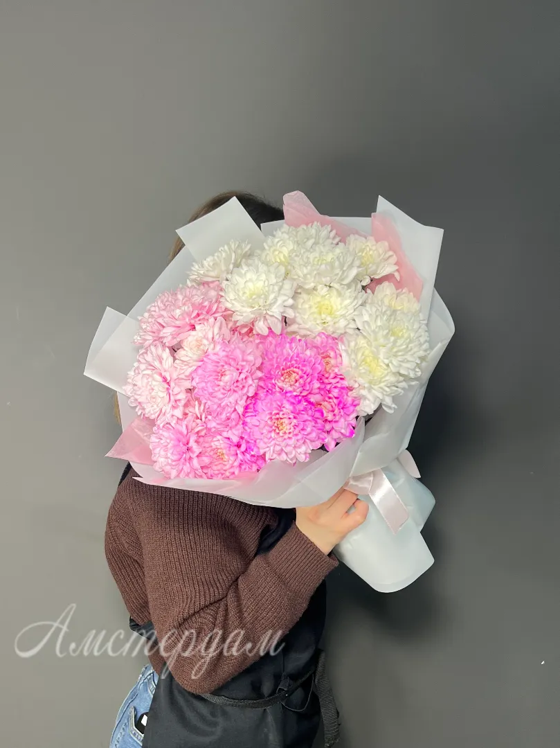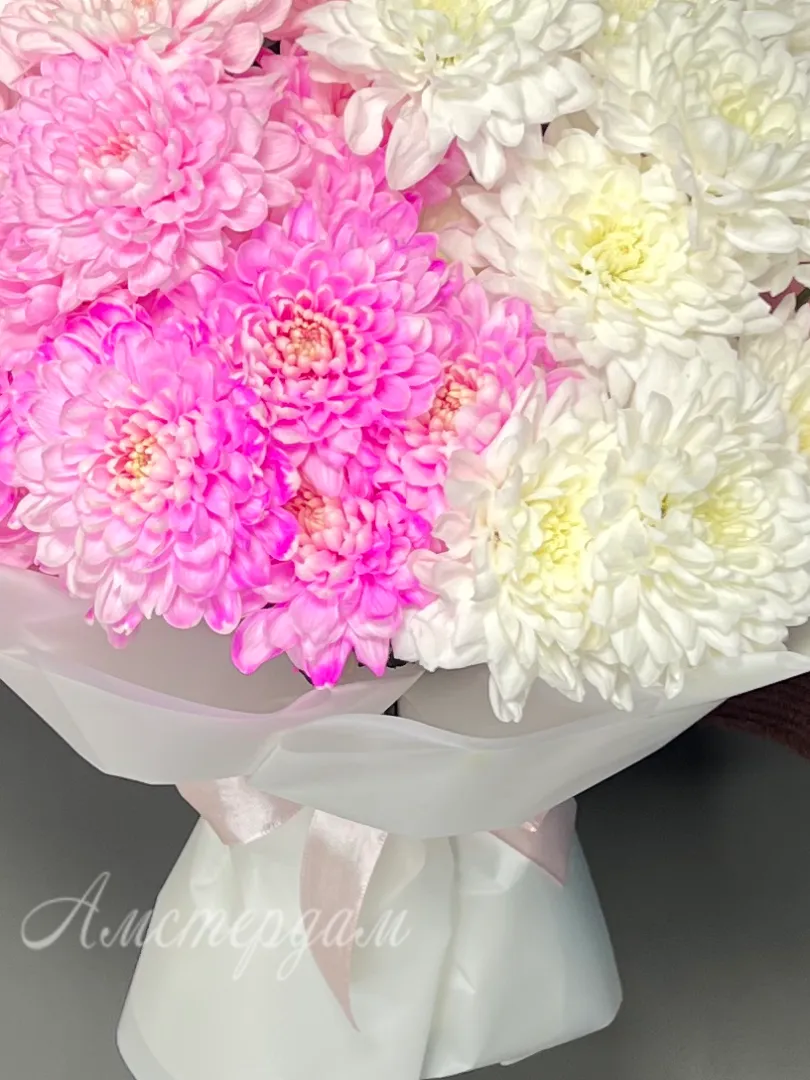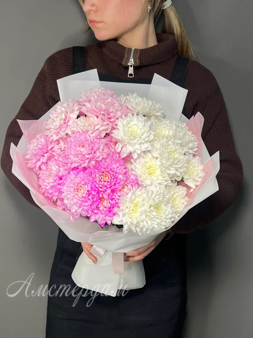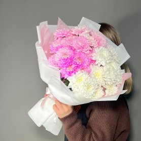 Восхитительный букет из нежно-розовых хризантем станет идеальным подарком для выражения теплых чувств и искренней заботы. Каждый цветок в букет è кустовой хризантемы, аккуратно оформленный в стильную дизайнерскую упаковку и украшенный атласной лентой. Подарите радость и нежность с этим изысканным цветочным ансамблем!