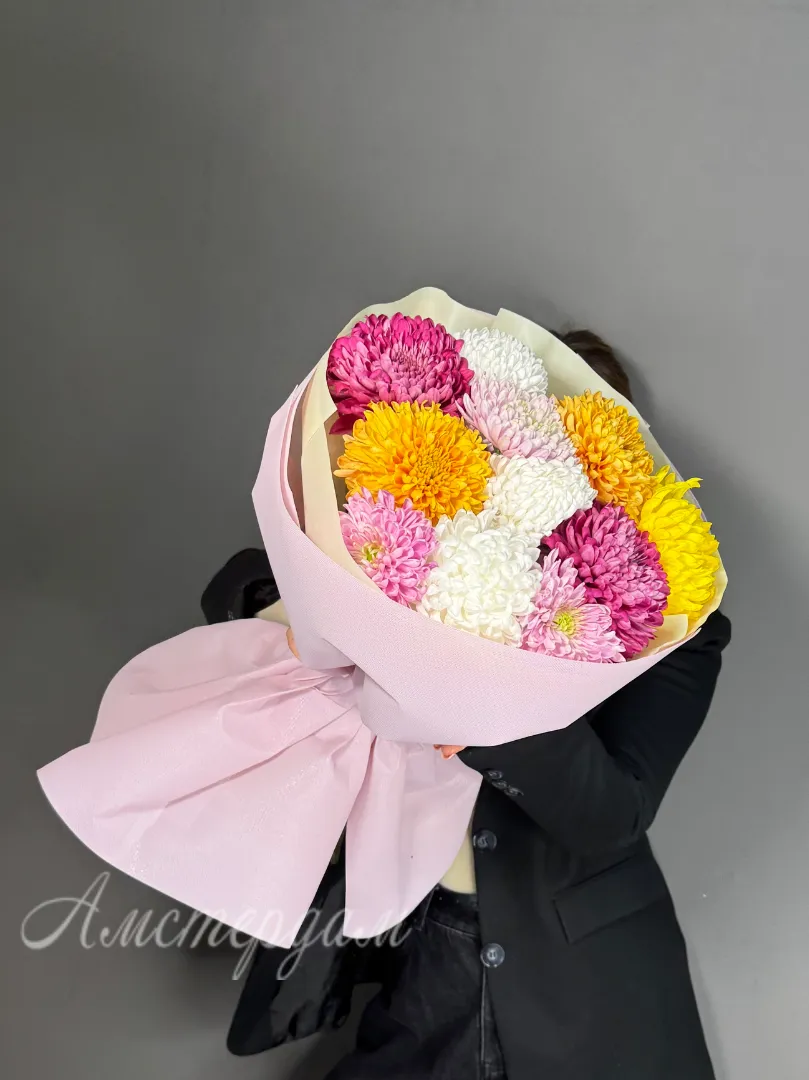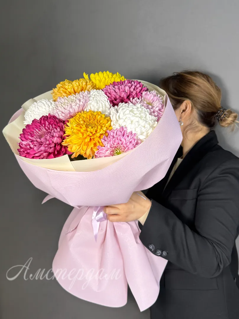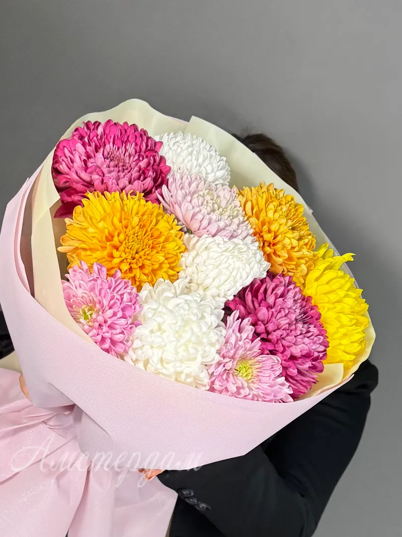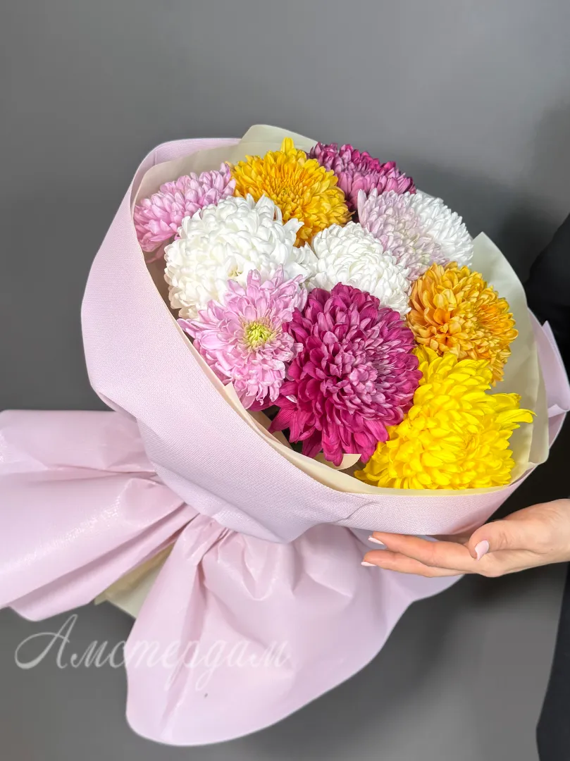 Подарите своим близким нежность и радость с букетом из 11 разноцветных хризантем, аккуратно оформленным в стильную упаковку. Эти одноголовые хризантемы создадут атмосферу уюта и тепла в любом доме. Идеальный выбор для поздравлений, особых случаев или для выражения искренних чувств. Насладитесь красотой и свежестью каждого цветка, подчеркнув свою заботу и внимание.