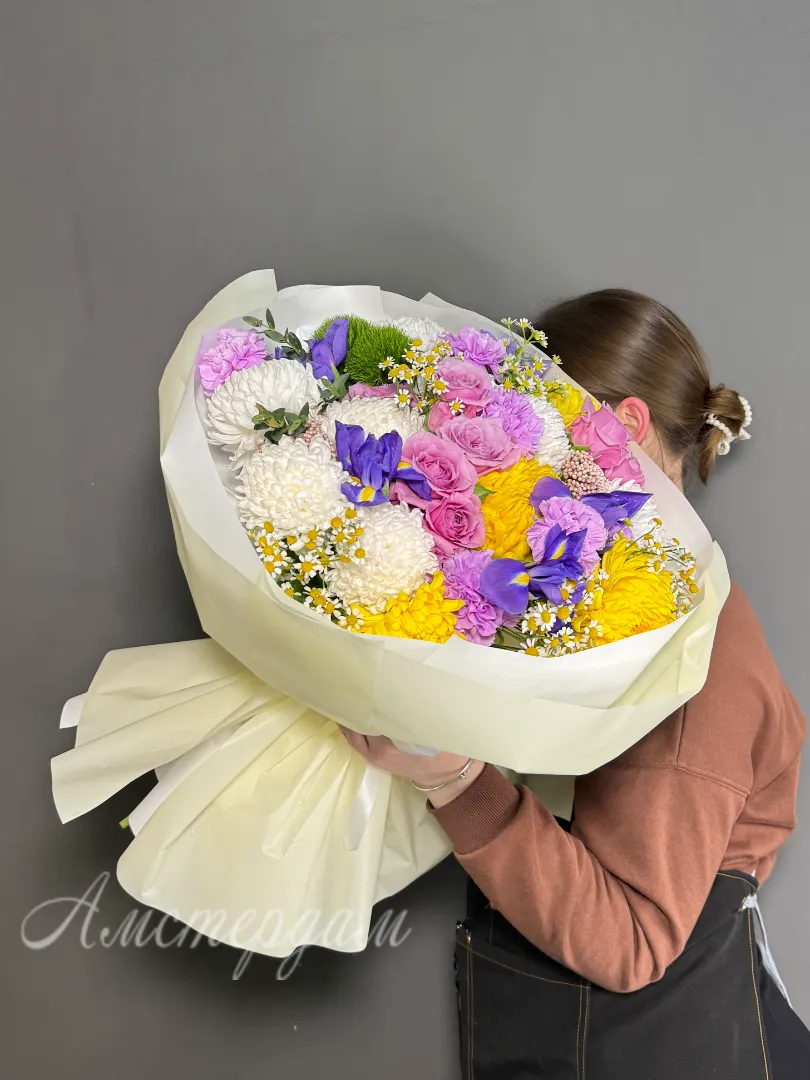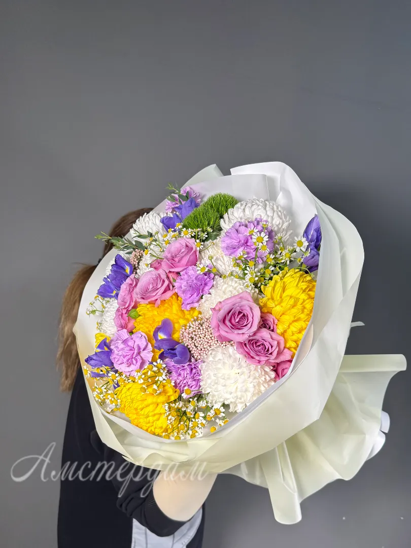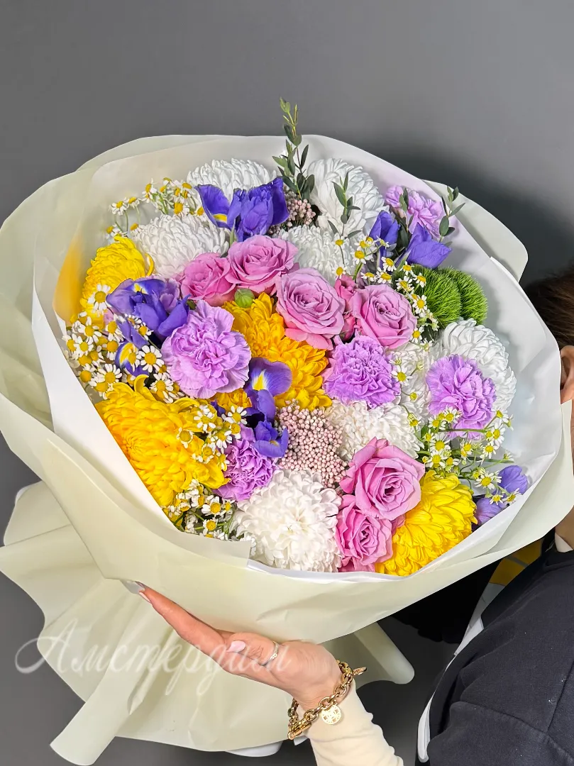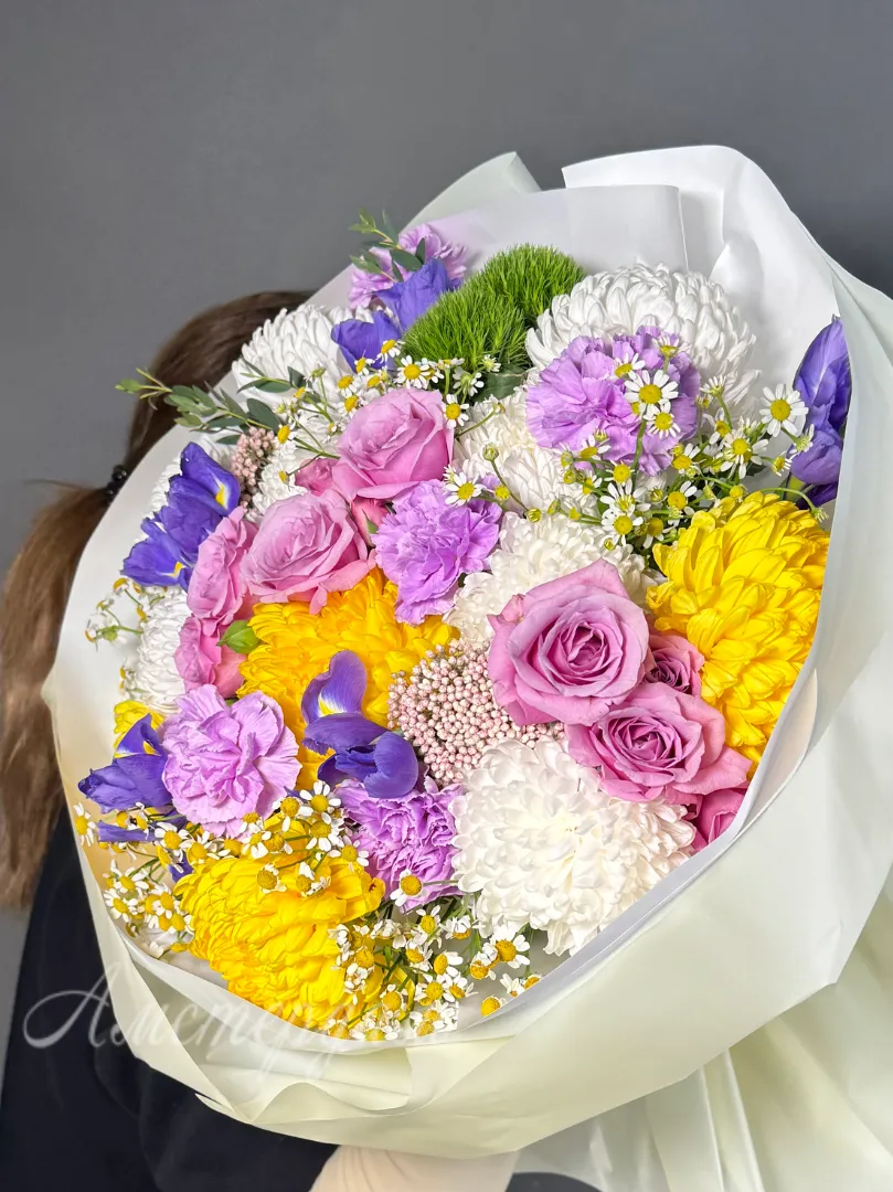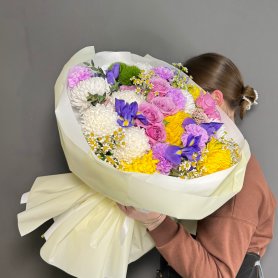 Букет «Ярко» радует яркими и насыщенными оттенками. В его состав входят свежие ирисы, кустовая роза и хризантема одноголовая, создающие насыщенную палитру, а дополнены гвоздикой киви и адптантами озатамнуса и танацетума. Цветы идеально сочетаются с листями эвкалипта, придающими композиции свежести и изысканности. Букет украшен атласной лентой и аккуратной упаковкой, подчеркивая его праздничность. Этот яркий и насыщенный букет станет прекрасным выразительным подарком и для особых случаев, и для повседневной радости.
