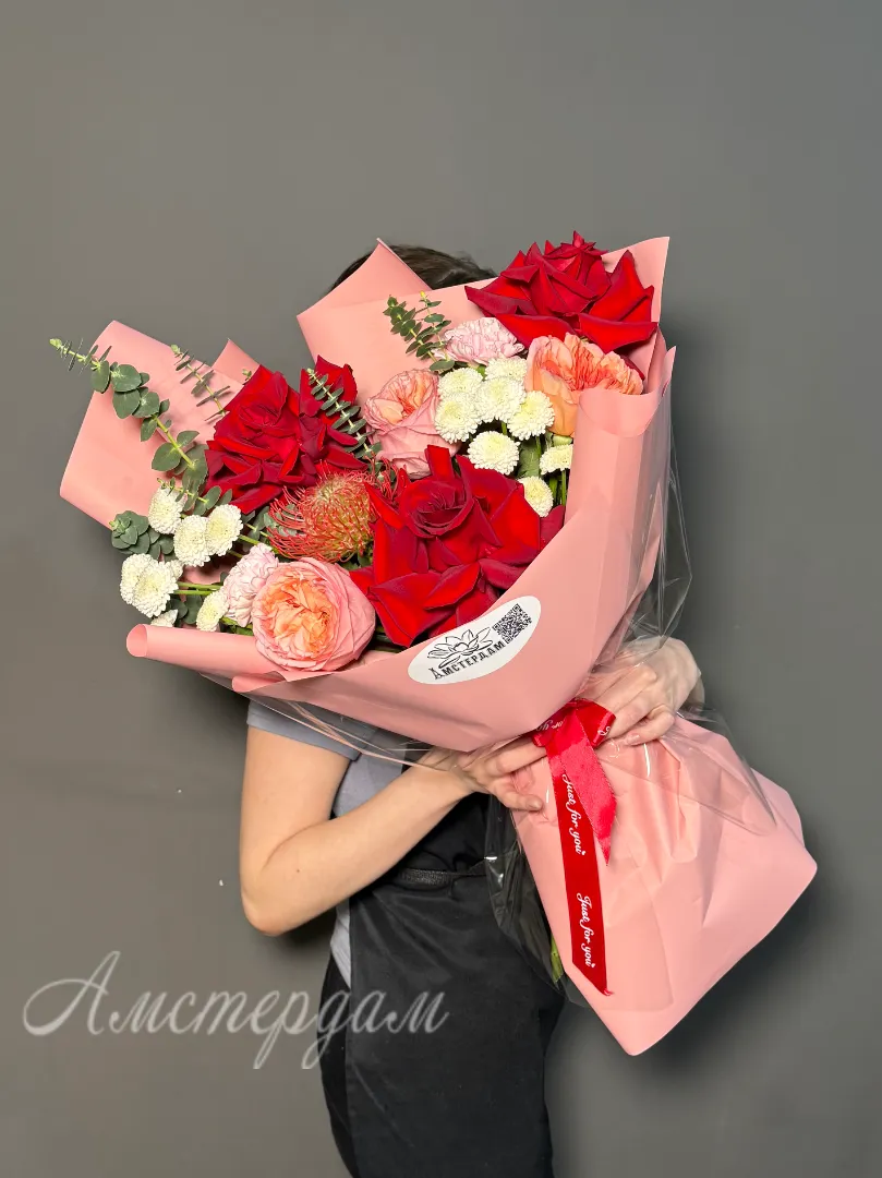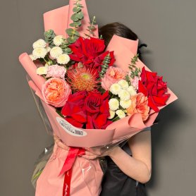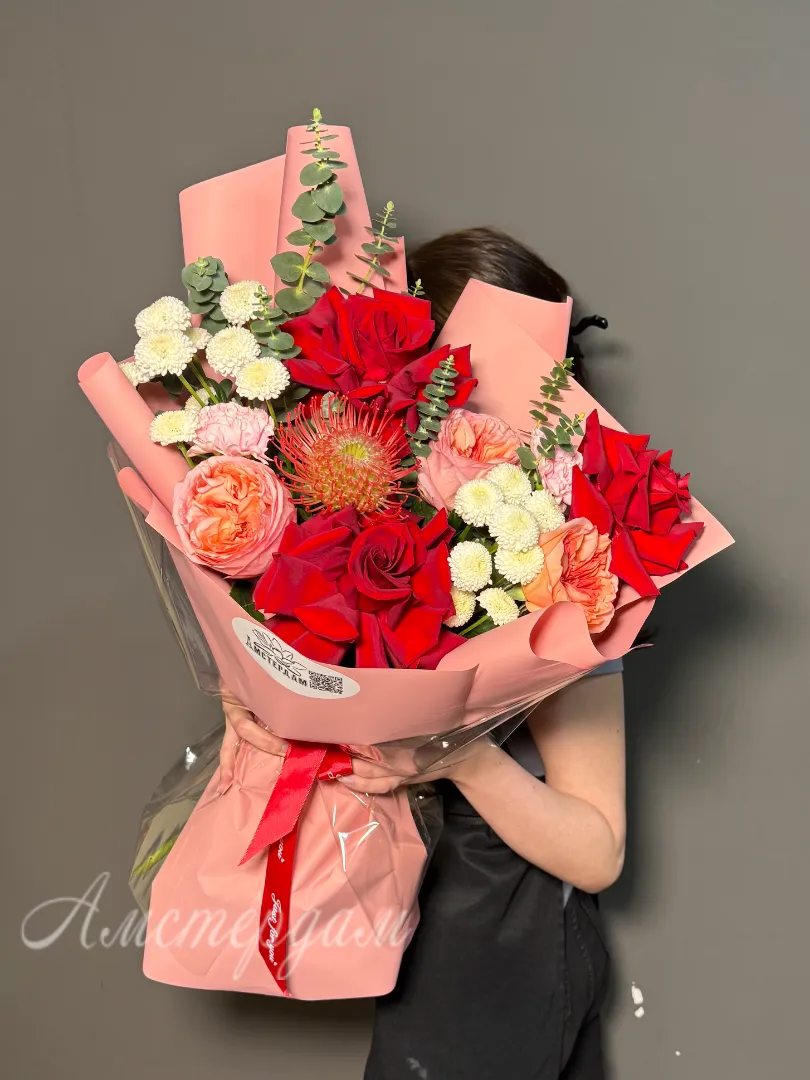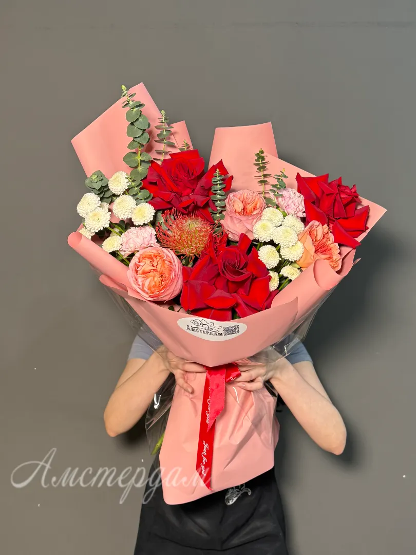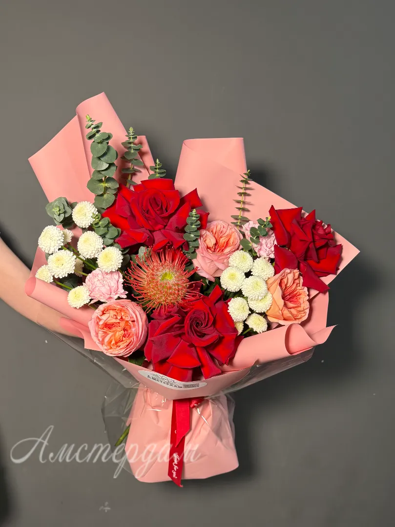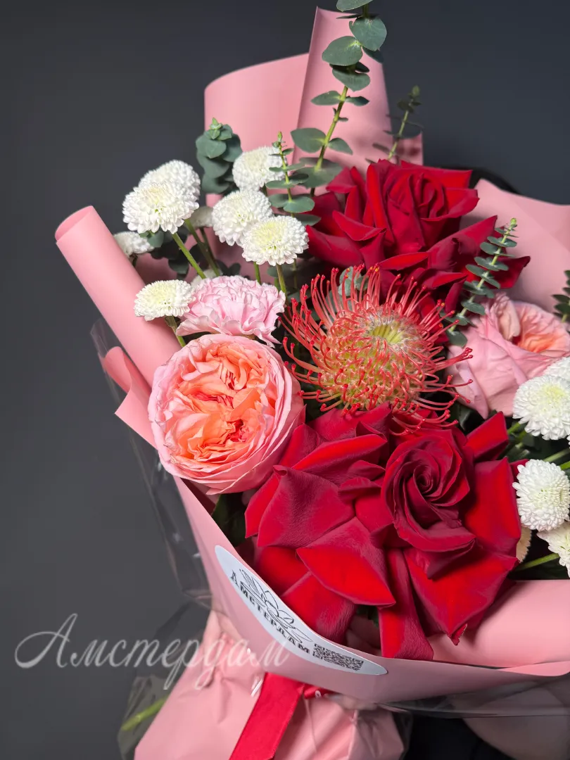 Этот роскошный букет – воплощение элегантности и нежности, сплетенное из лучших французских и пионовидных роз. Бархатистые лепестки роз, словно сотканные из утренней росы, источают тончайший аромат. Их пышные бутоны, напоминающие рассветные облака, переплетаются с изумрудной зеленью эвкалипта, добавляя композиции свежести и глубины. Яркие акценты диантуса и экзотических цветов придают букету игривость и неповторимый шарм. Нежная кустовая хризантема добавляет воздушности и объёма, создавая гармоничное сочетание текстур. Атласная лента, деликатно повязанная на стеблях, подчеркивает изысканность букета. Каждая роза в этой композиции – произведение искусства, обладающее своей уникальной историей. Дизайнерская упаковка завершает образ, делая этот букет идеальным подарком для особого случая. Это не просто цветы, это послание любви, восхищения и безупречного вкуса.