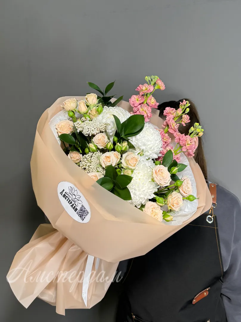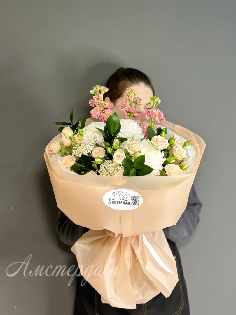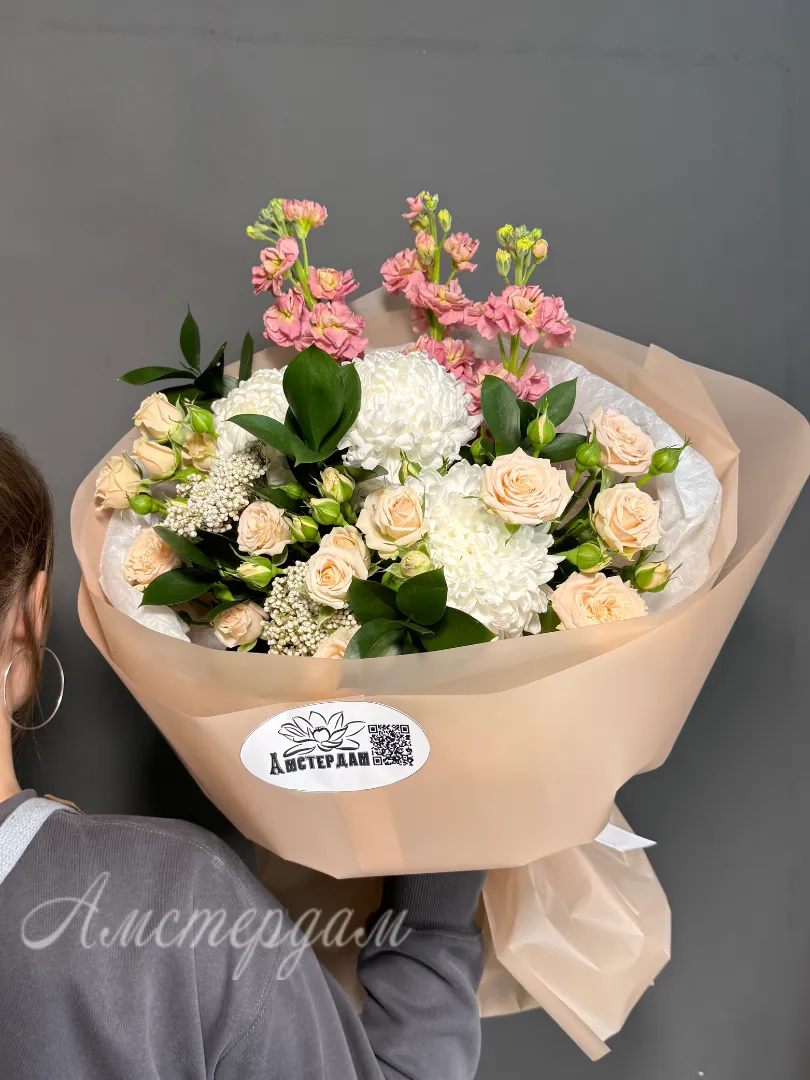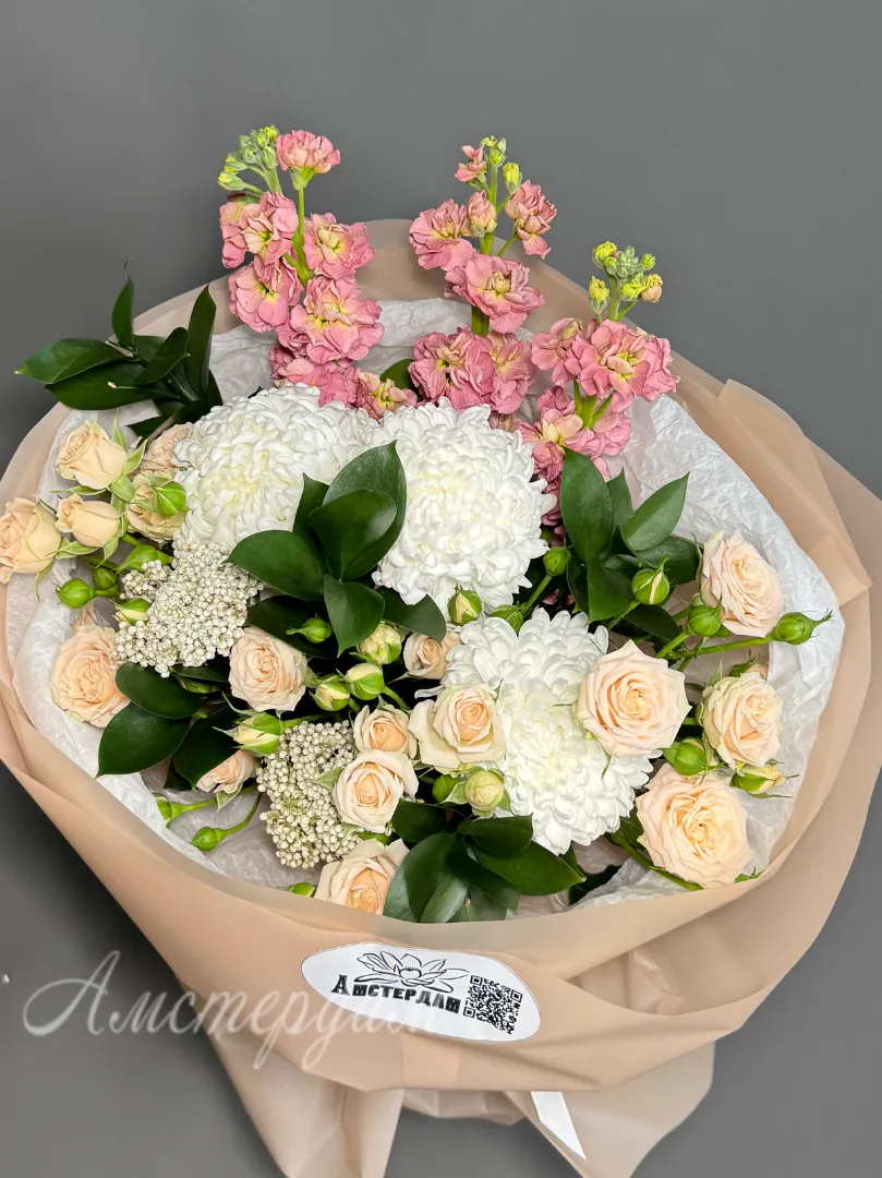 Букет с матиолой, хризантемой, кустовыми розами и озатамнусом
