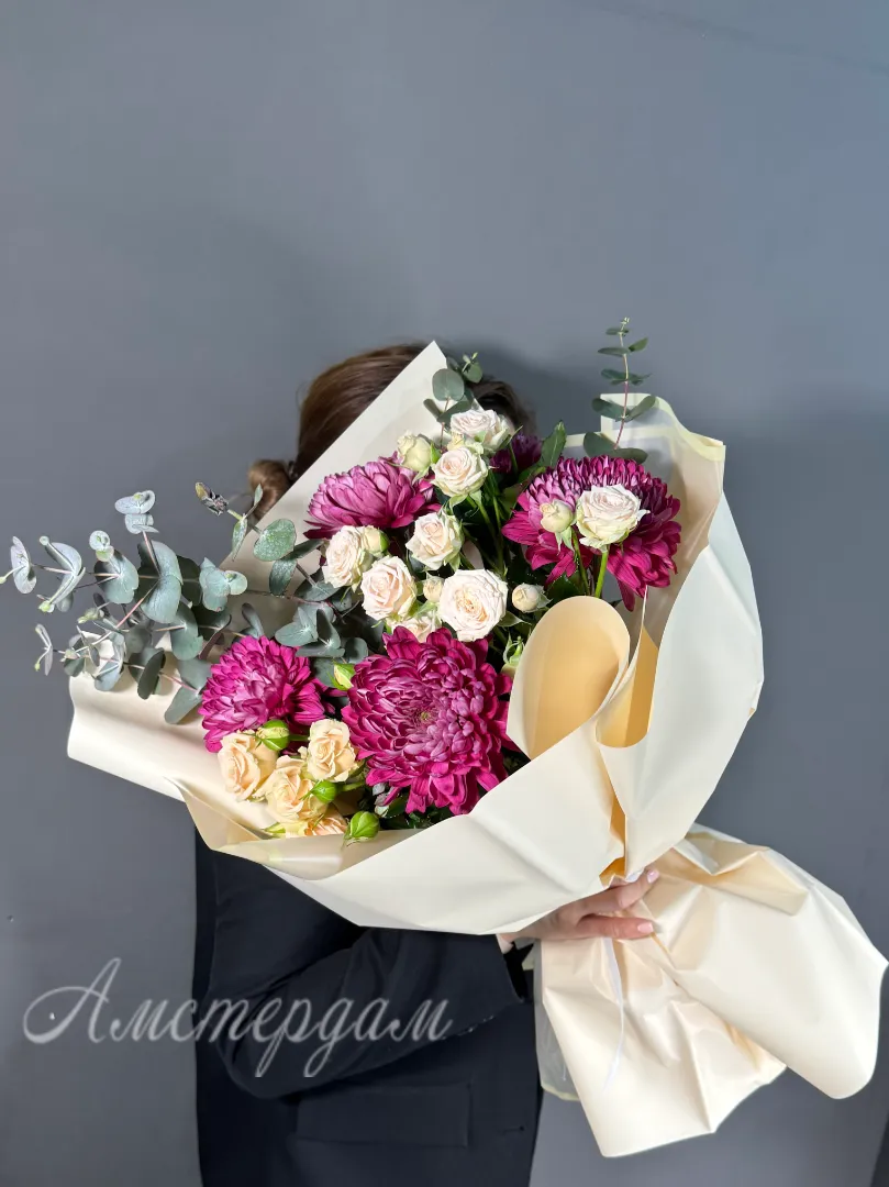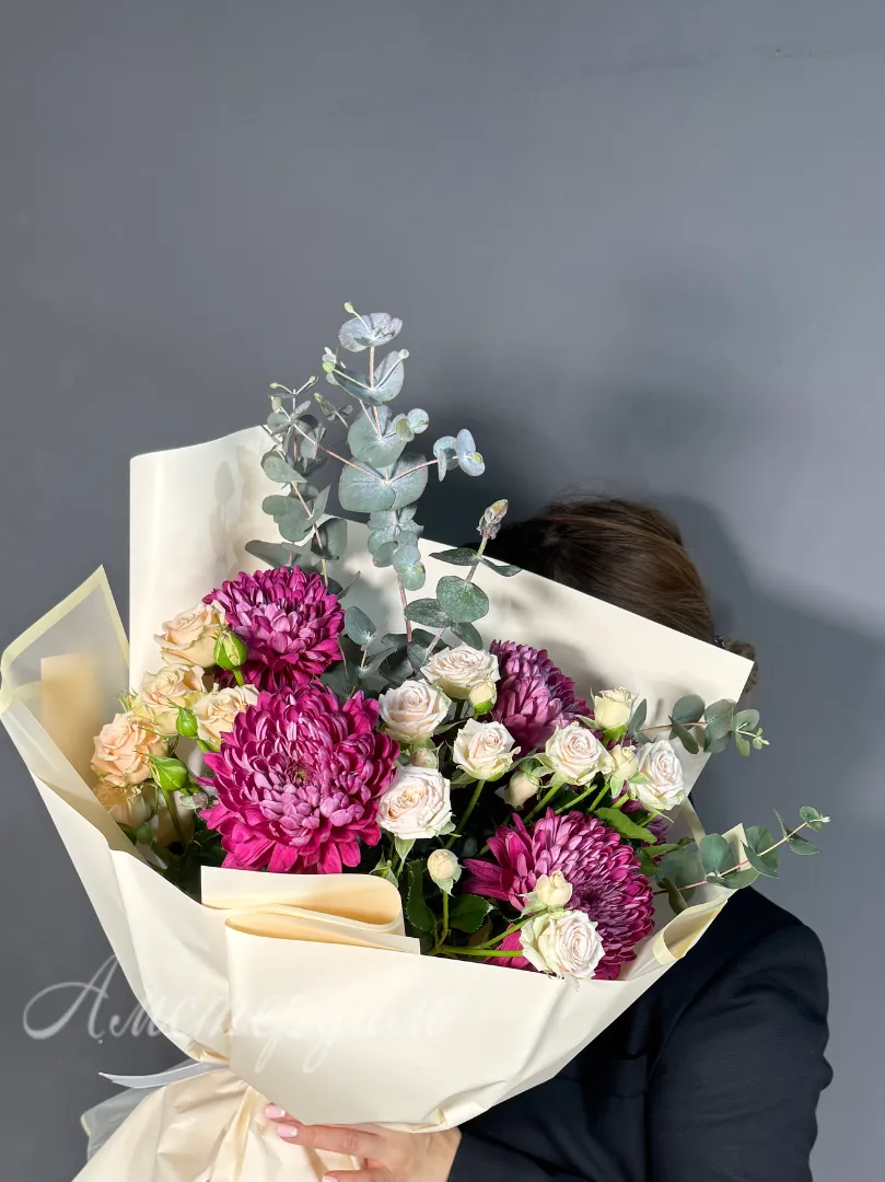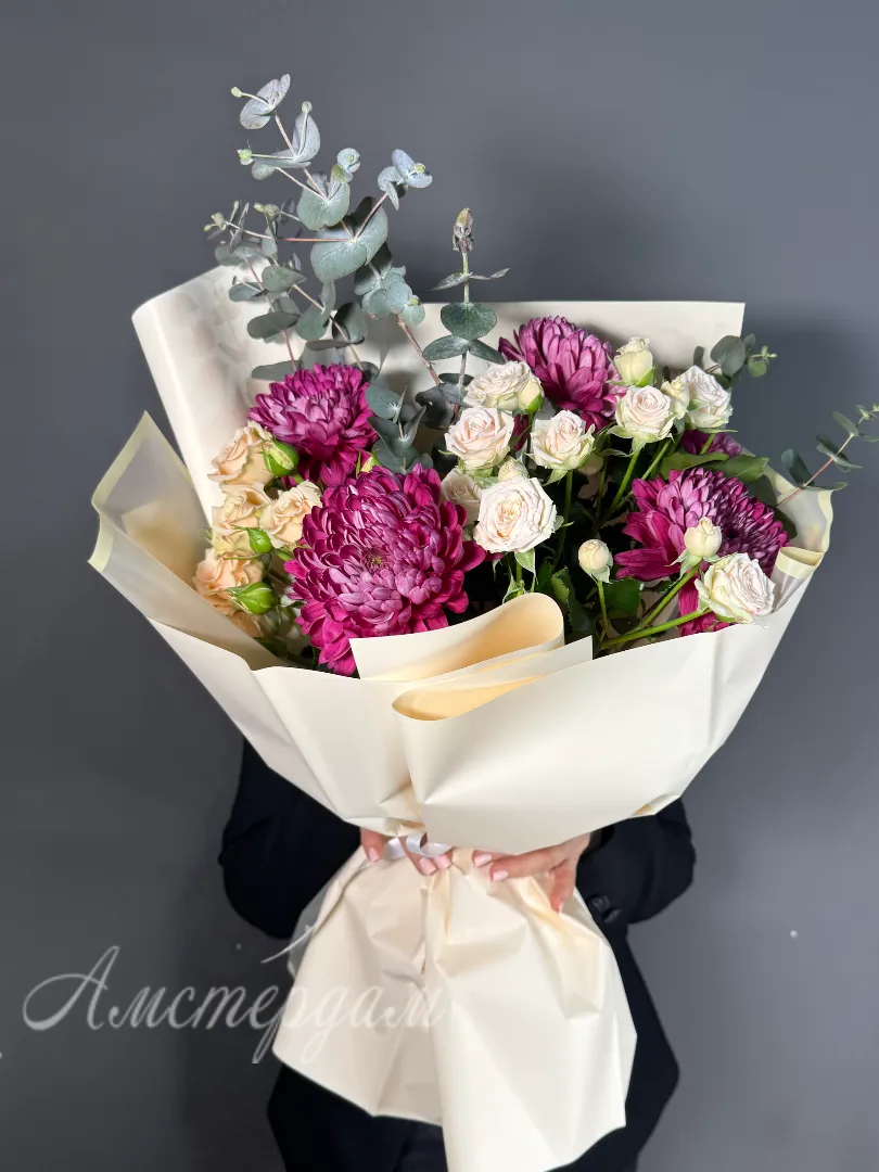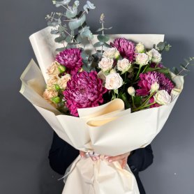 Этот изысканный букет сочетает в себе нежность кустовых роз и элегантность хризантем, создавая уникальное цветочное оформление. В составе композиции — насыщенные зеленью веточки эвкалипта, которые придают букету свежий и природный вид. Нежные лепестки кустовых роз гармонично сочетаются с крупными цветами хризантем, делая букет ярким и выразительным. Для завершения образа использована атласная лента, которая добавляет изящества. Упаковка выполнена аккуратно и стильно, что делает подарок готовым к вручению. Цветочный ансамбль подходит для различных праздников и особых случаев. Такой букет идеально подойдет для выражения любви, благодарности или поздравлений. Он станет отличным дополнением к любому декору благодаря своей гармоничной композиции. Выберите этот букет и подарите получателю минуты радости и красоты.