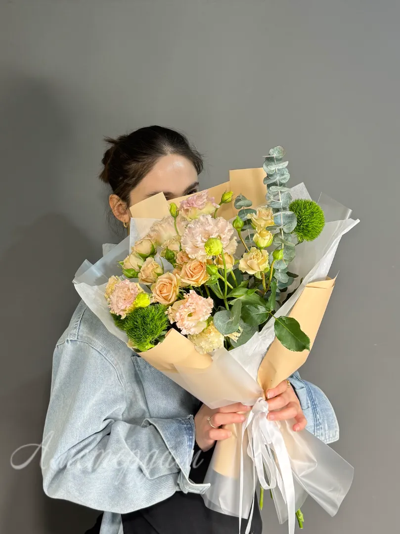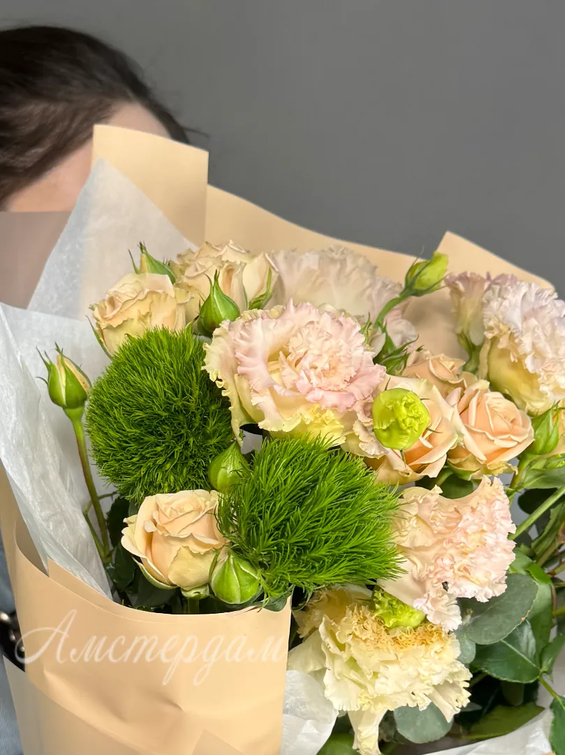 Этот красивый букет включает в себя пышную кустовую розу пионовидной формы, создающую насыщенный цветовой акцент. В дополнение к ней в композицию входят нежные цветы эустомы, добавляющие воздушности и изысканности. Гвоздики махровые придают яркую насыщенность и текстурное разнообразие. В композицию также входит гвоздика киви, которая добавляет необычный зелёный оттенок и свежесть. Для завершения образа использован эвкалипт, придающий букеты лёгкую ароматность и естественную зелень. Всё это красиво оформлено в элегантной атласной ленте, подчеркивающей изысканность подарка. Упаковка аккуратно подчеркивает красоту цветочной композиции и делает букет ещё более презентабельным. Общий ассортимент цветов и зелени создает гармоничное сочетание текстур и оттенков. Такой букет идеально подойдет для особенных случаев и подчеркнет вашу заботу и внимание. В результате получаете стильное и яркое украшение для любого торжества или приятного сюрприза.