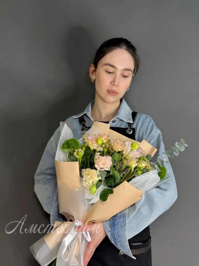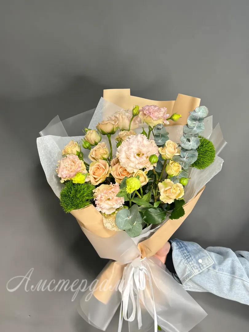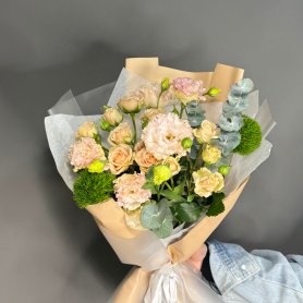 Букет с кустовой розой, эустомой и гвоздикой киви