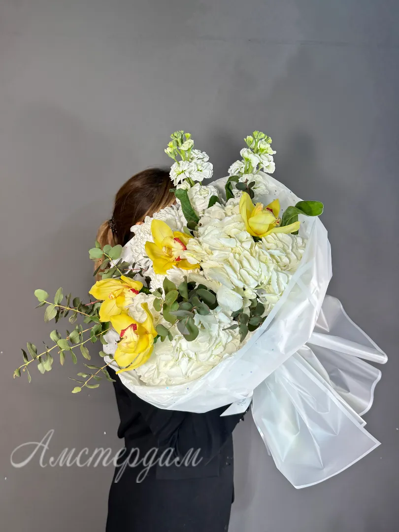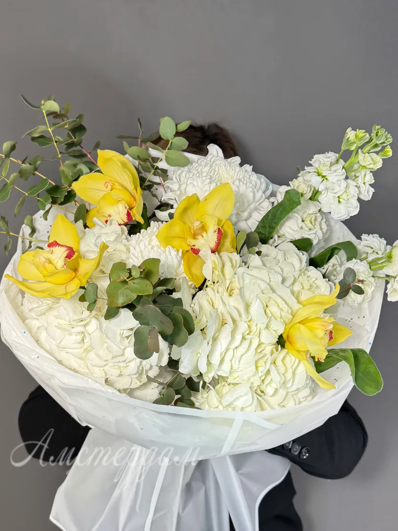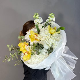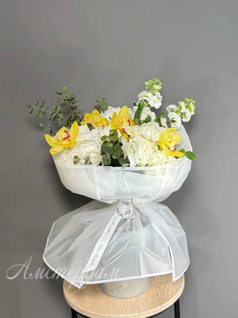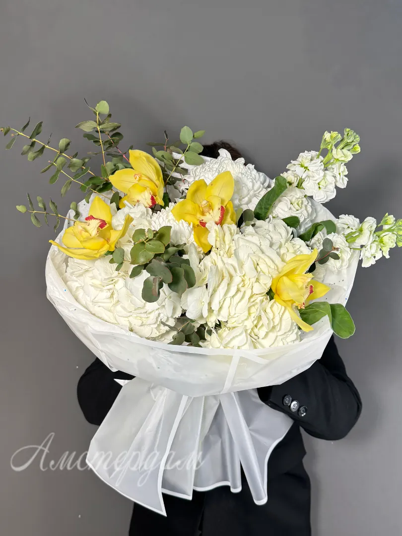 Погрузитесь в атмосферу изящества с авторским букетом, объединяющим нежность орхидей, воздушность гортензии и элегантность хризантемы. Вкусная гармония дополнена атласной лентой, стильной упаковкой и свежестью эвкалипта, создавая идеальный подарок для особого случая. Этот уникальный букет подчеркнет вашу заботу и станет ярким акцентом в любом интерьере.