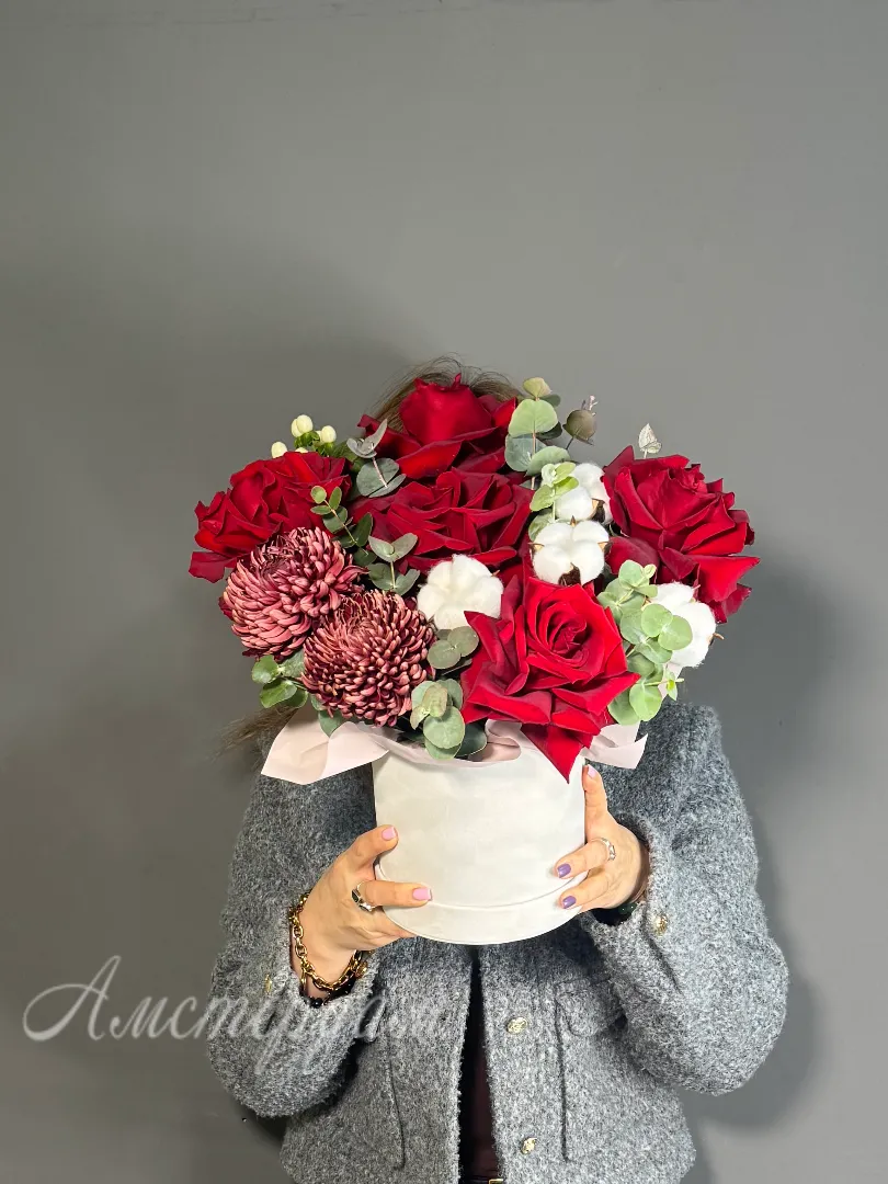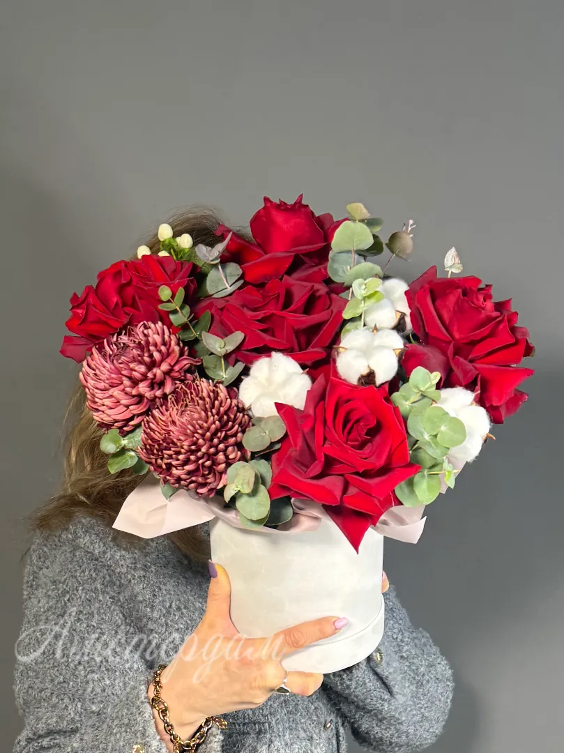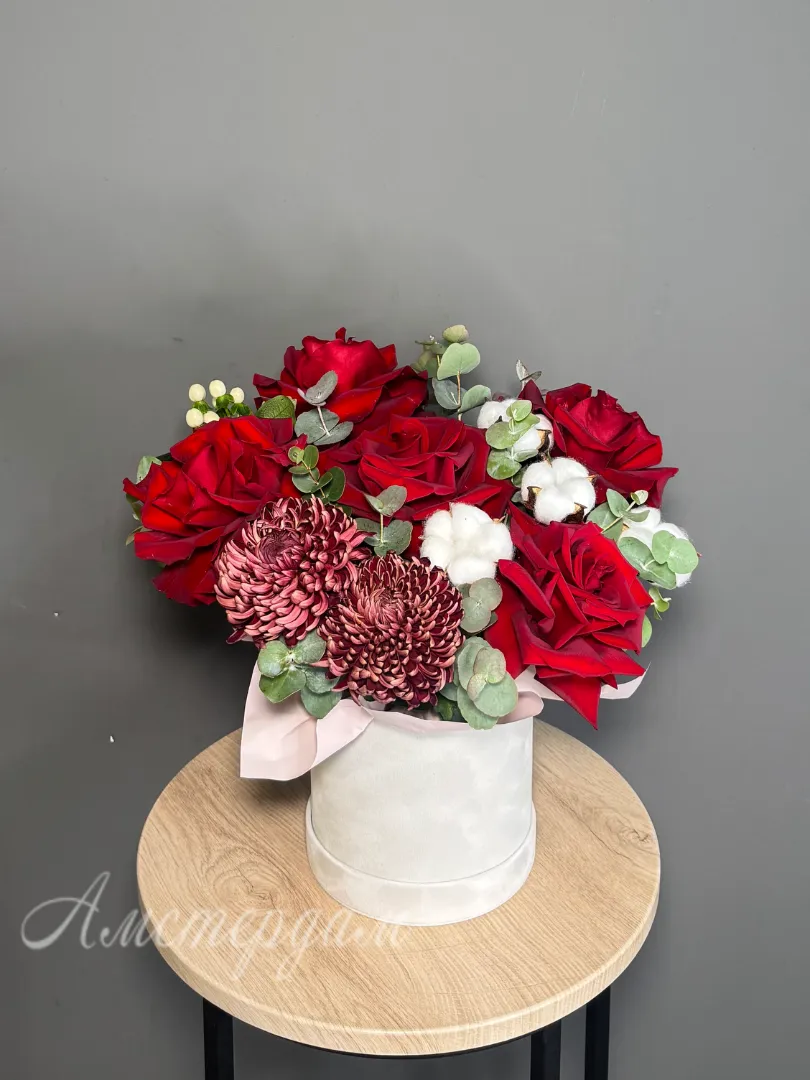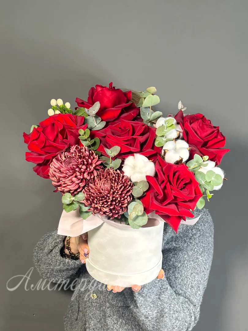 Шикарная коробка с французскими розами, хризантемой и хлопком