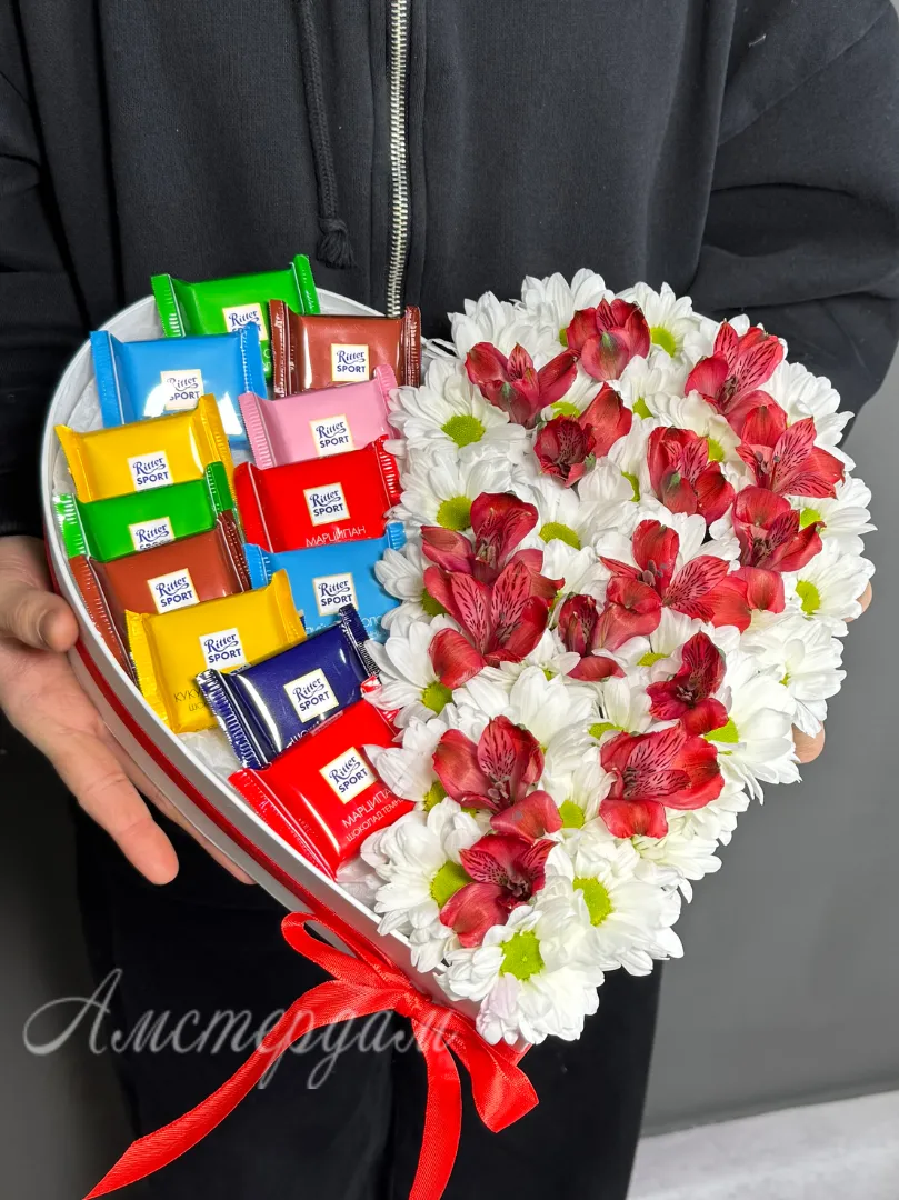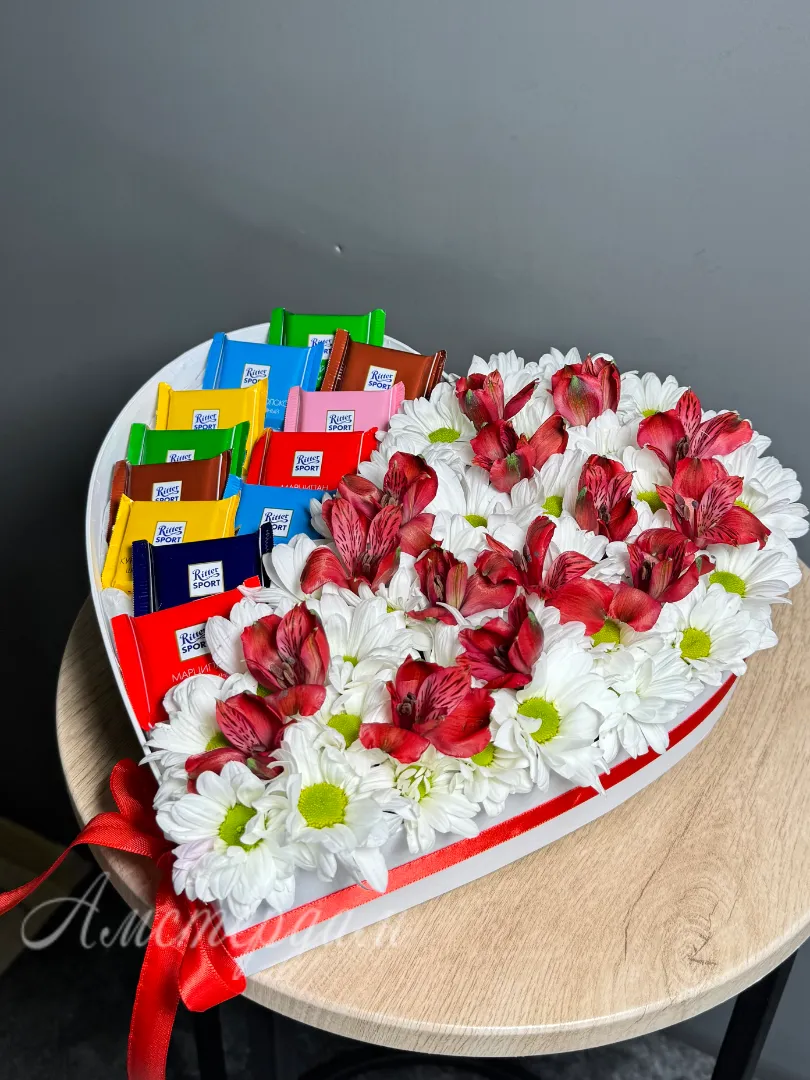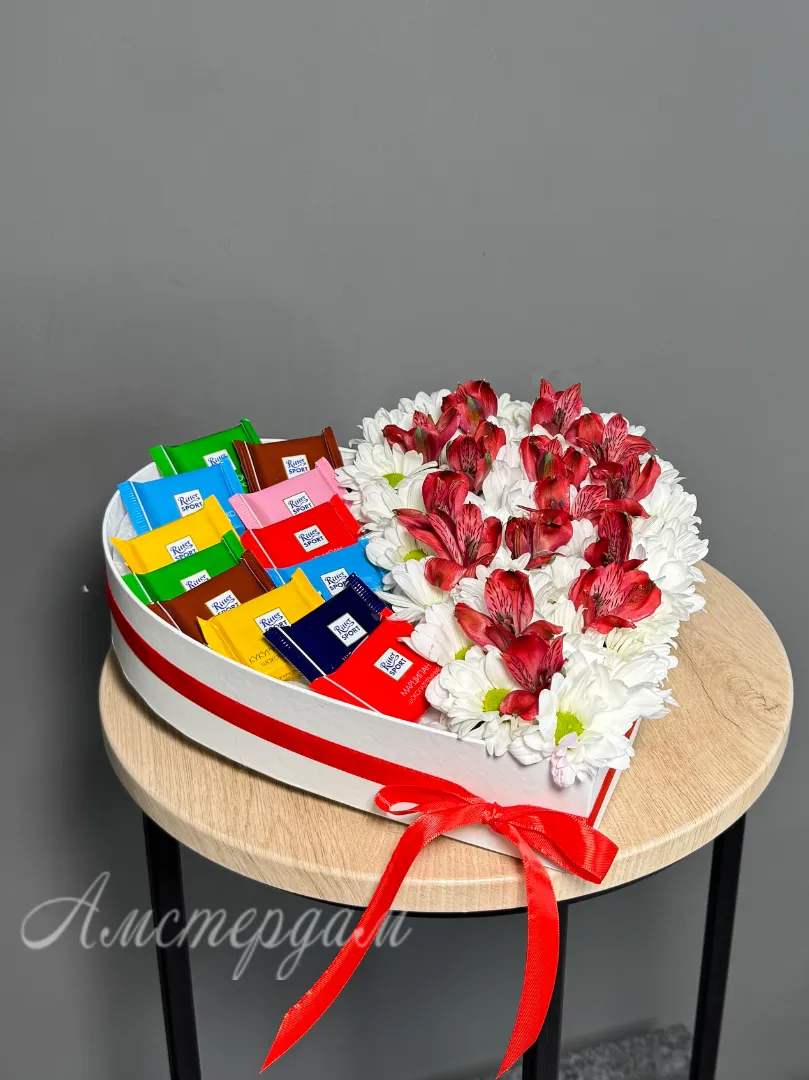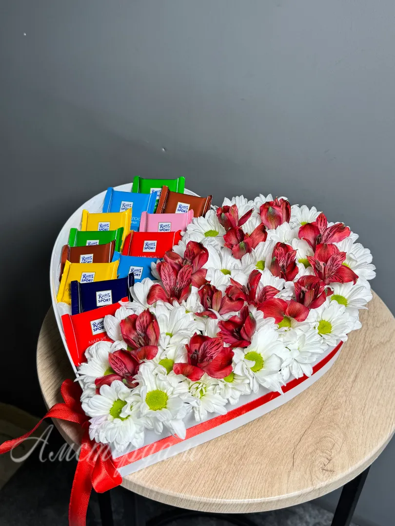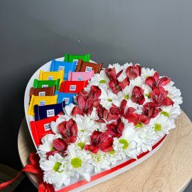 Композия сердце с шоколадом и цветами