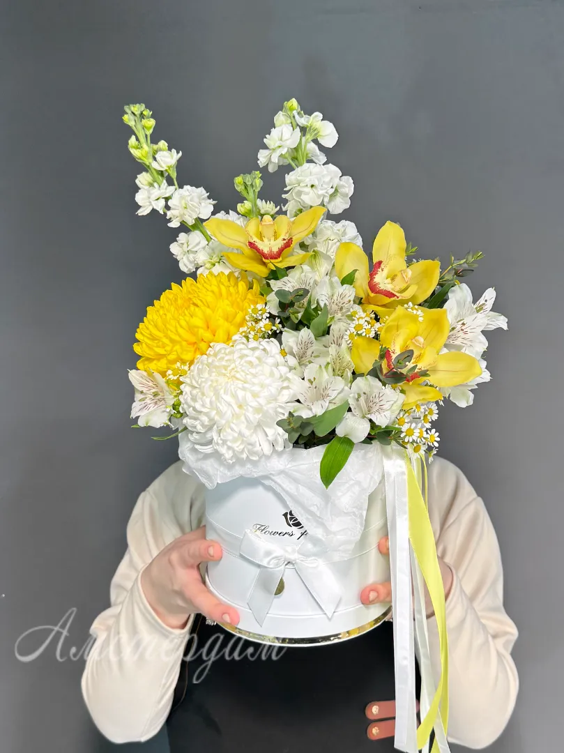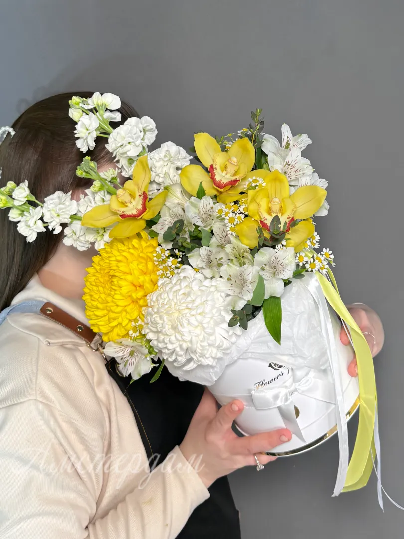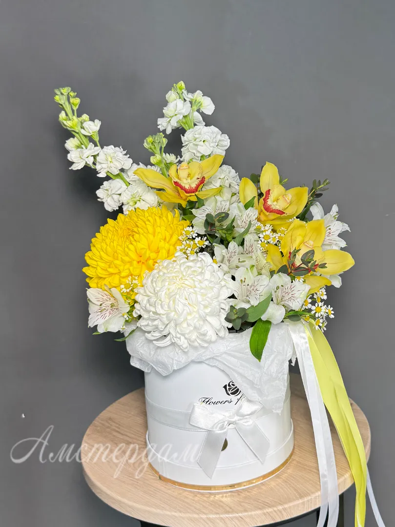 Коробка из орхидеи, матиоллы, хризантемы в бело-желтой гамме