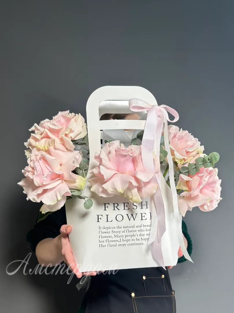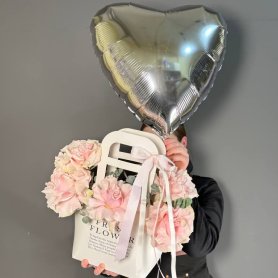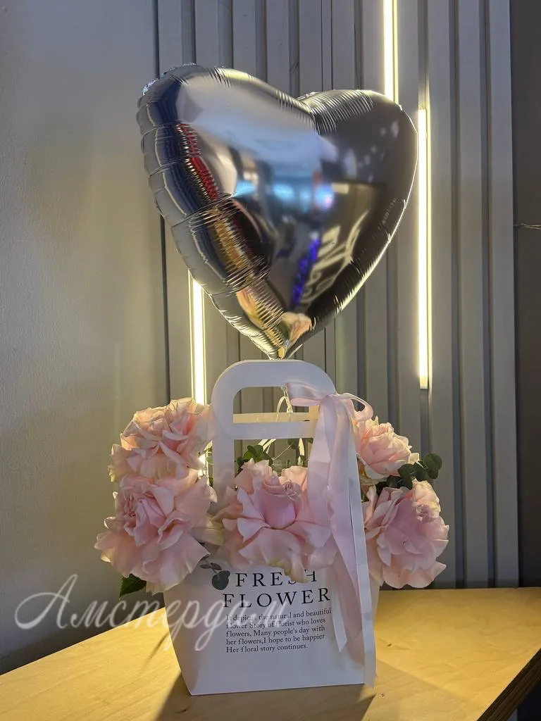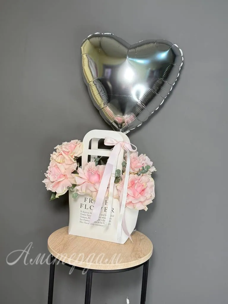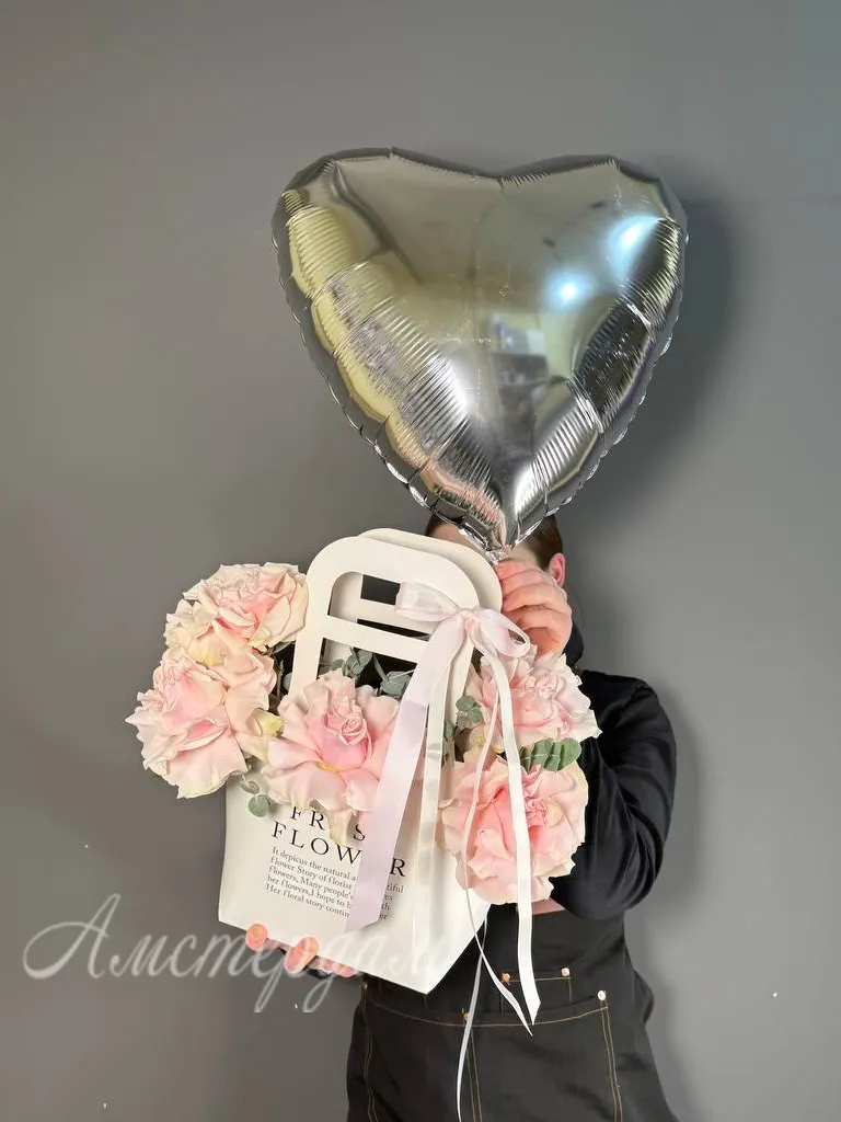 Эта изящная сумочка с французскими розами станет отличным дополнением любого образа. В её дизайне преобладают красивые французские розы, придающие изделию романтичный и утончённый вид. Особенностью модели является фольгированный шар в виде сердца, который добавляет ей яркости и праздничного настроения. В состав композиции входят атласная лента, э легкий оазис, а также декоративные элементы — эвкалипт и французская роза. Сумочка выполнена из качественных материалов, что обеспечивает ей долговечность и привлекательный внешний вид. Она отлично подходит для особых случаев, таких как свадьбы, юбилеи или романтические вечера. Благодаря комбинированию натуральных и металлических элементов, изделие выглядит элегантно и стильно. Фольгированный шар сердце символизирует любовь и тепло, делая подарок еще более значимым. Эта сумочка станет прекрасным аксессуаром и милым сувениром для близких и друзей.