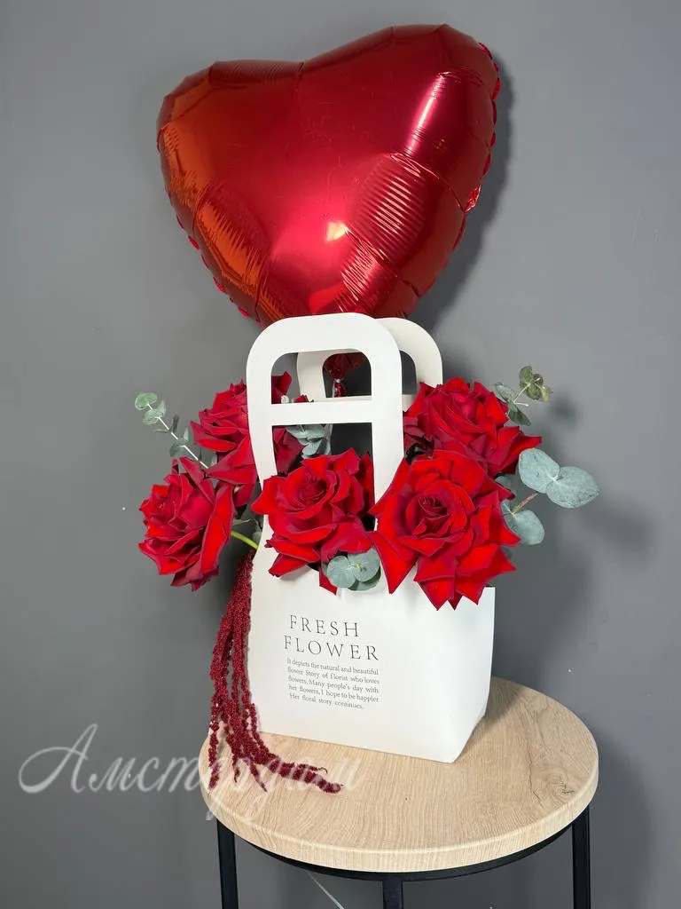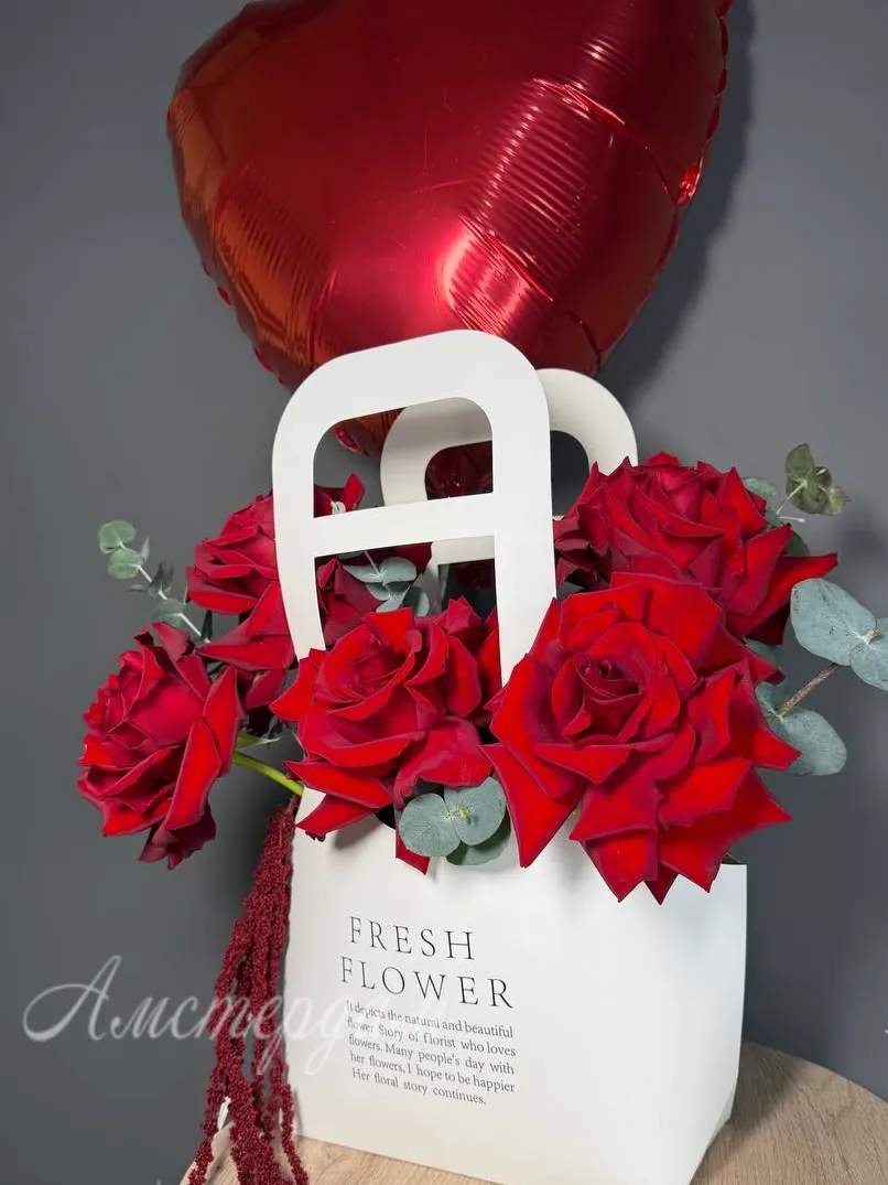 Этот изящный букет роз с французской розой станет прекрасным выражением нежных чувств и любви. В композицию вошли эксклюзивные элементы, такие как фольгированный шар с надписью «Признание в любви», добавляющий нотку праздника и волшебства. В сочетании с амарантусом, эвкалиптом и зеленью Оазис букет выглядит роскошно и эффектно. Сумочка в дизайне подчеркивает внимательность к деталям и стильность композиции. Такой подарок отлично подойдет для романтического признания или особого знака внимания. Он создает атмосферу любви и трепетных чувств, оставляя незабываемые впечатления.