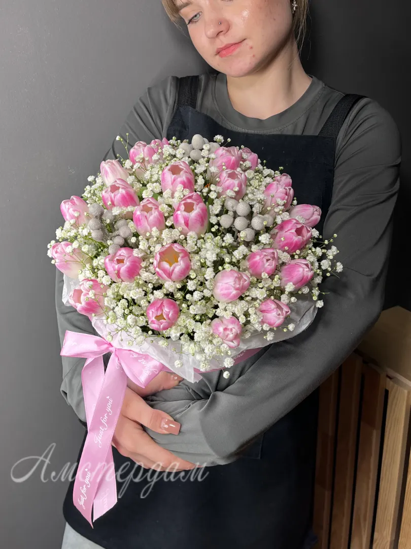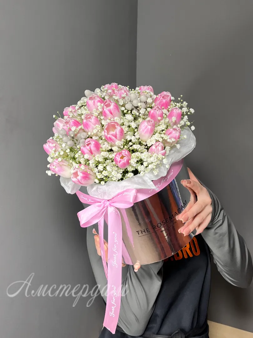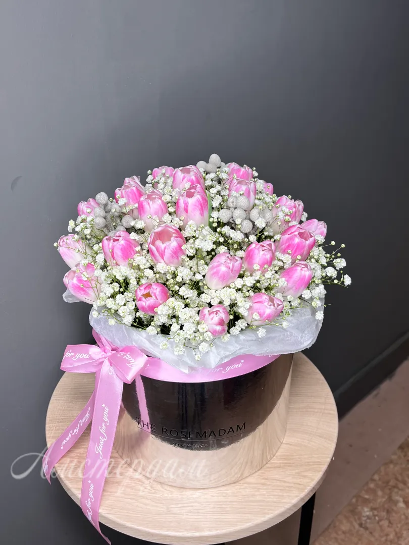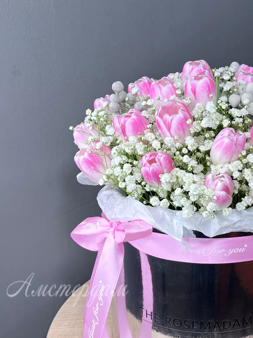 Подарите себе ощущение весенней свежести с уникальной композицией из нежно-розовых тюльпанов в красивой коробке. В составе букета — изящные тюльпаны, дополненные деликатной гипсофилой для объемности и воздушности. Особая нотка — цветы сорта Брунея и пиасфлор, создающие нежное и романтичное настроение. Каждый букет аккуратно упакован в стильную коробку, которая станет отличным подарком или украшением вашего интерьера. Натуральные цветы долго сохранят свежесть и радуют своей красотой. Этот цветочный набор — идеальный выбор для тех, кто ценит элегантность и утонченность.