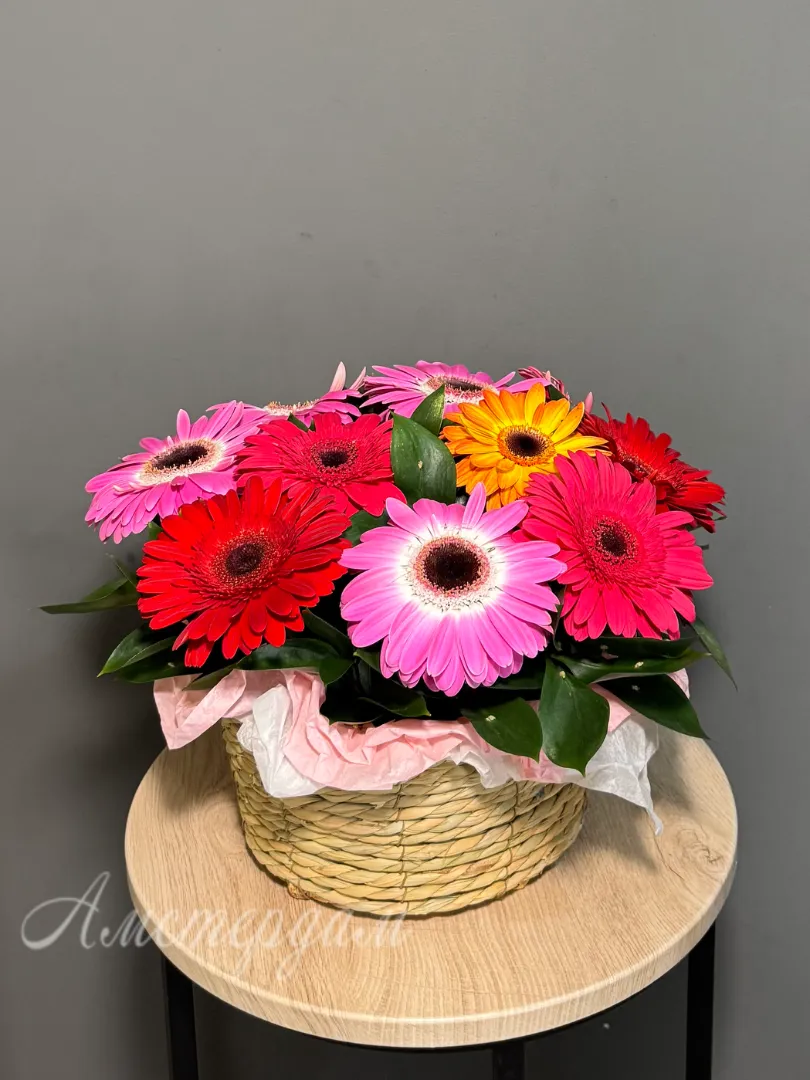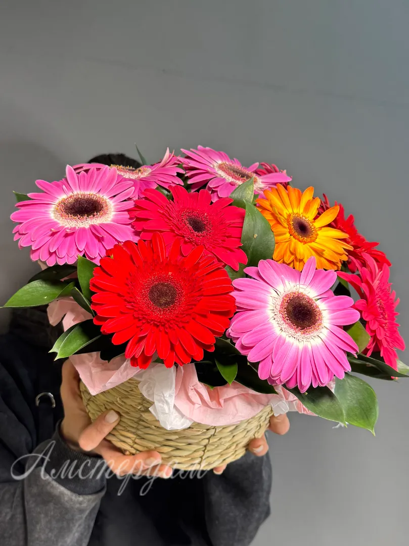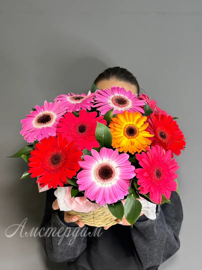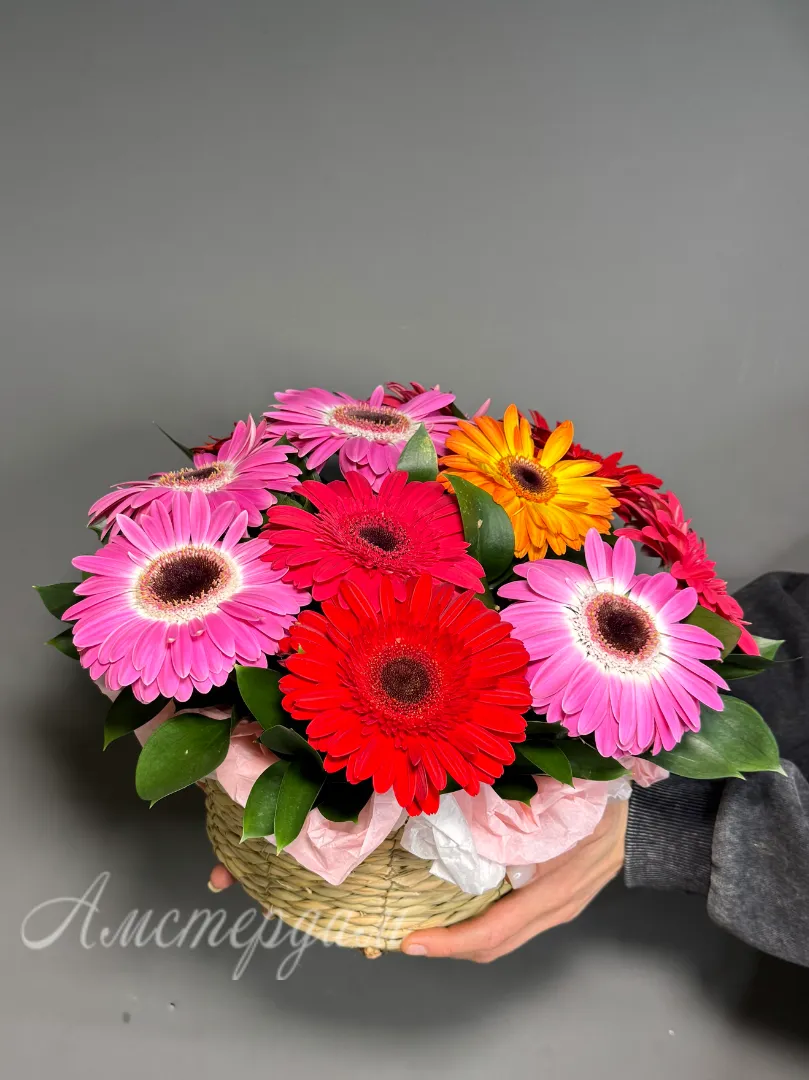 Украсьте пространство яркой композицией из 11 разноцветных гербер и рускуса, которая добавит свежести и радости в любой интерьер. Каждая корзина — это уникальное сочетание насыщенных цветов, создающее атмосферу уюта и тепла. Идеальный подарок для близких или приятное украшение для дома и офиса. Наша корзина долговечна и сохраняет свежий вид длительное время. Выберите яркие цветовые акценты и создайте настроение солнца в вашем доме!