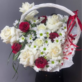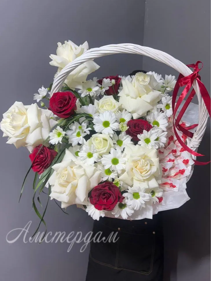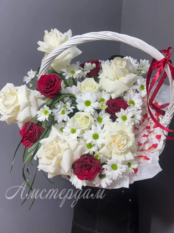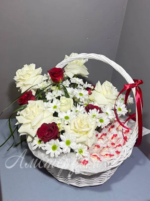 Подарите особое настроение с нашим букетом «Корзина цветов и сладостей». Внутри уютной корзины гармонично сочетаются свежие цветы: хризантема кустовая, французская роза, классическая роза и аспидистра, создающие яркий и элегантный букет. В композицию добавлены декоративные ленточки и оазис, что обеспечивает долговечность и красивый внешний вид. Особое украшение – сладости Рафаэлло, которые приятно удивят и порадуют любого получателя. Эта корзина станет отличным подарком для любого повода: от праздника до приятного жеста внимания. Качественные цветы и оригинальный дизайн создают ощущение роскоши и уюта. Тщательно подобранные компоненты подчеркивают безупречный вкус дарителя. Уникальность комплекса делает ваш подарок запоминающимся и особенным. Выберите «Букет Корзина цветов и сладостей» и подарите радость, которую долго не забудут.