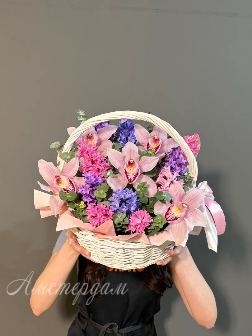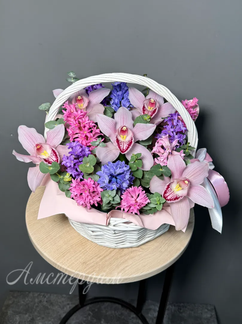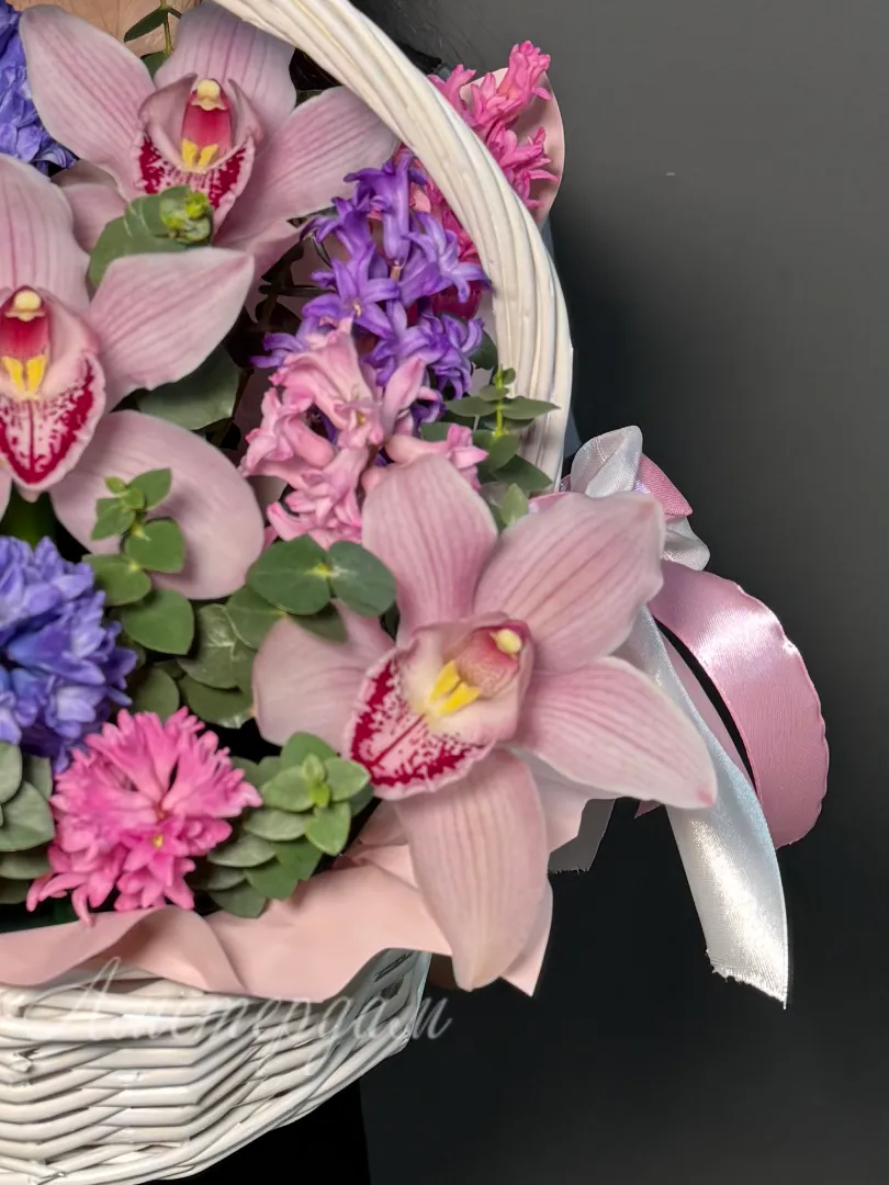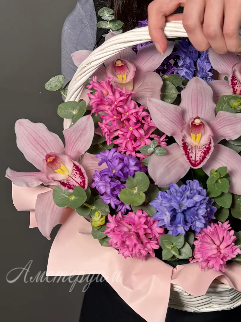 Эта изысканная корзина представляет собой настоящее произведение флористического искусства, где нежность гиацинтов встречается с экзотической красотой орхидей. Каждая гиацинтовая гроздь излучает весенний аромат, наполняя пространство свежестью и лёгкостью. Бархатистые лепестки орхидей добавляют композиции утончённость и роскошь, создавая пленительный контраст. Зелёные листья эвкалипта служат элегантным фоном, подчёркивая яркость и многогранность основных цветов. Плетеная корзина, словно обрамляющая драгоценности, придаёт букету особую натуральность и теплоту. Благодаря флористической губке, цветы остаются свежими и полными жизни в течение длительного времени. Этот букет станет идеальным подарком, выражающим глубокие чувства и восхищение. Он привнесет в любой интерьер атмосферу утонченной элегантности и природной красоты.