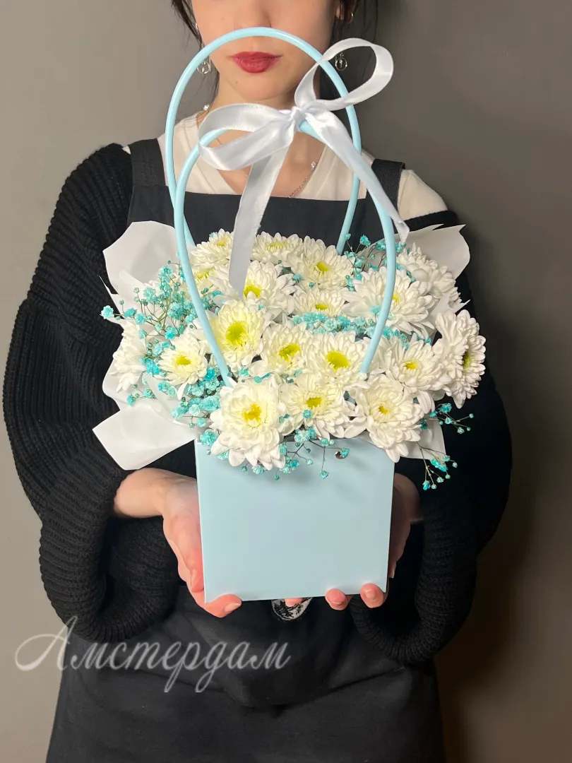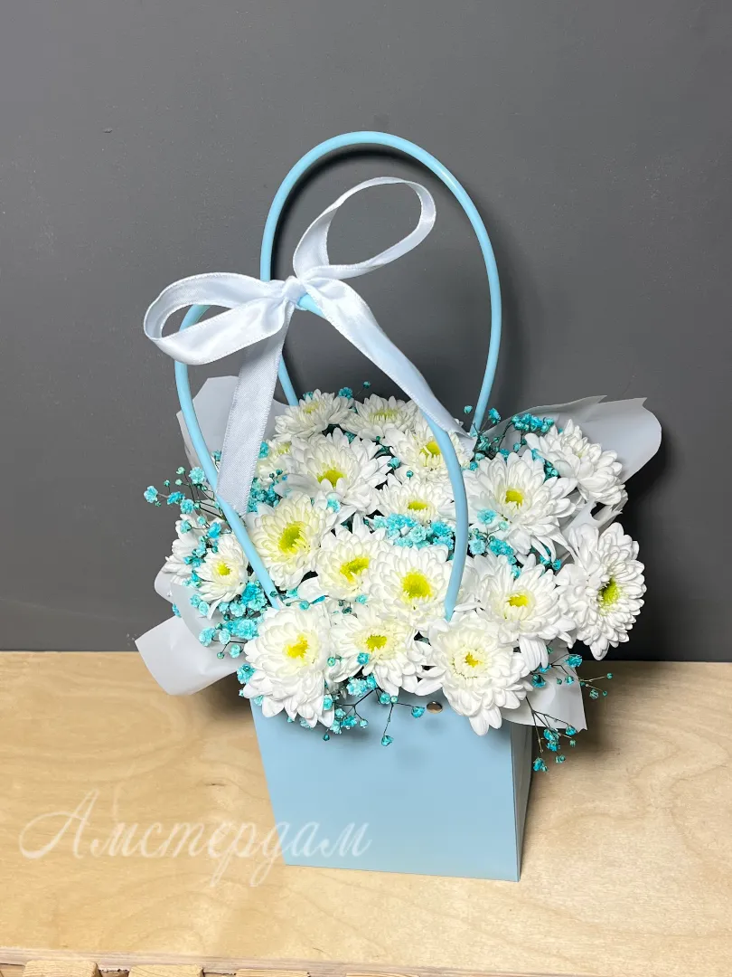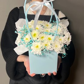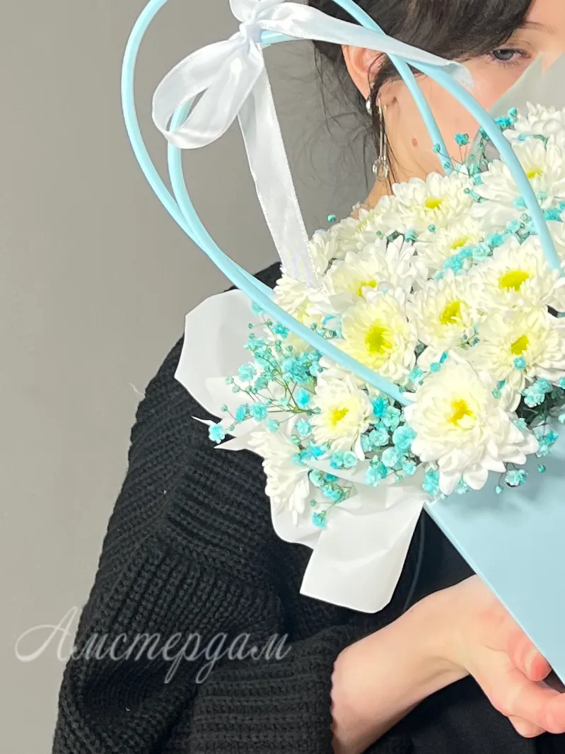 Этот изысканный букет «Сумочка» украшен нежной гипсофилой, создавая воздушную и легкую атмосферу. В его композицию входят кустовые хризантемы, добавляя объем и яркость. Завершает ансамбль стильная «Сумочка» и ароматная пиафлорь, придавая букету особую элегантность.
