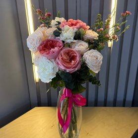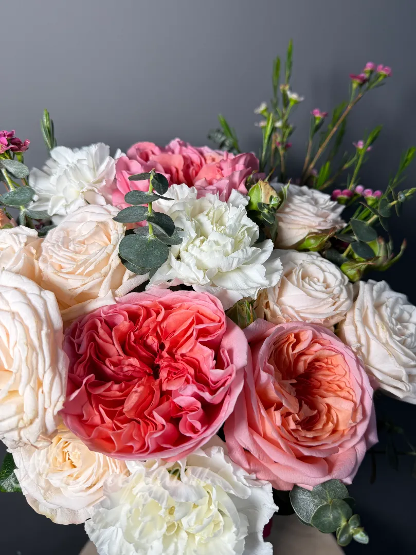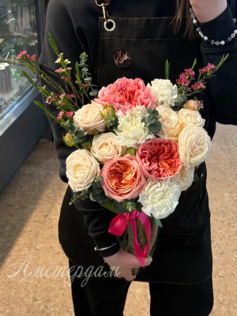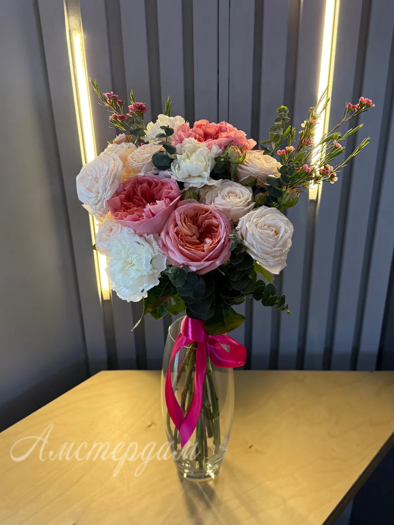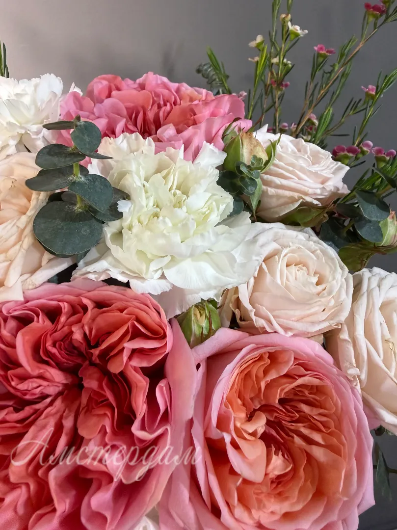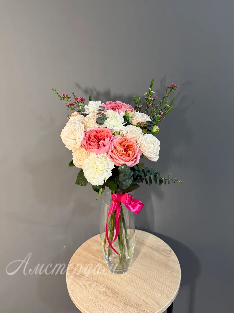 Изысканная ваза из прозрачного стекла станет элегантной основой для этого роскошного букета, призванного украсить ваш стол. Нежные пионовидные розы, будто раскрывшиеся бутоны, источают тонкий аромат и несут в себе дыхание весны. К ним в компанию добавляются кустовые пионовидные розы, создавая объем и добавляя букету многослойности. Хрупкие усики хамелациума добавляют букету легкость и воздушность, делая его еще более утонченным. Серебристый эвкалипт с его узнаваемым ароматом прекрасно дополняет цветочные композиции, придавая им свежесть и глубину. Яркие диантусы, или гвоздики, добавляют игривости и текстуры, оживляя общую картину. Этот букет – настоящее воплощение элегантности и природной красоты, способное преобразить любое пространство. Разместите его в центре стола, и он моментально станет притягательным элементом вашего интерьера.