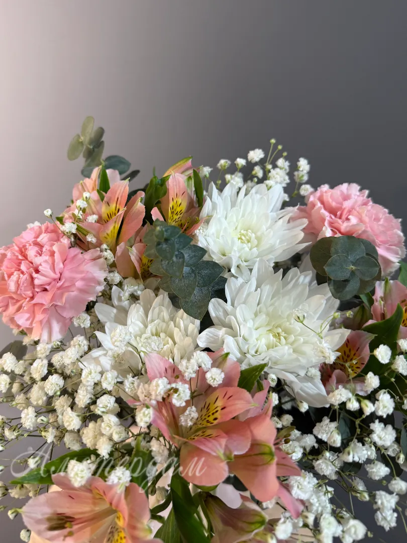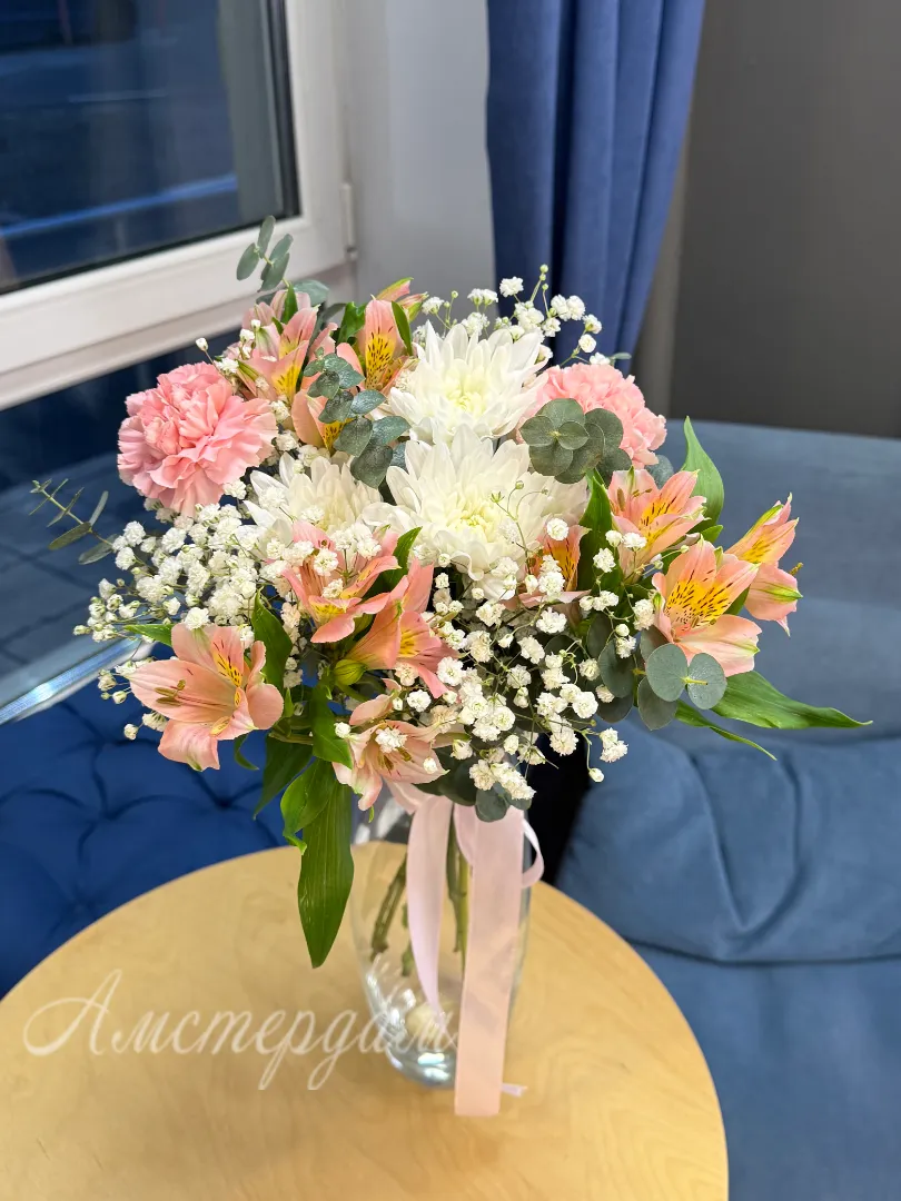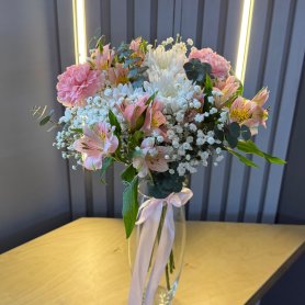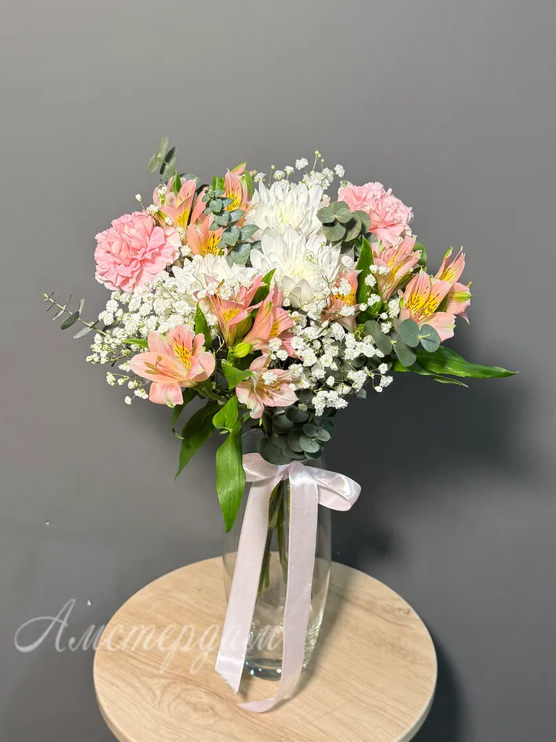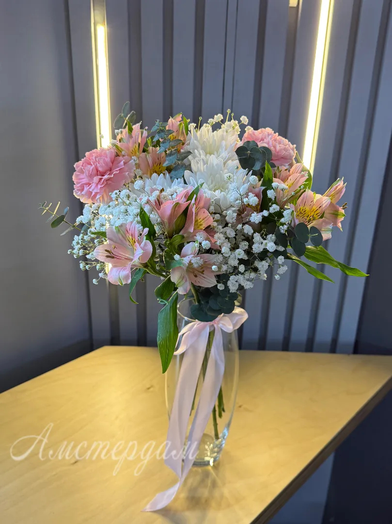Подарите нежность и изящество с эксклюзивной композицией «Пинк»! Эта изысканная ваза, наполненная воздушной гипсофилой, нежной альстромерией, элегантным диантусом и яркой кустовой хризантемой, создаст атмосферу уюта и свежести. Зеленые ветви эвкалипта добавят композиции природной красоты и утонченности. «Пинк» - это идеальный выбор для выражения самых искренних чувств и создания незабываемых моментов. Этот букет станет прекрасным дополнением к любому интерьеру или особенным подарком, который запомнится надолго.