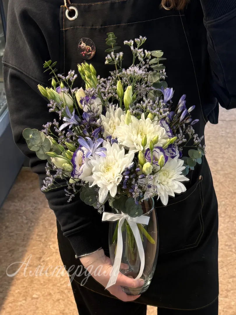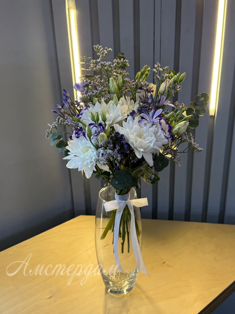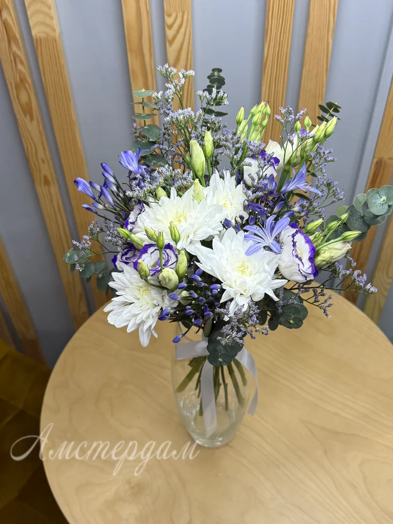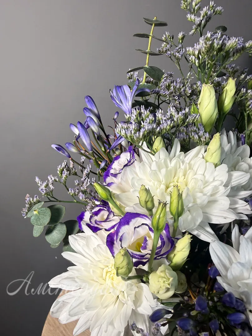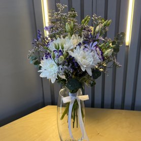 Этот элегантный букет в стеклянной вазе станет изысканным украшением вашего стола. Нежные соцветия агапантуса, словно небесные фонарики, притягивают взгляд своей утонченной красотой. Воздушные веточки эвкалипта добавляют композиции свежести и тонкий аромат. Лавандовые облака лимониума создают фон, подчеркивая изящество основных цветов. Пушистые головки кустовой хризантемы придают букету объем и нежность. Белые и сиреневые оттенки эустомы элегантно гармонируют с остальными цветами. Стеклянная ваза идеально подчеркивает хрупкость и чистоту композиции. Этот букет – воплощение природной элегантности и умиротворения. Он привнесет в ваш дом ощущение спокойствия и изысканности.