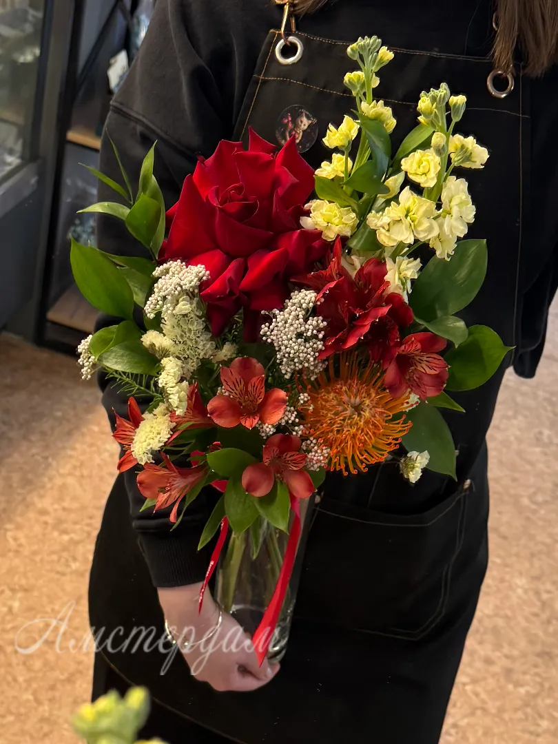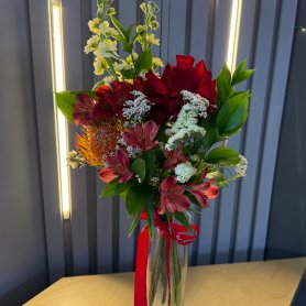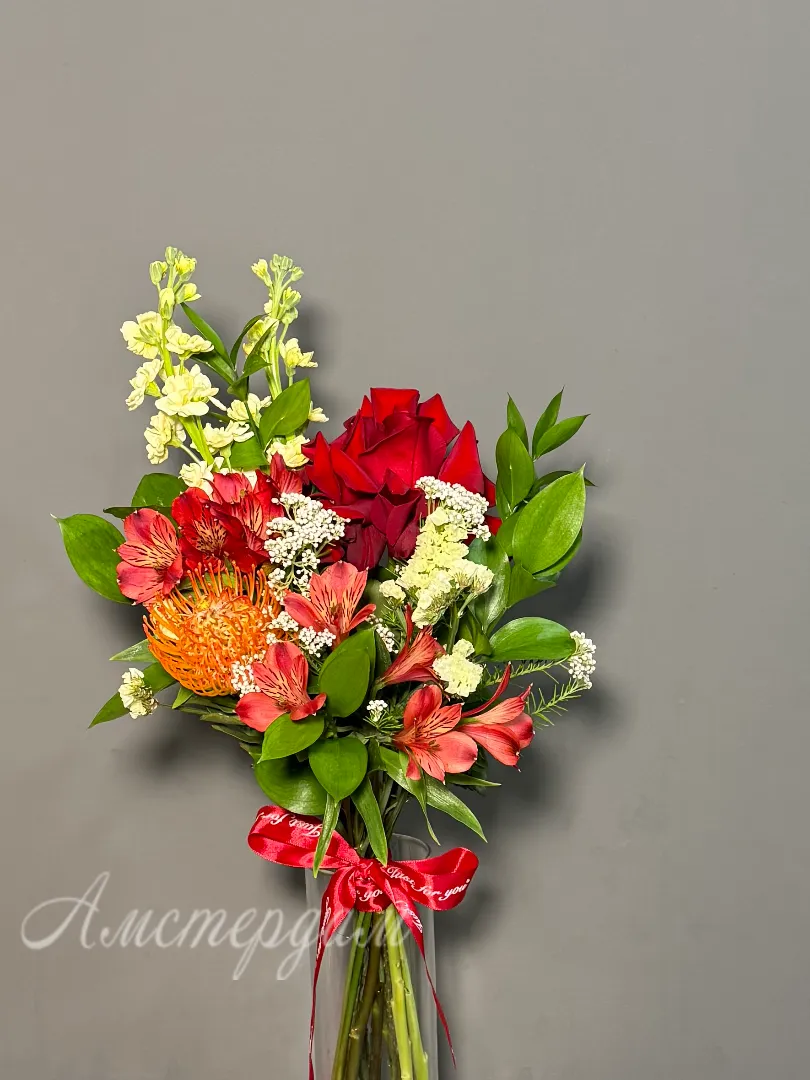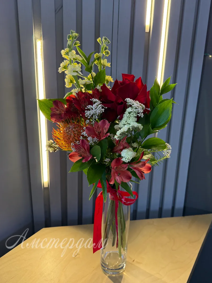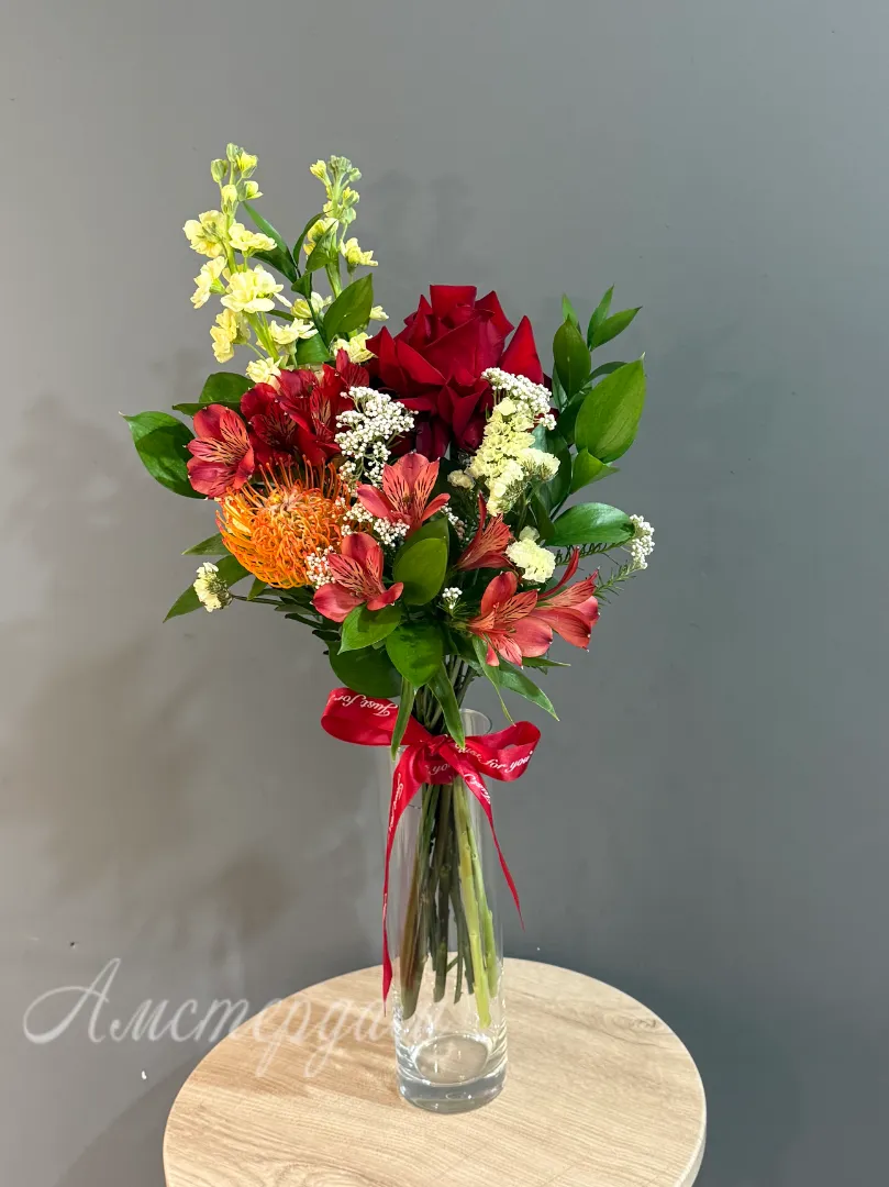 Ваза на стол «Экзотика» — это воплощение вашей страсти к необычному и прекрасному. Изящная стеклянная ваза служит идеальным фоном для этого буйства красок и форм. Высокая маттиола придает композиции вертикальную динамику, а нежная статица добавляет воздушности и объема. Зелень рускуса создает природную основу, подчеркивая яркость цветов. Яркие альстромерии привносят солнечную энергию, а утонченная французская роза символизирует изысканность. Озатамнус добавляет текстурный акцент, делая каждый букет неповторимым. «Экзотика» - это не просто ваза, это произведение искусства, способное преобразить любое пространство. Этот букет станет изысканным подарком или роскошным украшением вашего интерьера, наполняя его ароматом и красотой.