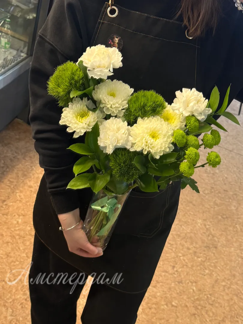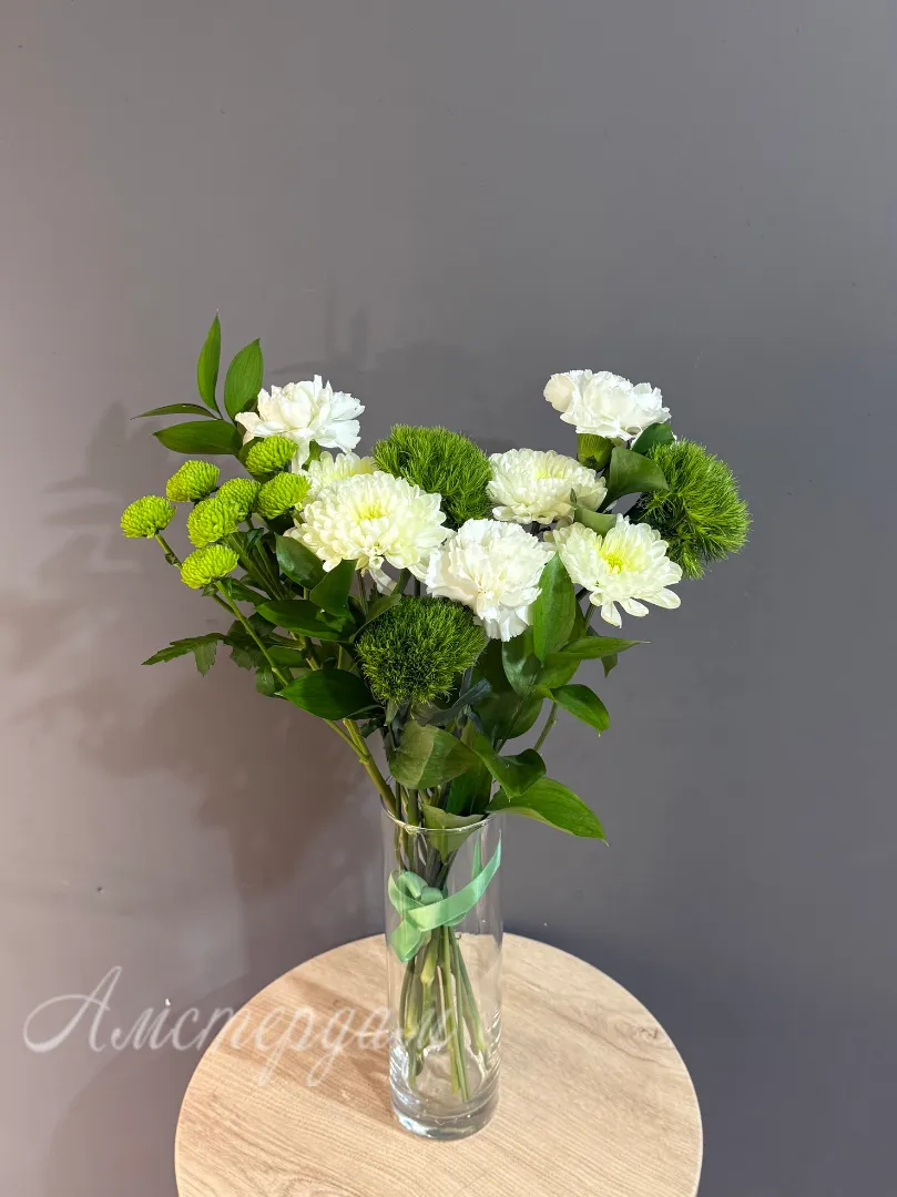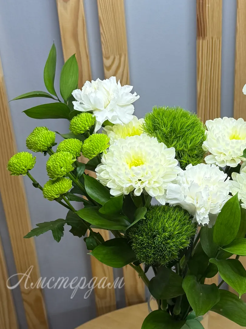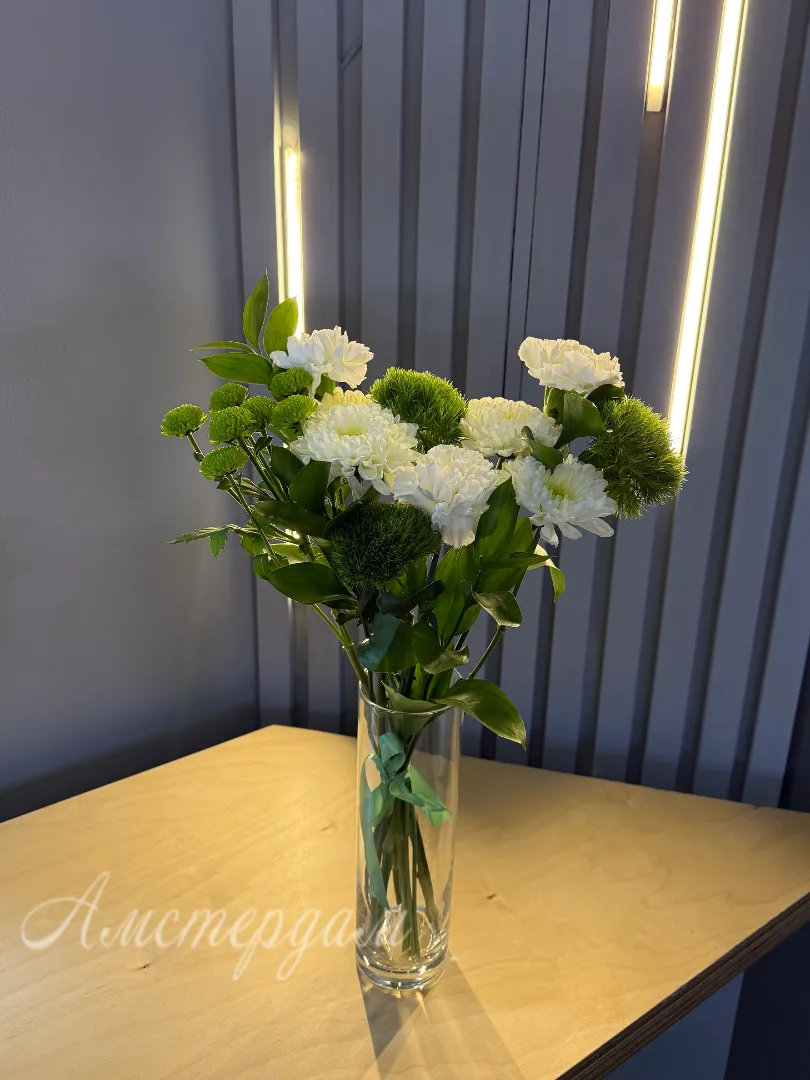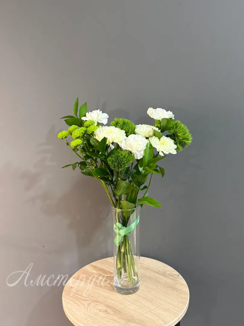 Представляем вам эксклюзивную композицию в вазе «Киви» – настоящее произведение искусства от наших флористов. Этот букет создан, чтобы впечатлять и дарить яркие эмоции. Вам не придется искать подходящую вазу – она уже в комплекте, элегантная и прозрачная, идеально подчеркивающая красоту цветов. Зелень рускуса придает букету природную свежесть и объем. Изящные темно-зеленые сантрини добавляют композиции утонченности. Пышные кустовые хризантемы создают основу букета, наполняя его текстурой и цветом. Главный акцент – это уникальные гвоздики сорта «Киви», чьи нежные оттенки напоминают сочный одноименный фрукт. Диантус, или садовая гвоздика, дополняет композицию своим очарованием и тонким ароматом. «Киви» – это идеальный выбор для тех, кто ценит оригинальность и хочет добавить в свой интерьер нотку экзотики и жизнерадостности.