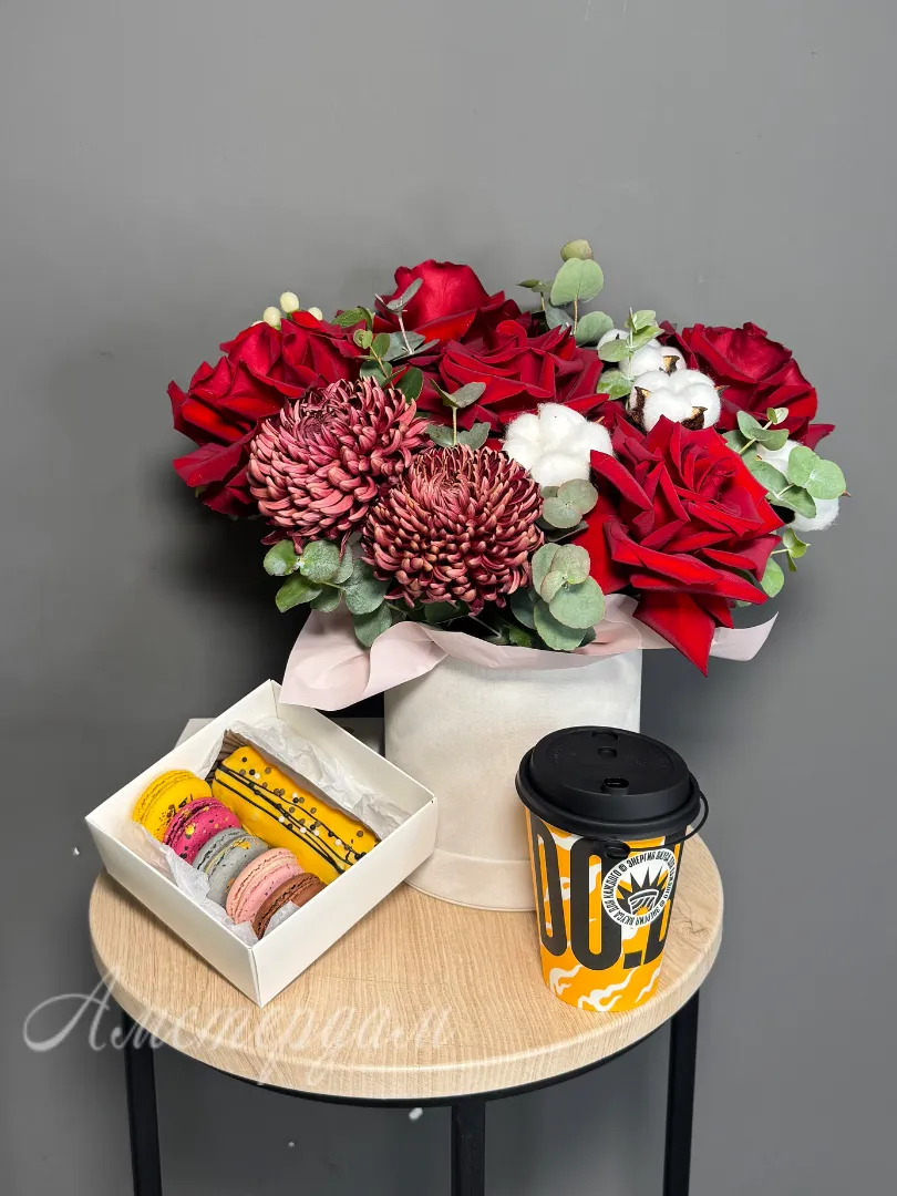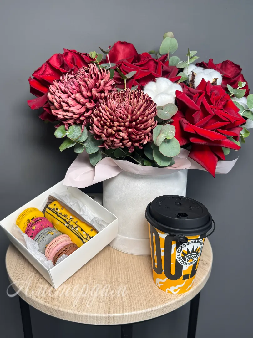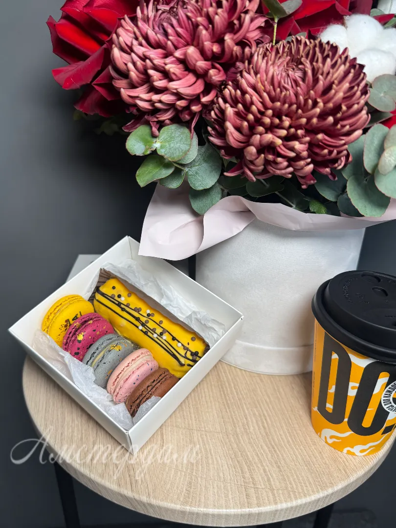 Шикарный набор из коробки цветов, макаронсы, эклер и капучино