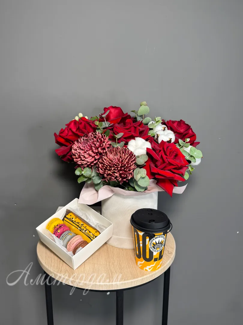 Шикарный подарочный набор включает в себя изысканный букет цветов: гиперикум, эвкалипт, хлопок, хризантему одноголовую и французскую розу. В комплект также входит коробка с крышкой, которая придает подарку особый шарм. Наслаждайтесь вкусными макаронами и эклерами с манго-маракуйей, а также свежим капучино объемом 300 мл. Все элементы аккуратно подобраны для создания элегантного и роскошного подарка. Этот набор станет прекрасным выражением ваших чувств и украсит любой праздник.