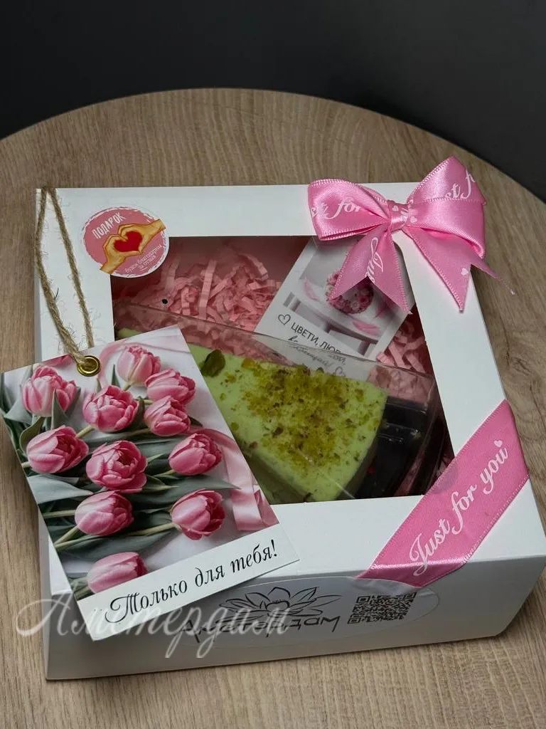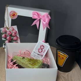 Подарочный сладкий набор к 8 Марта — это идеальный подарок для ценительниц вкусных десертов и ароматного кофе. В набор входит изысканная открытка и атласная лента, придающие подарку особую элегантность. Внутри надежно размещены насыщенный кофе капучино и нежный чизкейк с фисташками, которые приятно удивят любую именинницу. Наполнитель и стильная коробка с крышкой завершают презентабельный вид подарка. Такой набор подарит приятные моменты наслаждения и создаст праздничное настроение. Он прекрасно подойдет для поздравления любимых женщин и подчеркнет вашу заботу и внимание.
