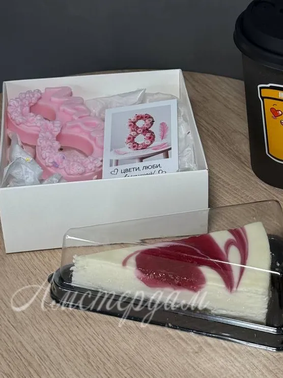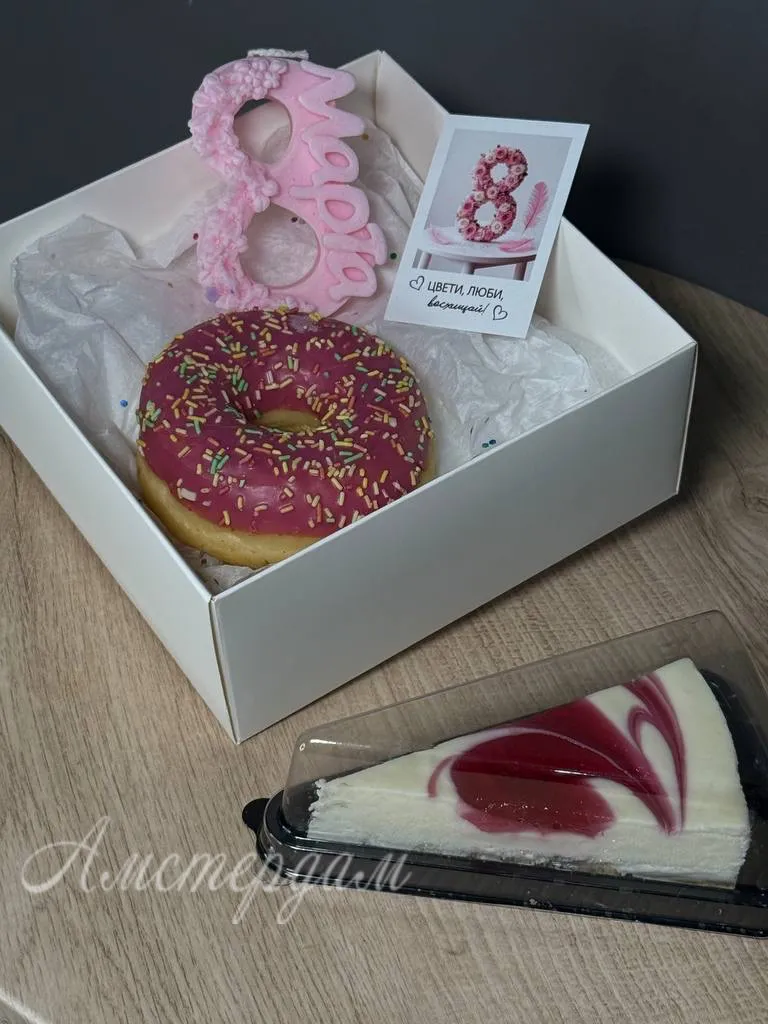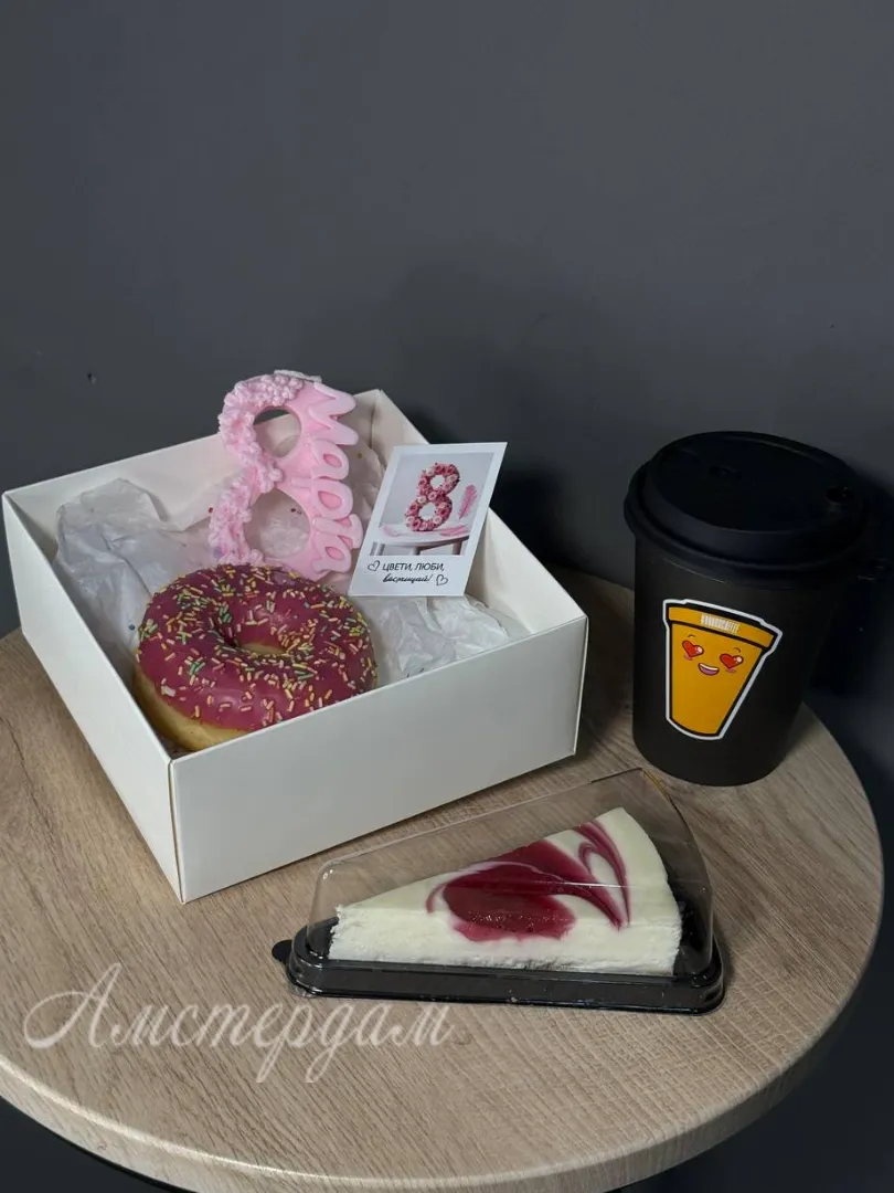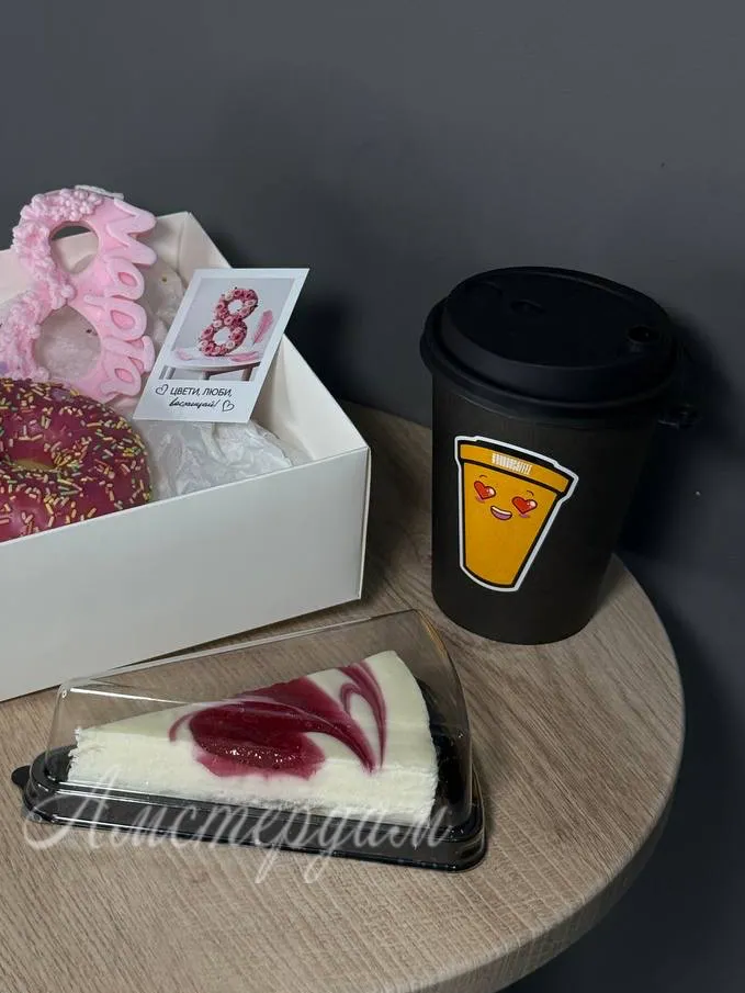 Подарочный сладкий набор с кофе и сладостями идеально подойдет для праздничного настроения. В комплект входит ароматный капучино, вкусный чизкейк, пончик с малиновой глазурью и свечка «8 марта». Все элементы красиво оформлены в коробке с крышкой, украшены атласной лентой и дополнены открыткой. Такой набор станет отличным подарком для любимых женщин и близких в любой праздник.
