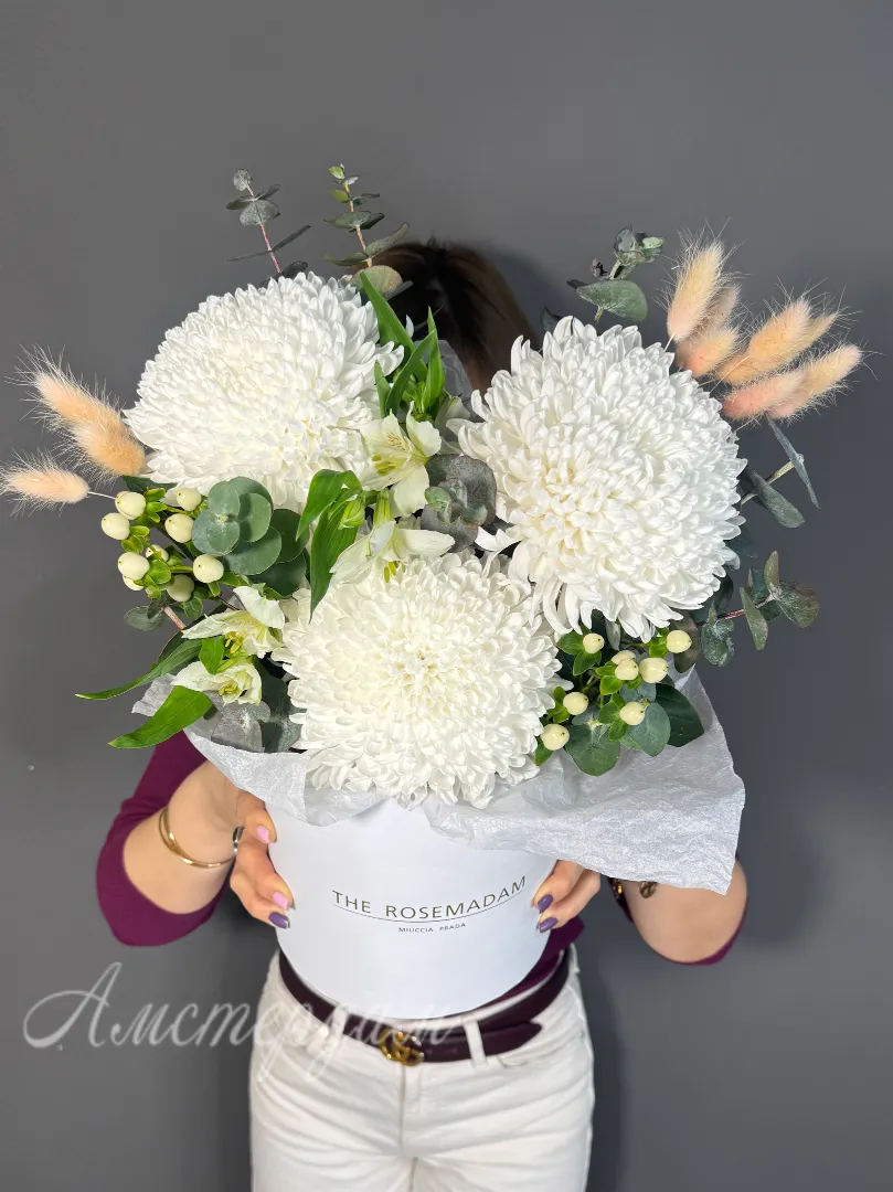 Этот красивая композиция в коробке сочетает изысканность хризантемы и элегантность альстромерии, подчеркнутые свежестью эвкалипта и гиперикума. Лагурусы добавляют нежности и объема, создавая гармоничный компоновочный акцент. В сочетании с оазисом и аккуратной упаковкой этот букет станет прекрасным подарком и украшением любого интерьера.
