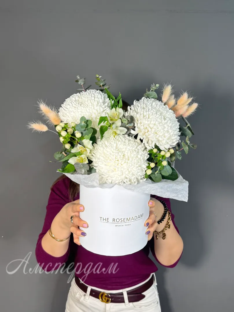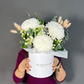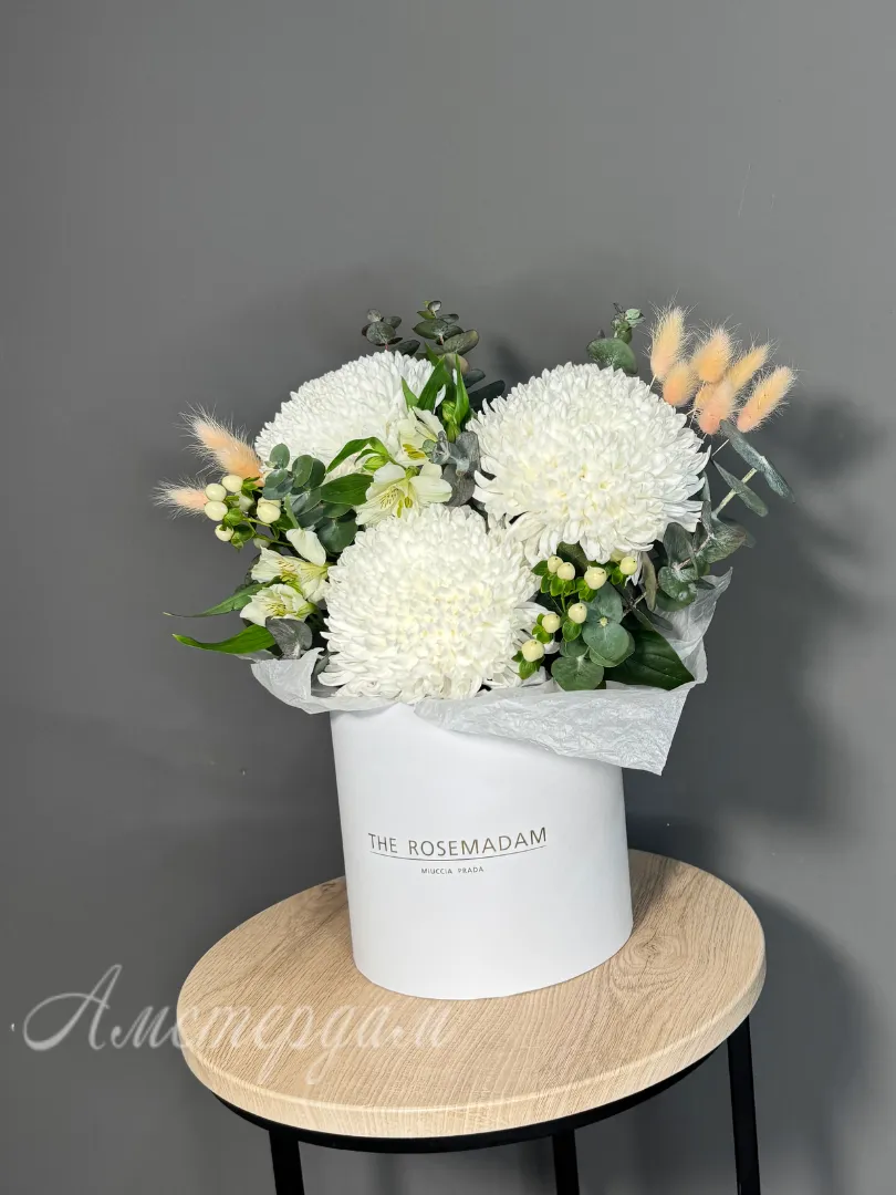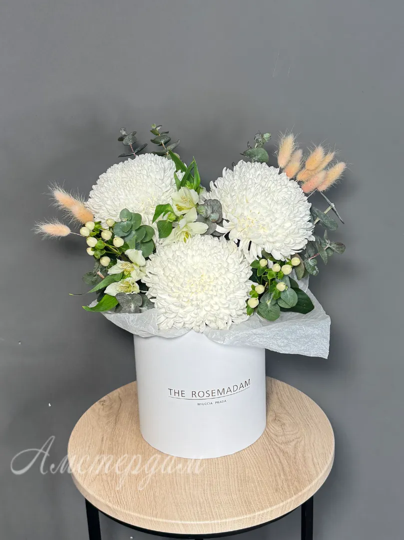 Коробка с хризантемой, эвкалиптом, гиперикум и лагурусом