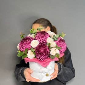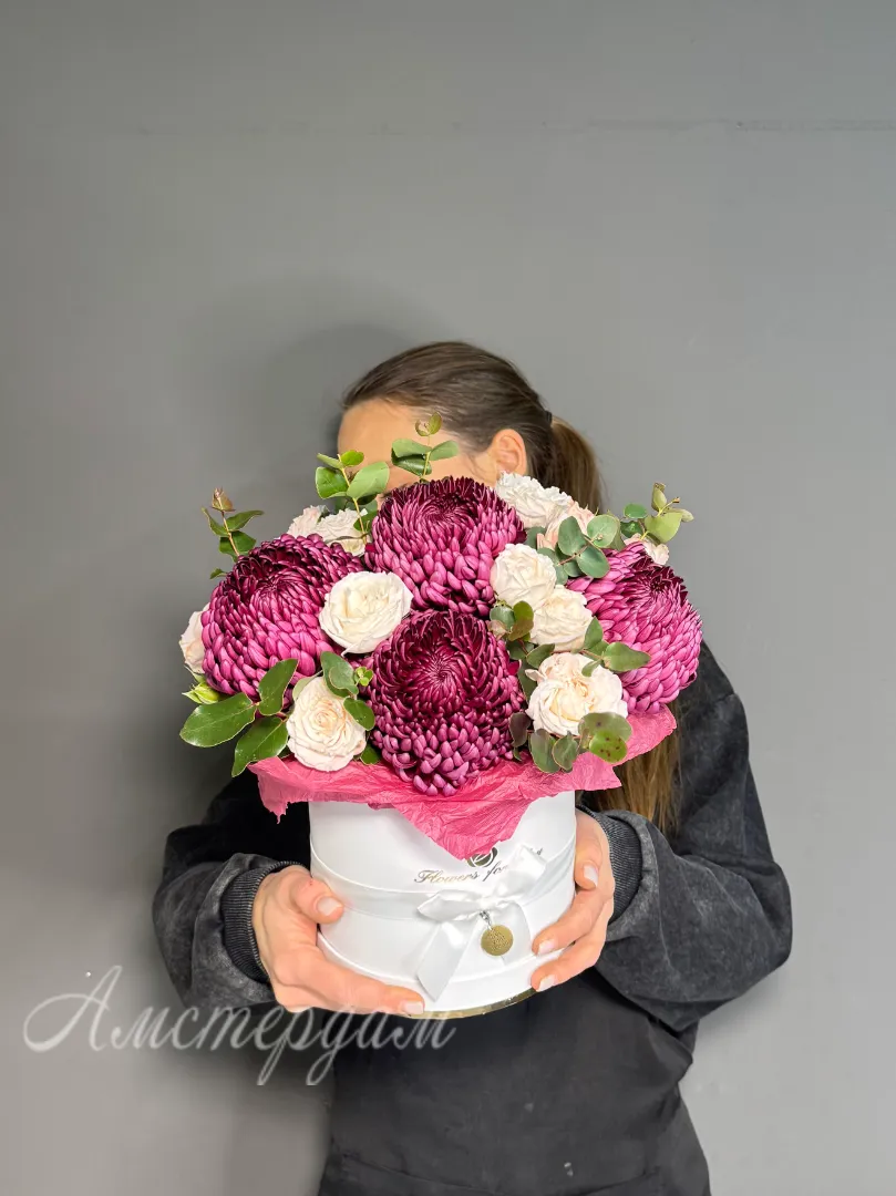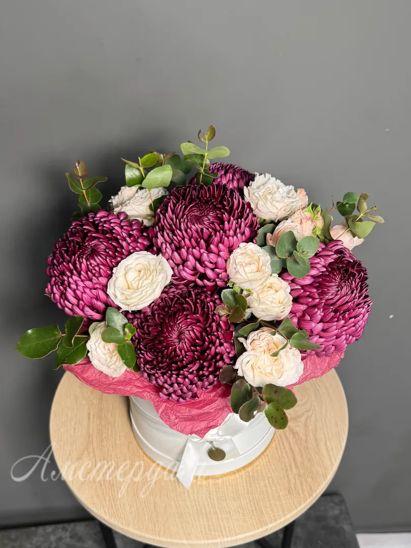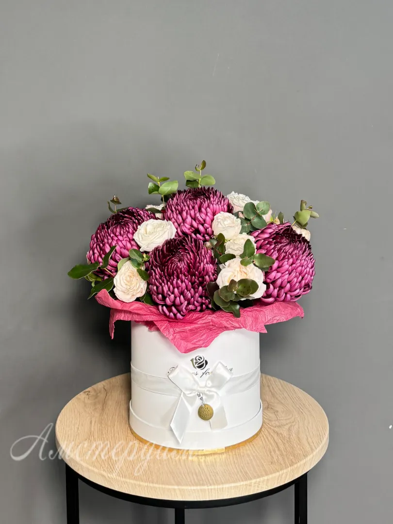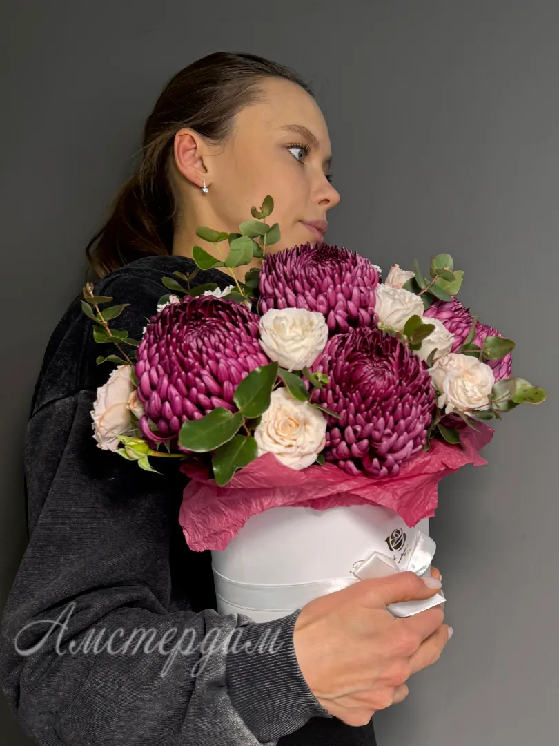 Эта изысканная коробка с букетом — отличный способ порадовать близкого человека или украсить ваш дом. Внутри вас ждут роскошные бигуди-хризантемы и изящные кустовые розы, создающие атмосферу тепла и уюта. Элегантное сочетание цветов дополняет аромат эвкалипта и зелень оазиса, придающие букету свежесть и живость. Эта композиция идеально подойдет для подарка на особое событие или просто для выражения своих чувств. Коробка выполнена из высококачественных материалов, подчеркивающих статус и заботу о получателе. Цветовая палитра и дизайн делают этот букет универсальным решением для любого интерьера. Подарите себе и близким кусочек весны и красоты в любой сезон. Такой букет долго сохраняет свою свежесть и привлекательность. Закажите сейчас и наполните свой дом или сердце порцией красоты и положительных эмоций.