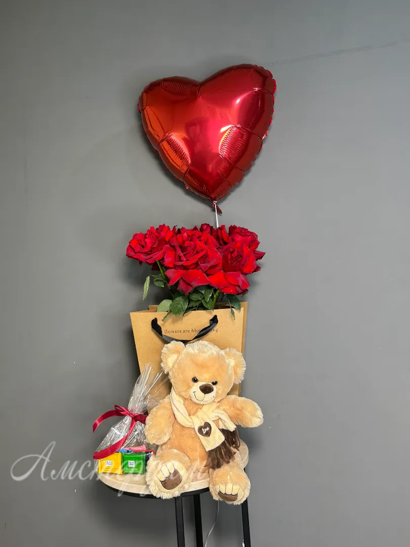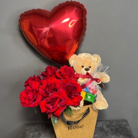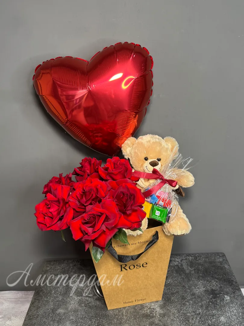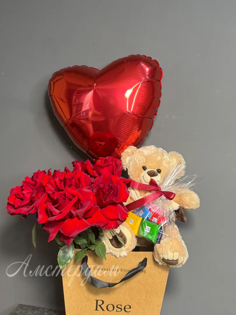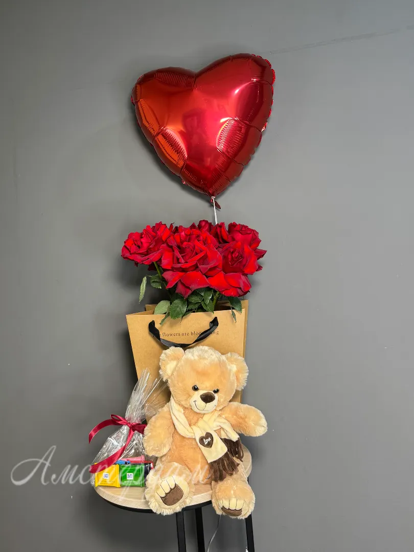 Набор из французских роз, мягкого мишки, шоколада, и шара сердце