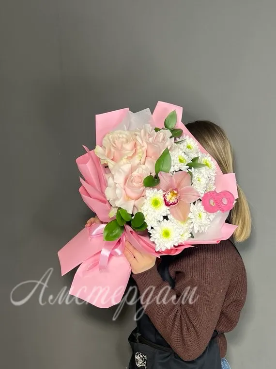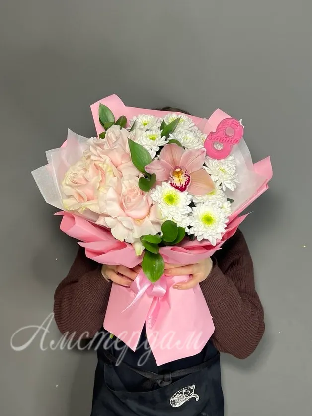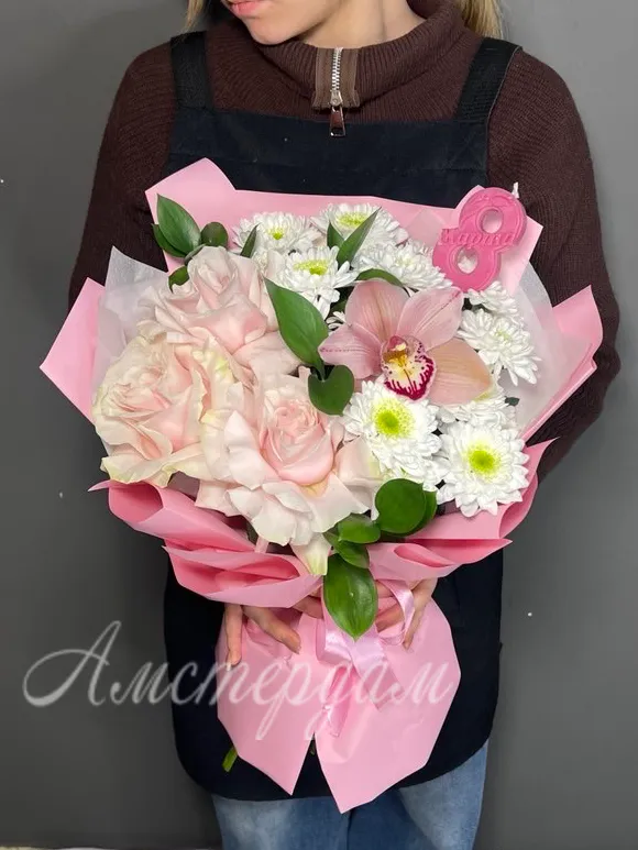 Нежный букет «8 марта» с французскими розами, орхидеей и хризантемой