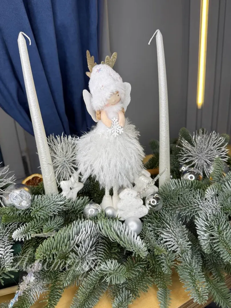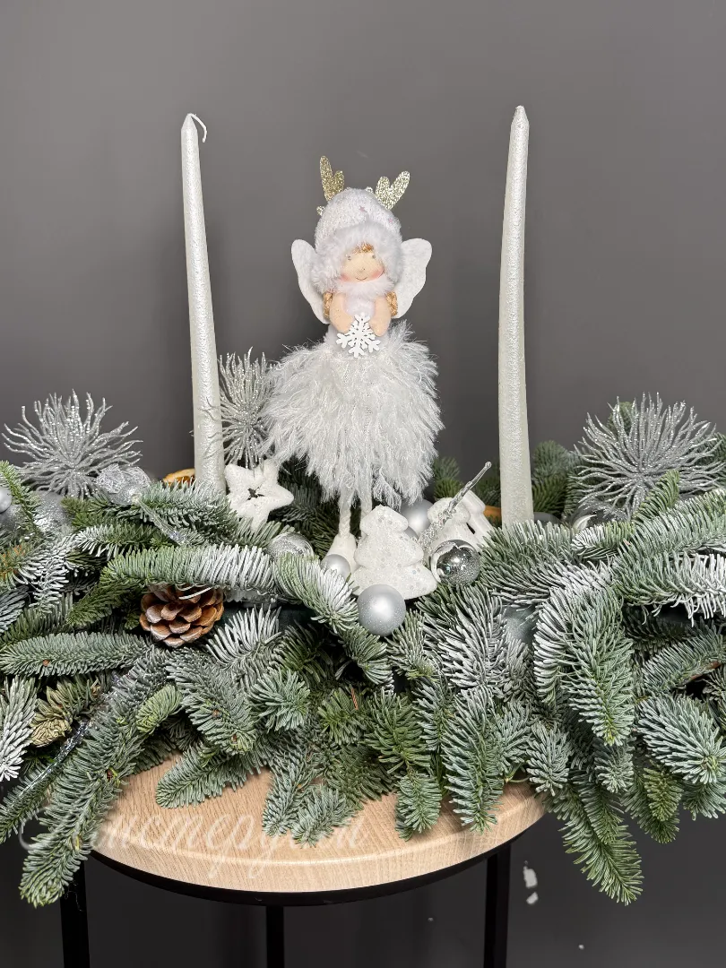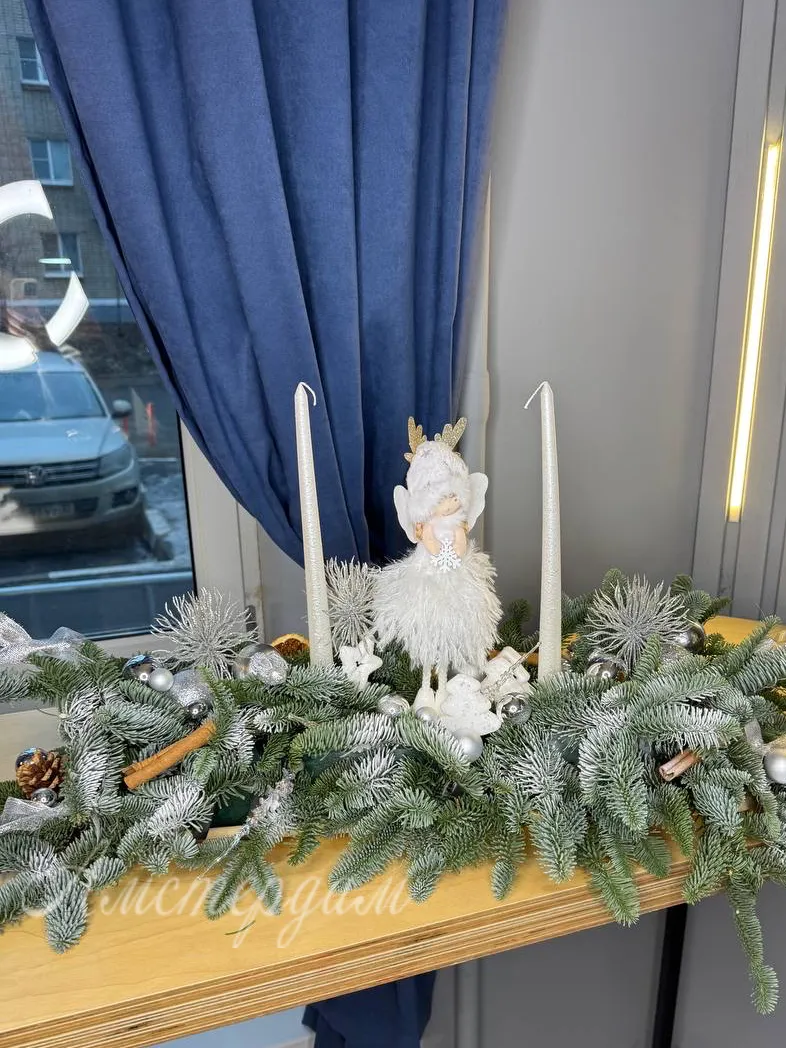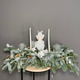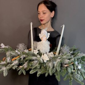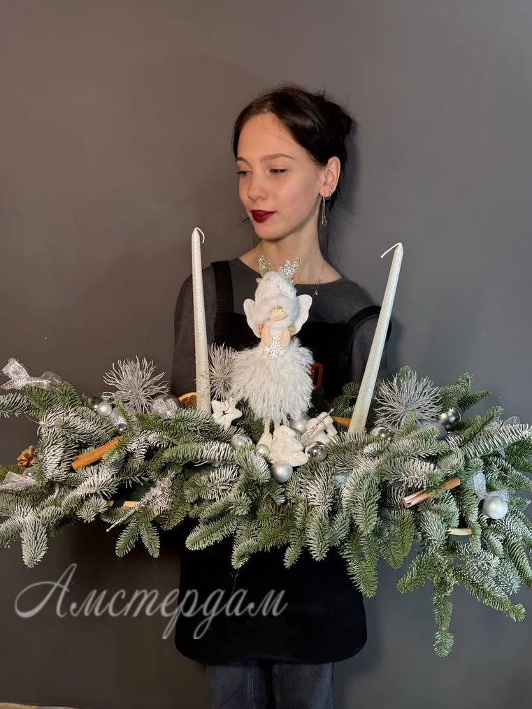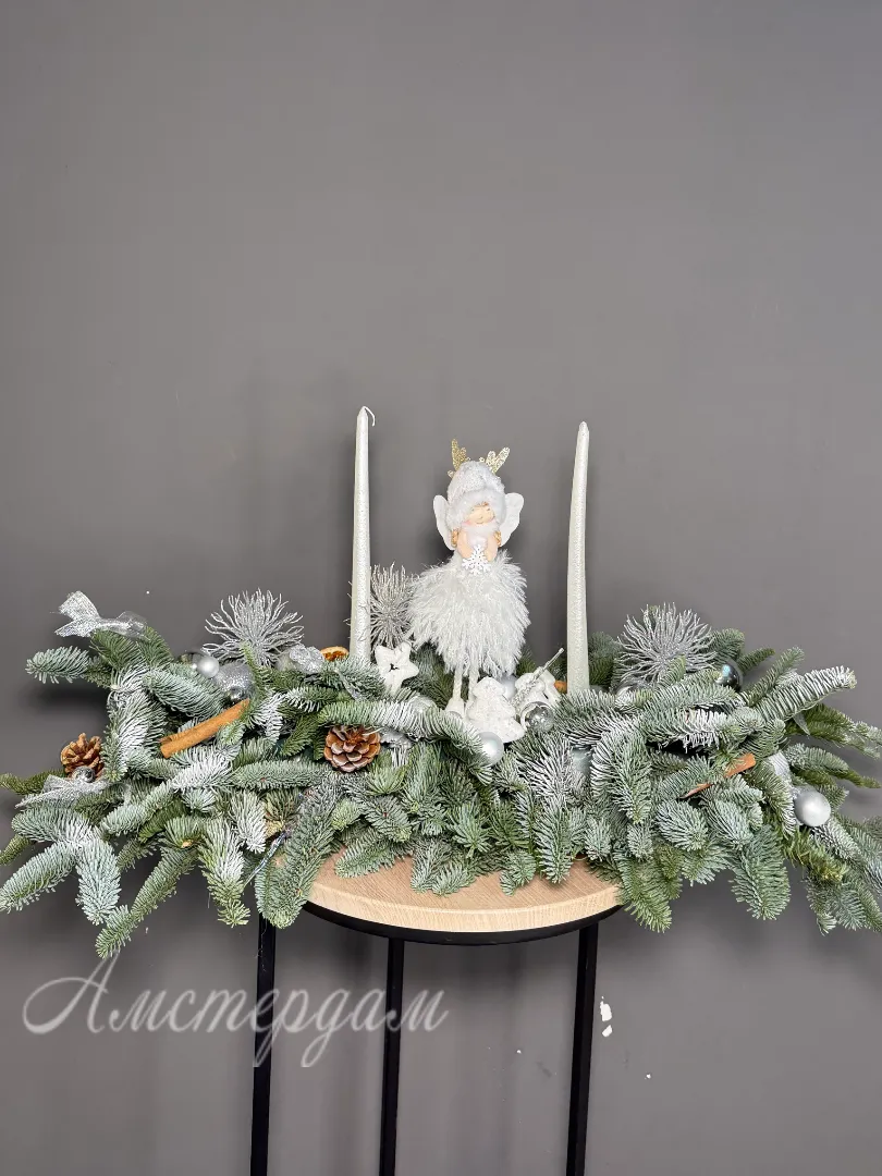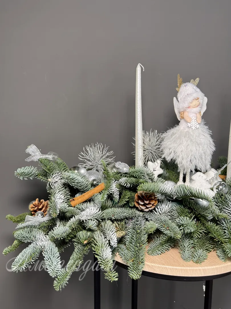 Эта зимняя композиция станет ярким украшением вашего новогоднего стола. В ее составе — уютная свеча, создающая теплую атмосферу и приятное освещение. Украшения, выполненные в праздничном стиле, придают композиции особенное очарование. Оазис обеспечивает надежную фиксацию всех элементов, сохраняя свежесть композиции. Соцветия Нобилиса добавляют ей нежности и естественной красоты. Композиция отлично подойдет как для домашнего праздника, так и для праздничного мероприятия. Она создает настроение уюта и волшебства в вашем доме. Благодаря продуманному дизайну, она гармонично впишется в любой новогодний интерьер.