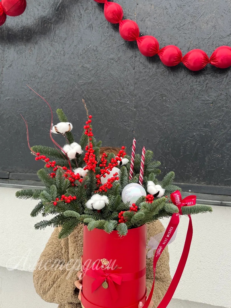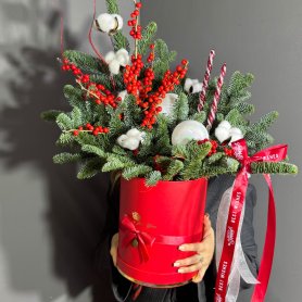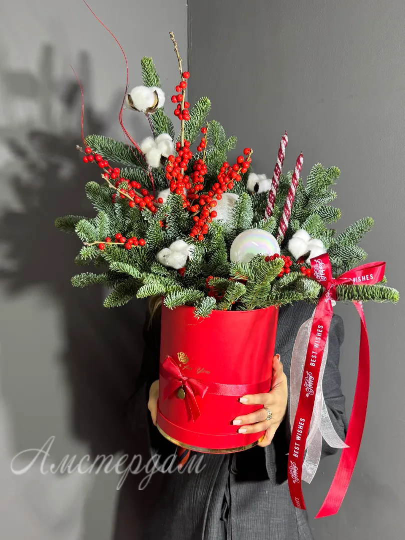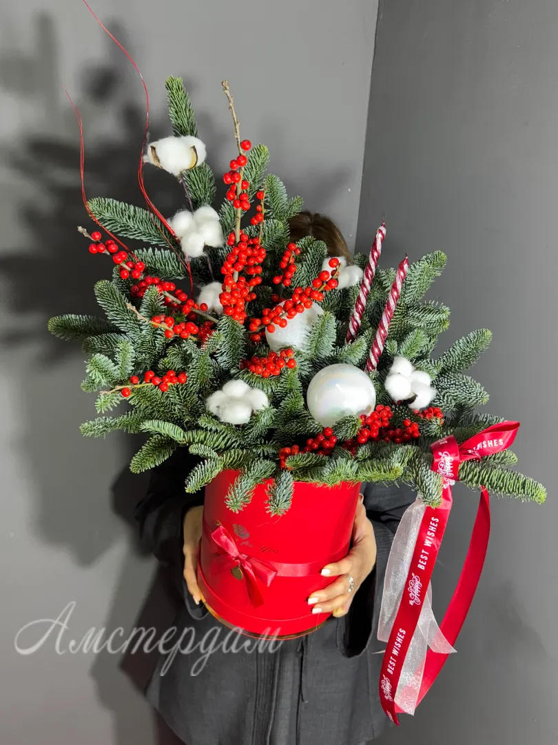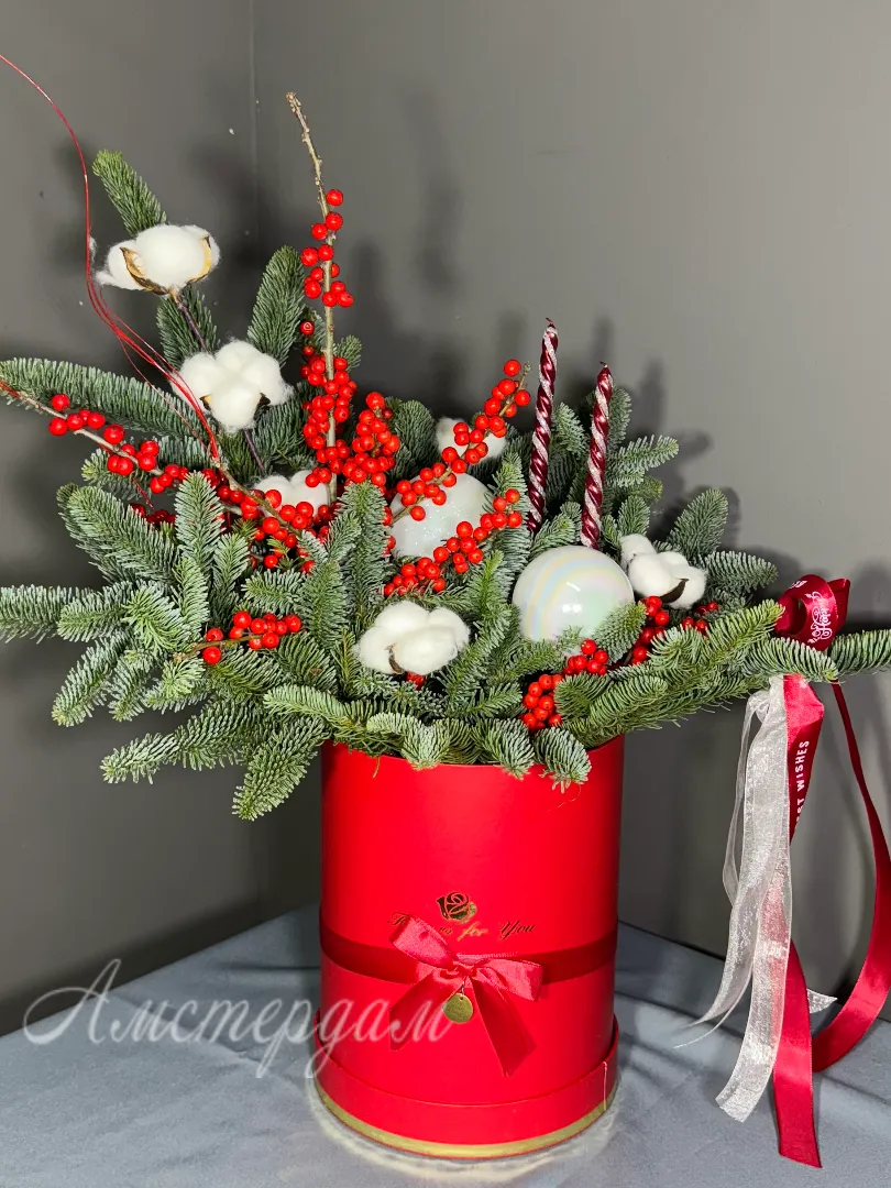 Эта зимняя композиция сочетает в себе элегантность и уют, благодаря веткам крашенного и оазису. В состав входят гигантский илекс, нобилис, хлопок и свечи, созданные для праздничного настроения. Идеальный подарок или украшение для зимнего интерьера, которое подчеркнет атмосферу праздника и тепла.