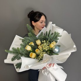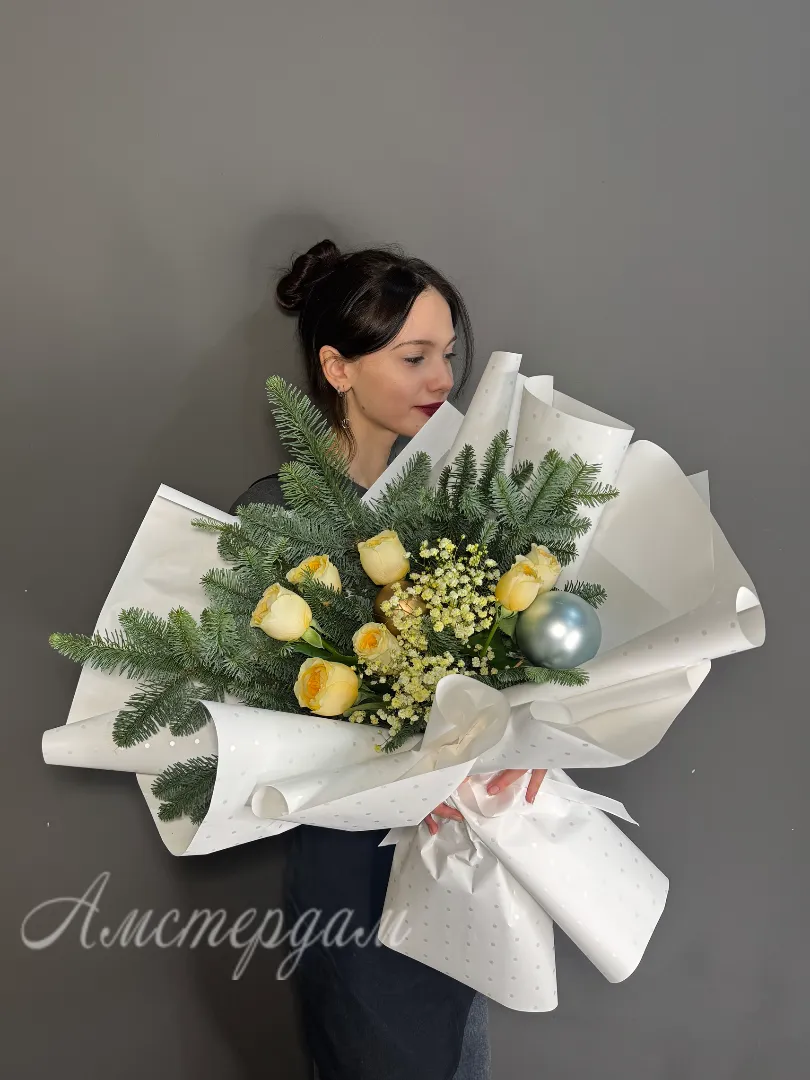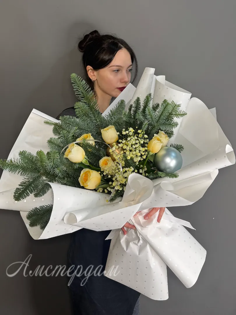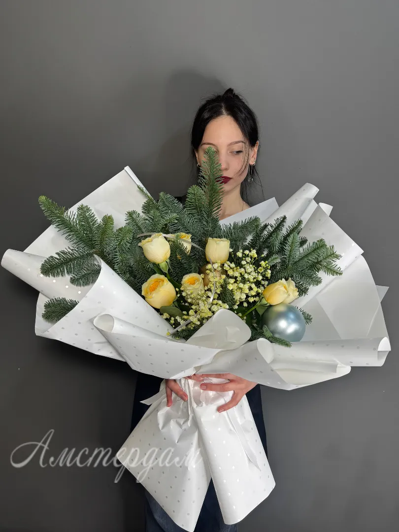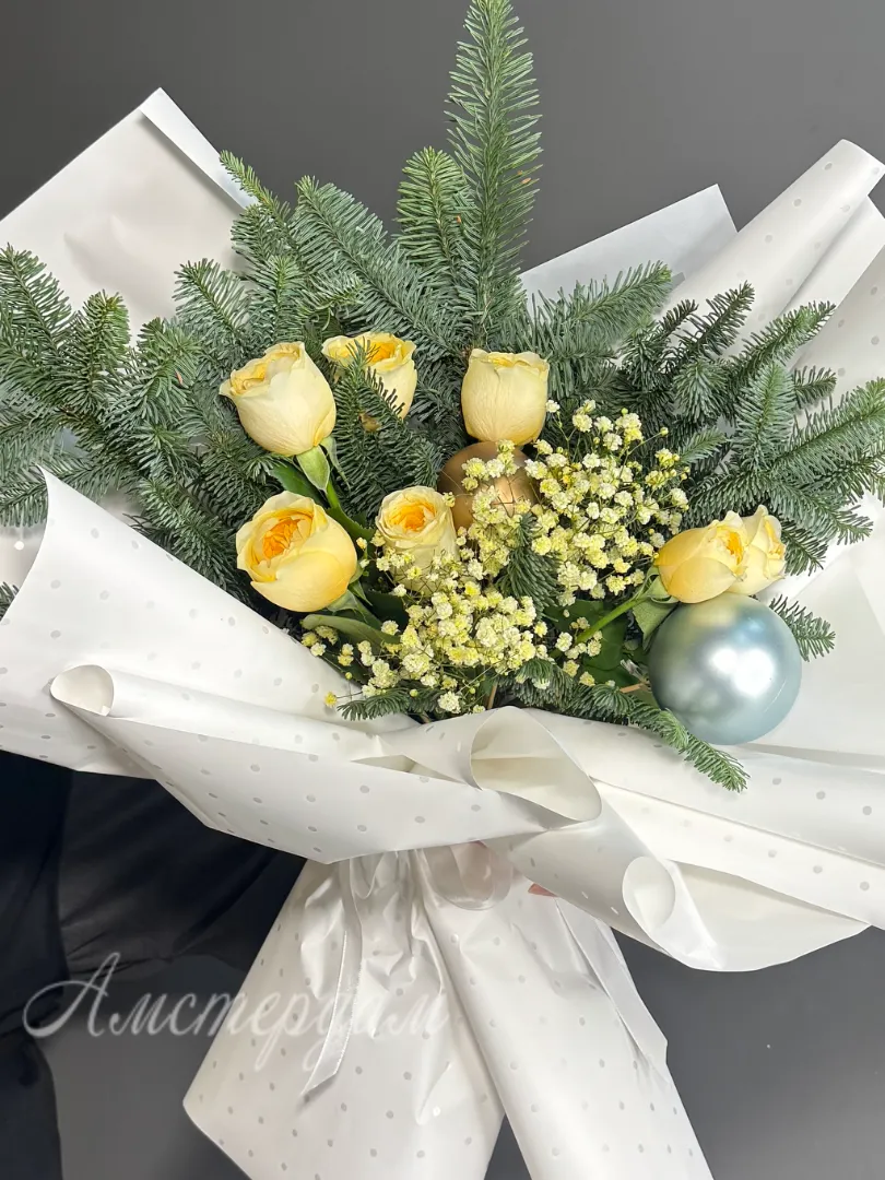 Погрузитесь в атмосферу зимней сказки с нашим изысканным зимним букетом, идеально подходящим для зимних праздников и новогодних праздников. В его составе вас ждут прекрасные пионовидные розы, нежная гипсофила радужная и изящный нобилис, создающие гармоничный и праздничный ансамбль. Упаковка и новогодние игрушки добавляют дополнительный уют и шарм, превращая букет в оригинальный подарок. Такой подарок подчеркнёт вашу заботу и внимание к близким в холодное зимнее время. Эксклюзивное сочетание цветов и декоративных элементов делает этот букет идеальным украшением интерьера или праздничного стола. Закажите зимний букет уже сегодня и подарите радость и тепло в холодную пору!