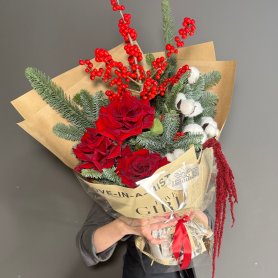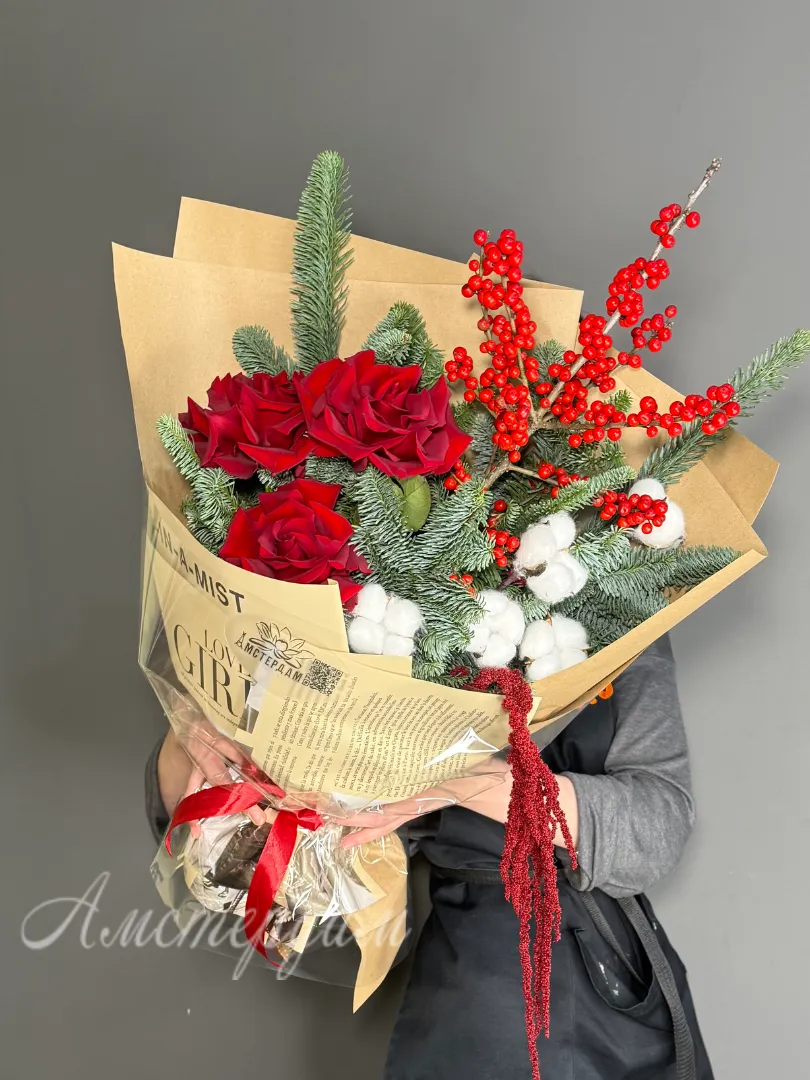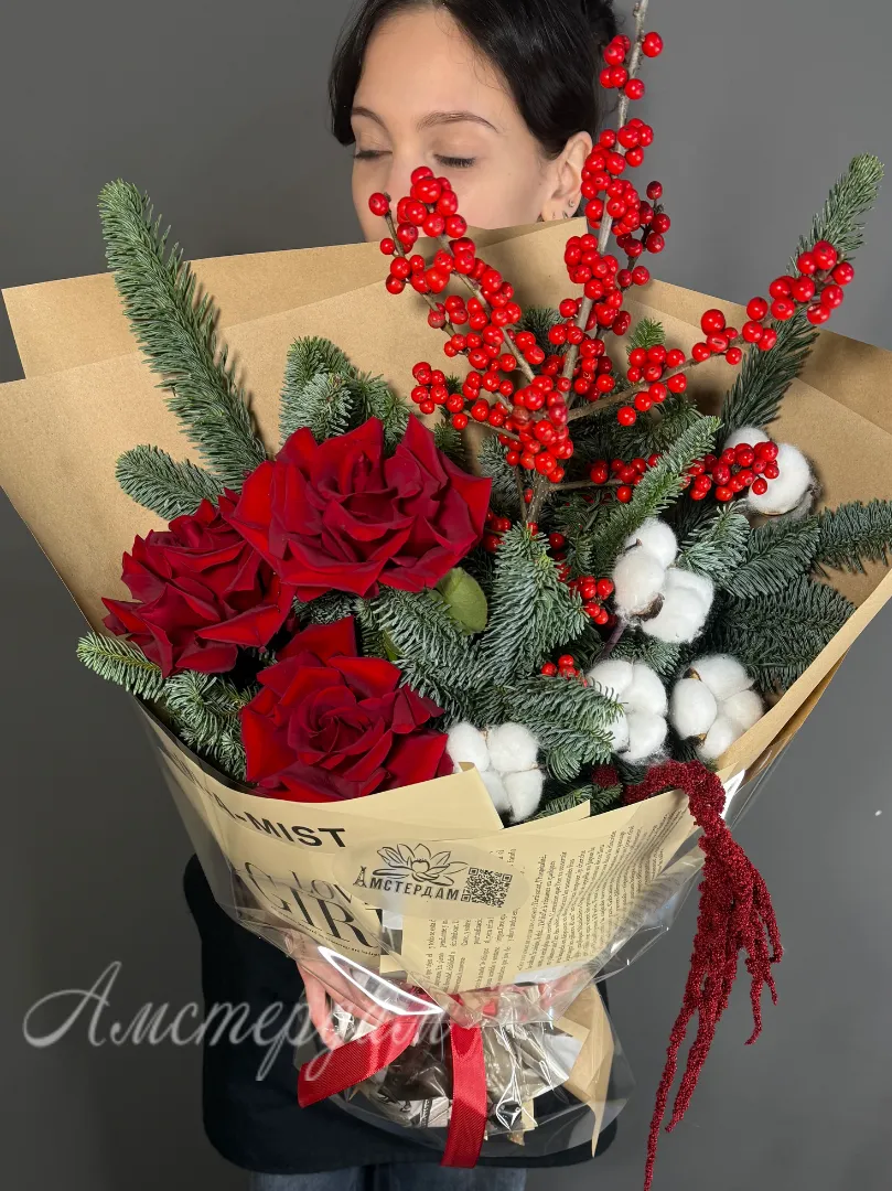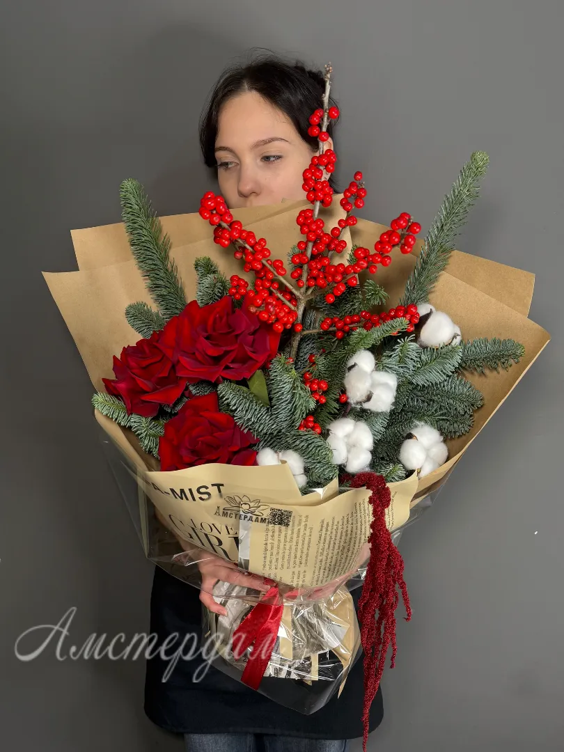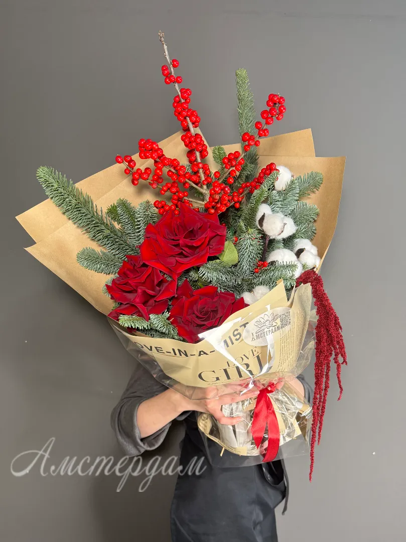 Пусть этот яркий букет с французскими розами станет ярким акцентом любого интерьера или прекрасным подарком для близкого человека. В его состав входят элегантные и насыщенные цвета — красный и белый, дополненные нежными ягодками, амарантом и хлопком, создающими ощущение свежести и уюта. Стильная упаковка и изысканные цветы, такие как Нобилис и Илекс, подчеркивают уникальность композиции. Этот букет подарит радость и красоту в любой ситуации.
