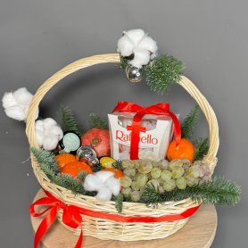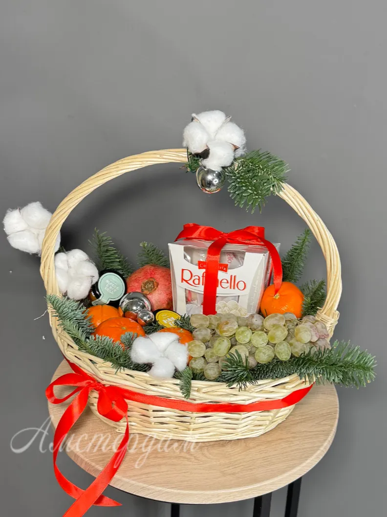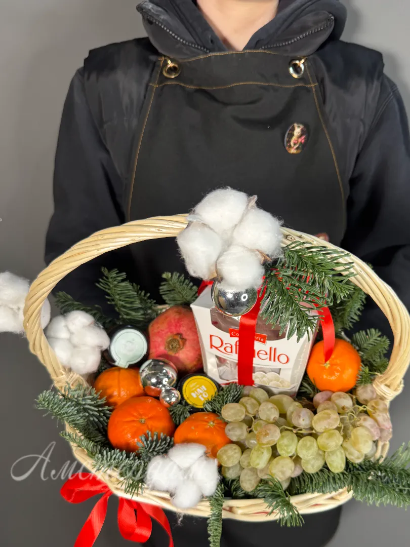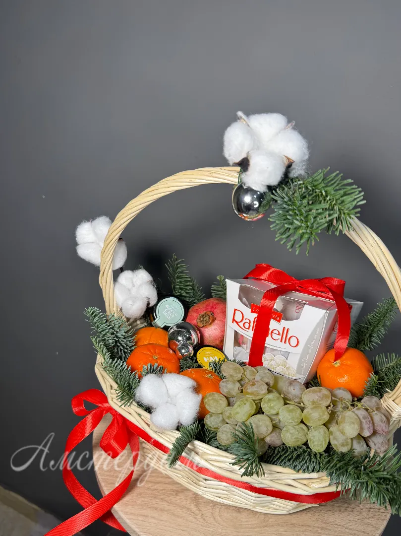 Средняя корзина фруктов — изысканное сочетание свежих мандаринов, винограда и граната, украшенная новогодними игрушками. В комплект входят сладкие конфеты Рафаэлло и ароматный мед, создающие атмосферу праздничного уюта. Корзина, выполненная из натуральных хлопковых материалов, подчеркивает экологичность и эстетику подарка. Дополняют композицию нежные цветы Нобилис, придавая ей особую праздничную изысканность.
