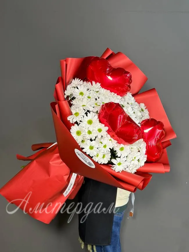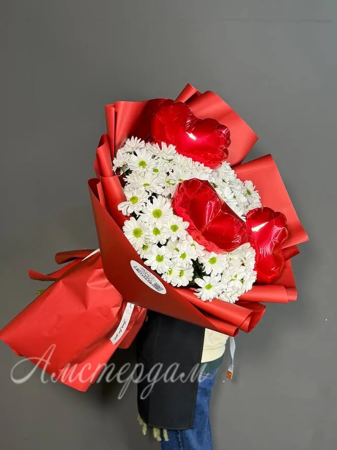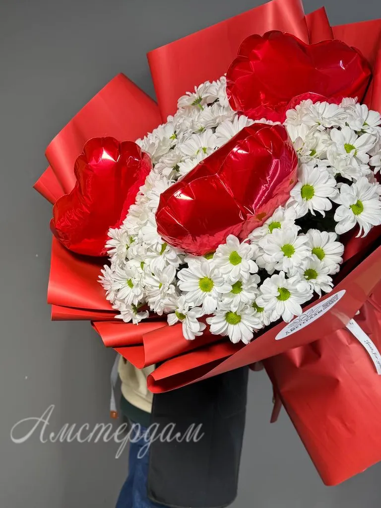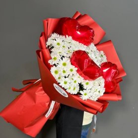 Этот яркий и праздничный букет гигант «Ромашки и сердце» станет идеальным подарком для любимых и близких. В состав композиции входят свежие хризантемы кустовые, создающие объем и яркий акцент. Упаковка и фольгированный шар дополняют оформление, делая его особенно эффектным. Букет подчеркивает искренние чувства и радость любого торжества. Он отлично подойдет для поздравлений, признаний и особых случаев.