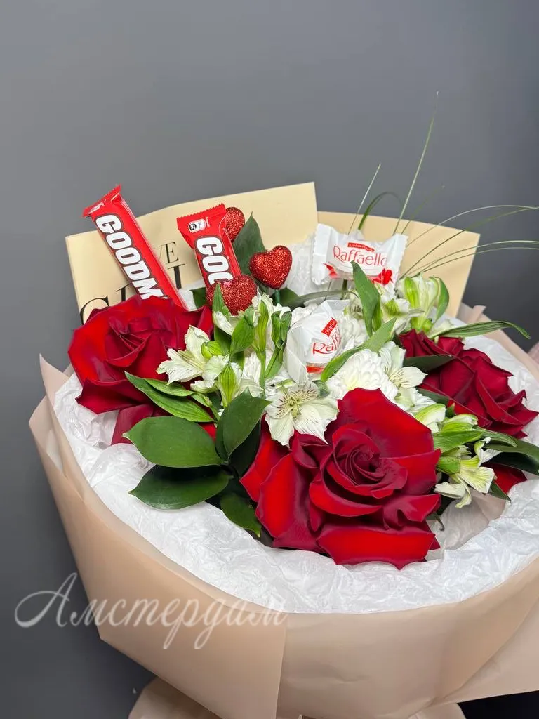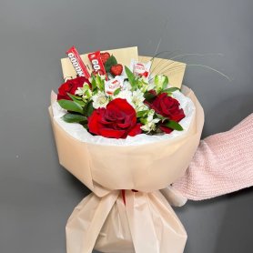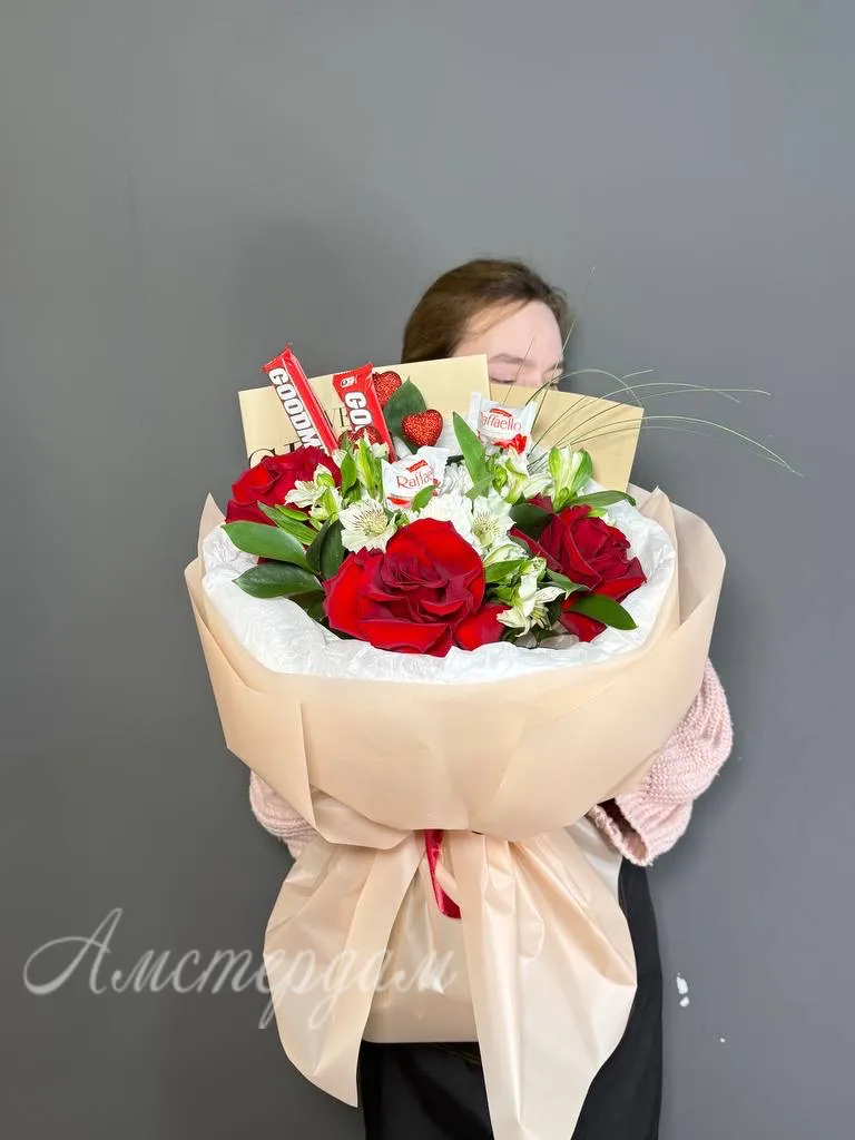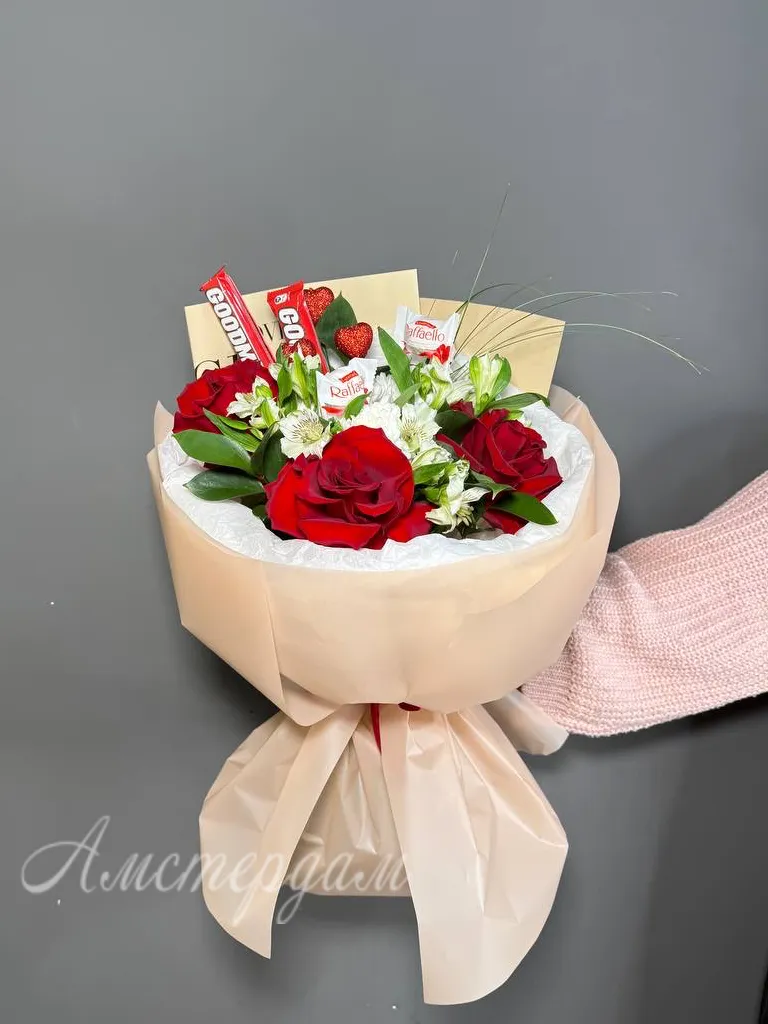 Этот утончённый букет «Сладкий букет» сочетает в себе нежность и изысканность с яркими акцентами сладости. В его составе — французские розы, альстромерии и кустовые хризантемы, украшенные берграсом и рускусом. В центре композиции расположены конфеты рафаэлло, добавляющие особый шарм и сладкое настроение. Всё завершено мягкой упаковкой, маленьким декоративным сердечком и шоколадом, создавая идеальный подарок для особых мгновений.