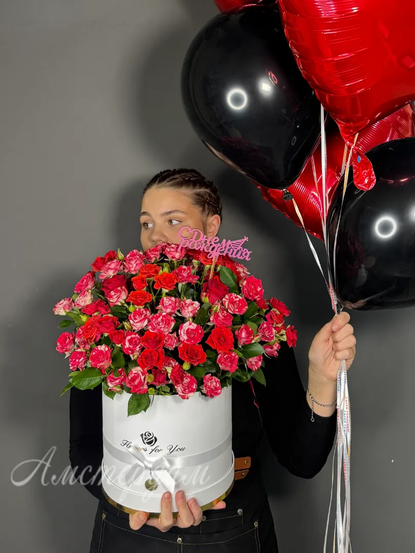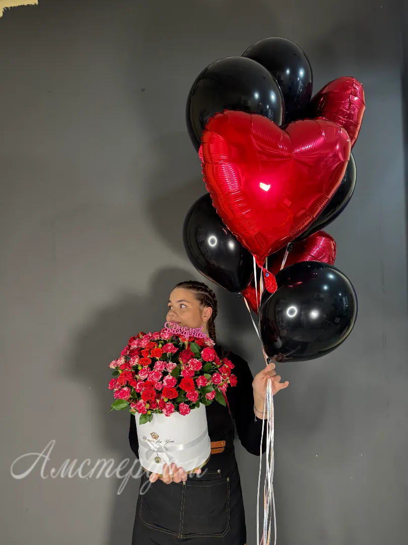 Эта изысканная коробка украшена роскошными кустовыми розами, создающими атмосферу изящества и утончённости. В набор входит стильный латексный шар, придающий яркость и свежесть композиции, а также фольгированный шар, добавляющий мерцания и праздничного настроения. Всё дополнено изящной атласной лентой, которая подчеркивает аккуратность и элегантность оформления. Внутри находится качественный оазис, обеспечивающий свежесть и длительную сохранность цветов. Саму коробку выполнена из прочных и красивых материалов, подчеркивающих дорогой статус подарка. Кустовые розы прекрасно сочетаются с украшением, делая композицию яркой и насыщенной. Такой подарок подойдет для особых случаев, чтобы выразить тёплые чувства и внимание. Вся композиция создаёт уютную и праздничную атмосферу, радуя глаз и сердце получателя.