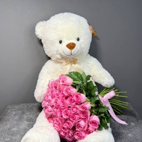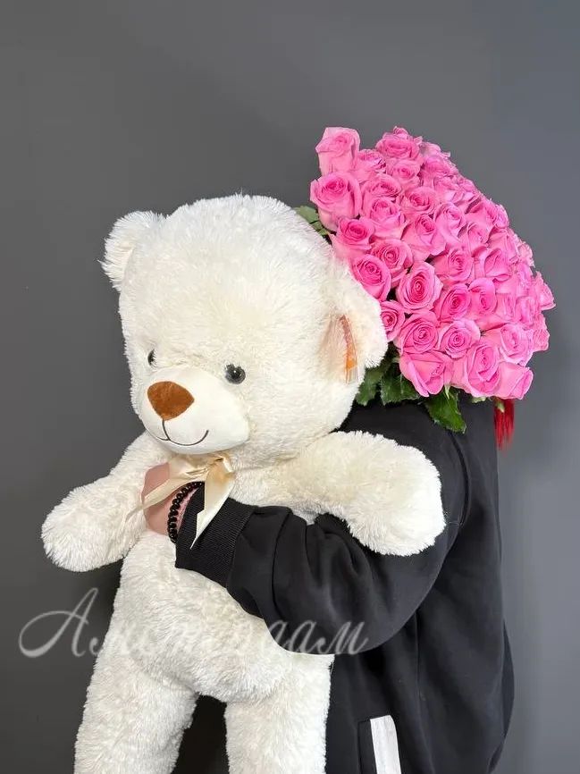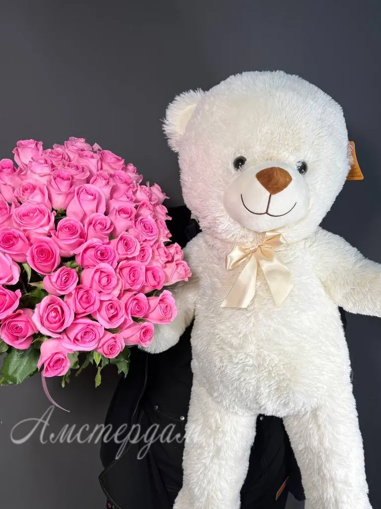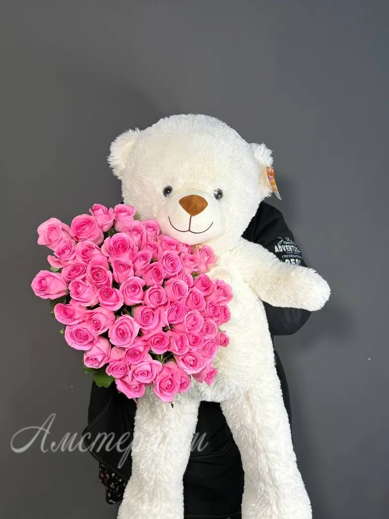 Этот милый медведь высотой 100 см станет замечательным подарком или элементом декора. В комплект входит 55 роз, соединённых в красивую композицию, которая придаст любой комнате уют и нежность. Лента атласная добавляет изысканности и завершенности оформлению. Каждая роза выполнена из высококачественных материалов, что гарантирует их долговечность и свежий внешний вид. Медведь и розы создают гармоничное сочетание мягкости и элегантности. Такой набор идеально подойдет для праздников, особенно для дня рождения или празднования юбилея. Он отлично подойдет для украшения спальни, гостиной или зоны для фотосессий. Эстетичное оформление и приятные материалы порадуют любого получателя. Этот подарок напомнит о любви и заботе и оставит тёплые воспоминания. Создайте волшебную атмосферу, подарив своему близкому человеку незабываемый композиционный букет.