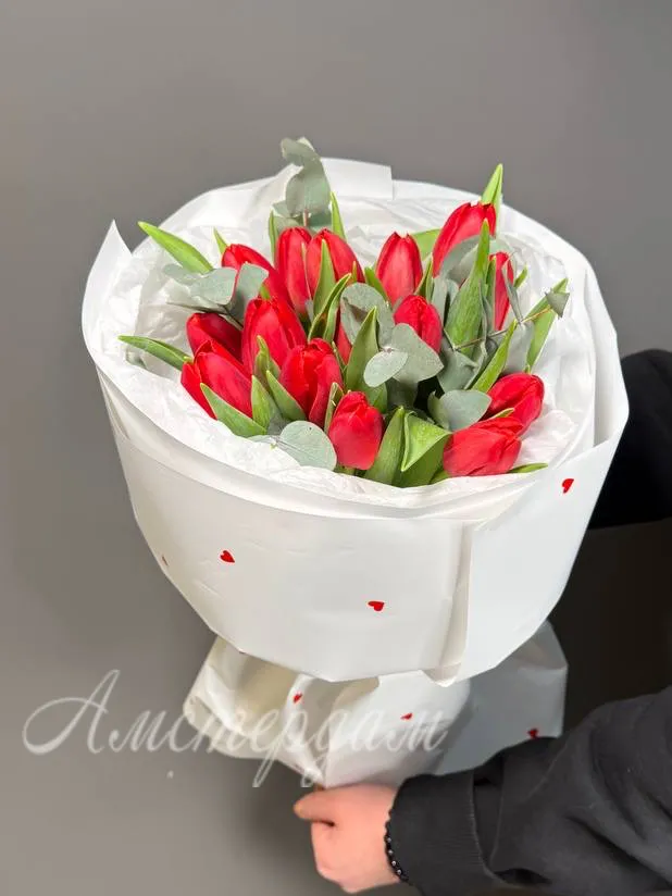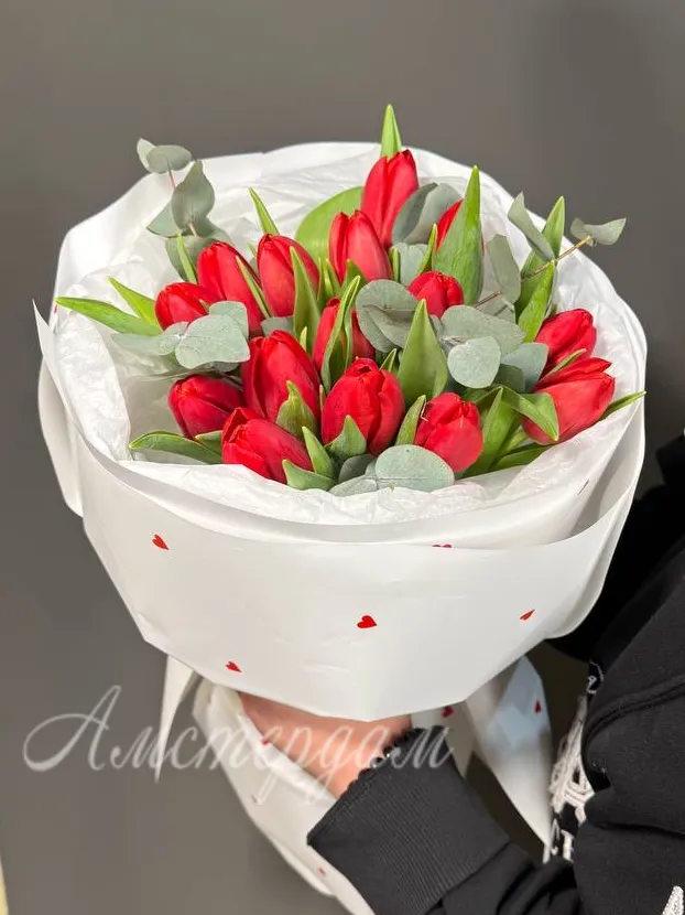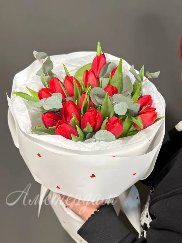 Подарите яркий и страстный настроение с нашим букетом из красных тюльпанов, дополненных свежим эвкалиптом. Каждая композиция аккуратно упакована в элегантную упаковку, которая подчеркнет важность момента. Красные тюльпаны символизируют любовь и страсть, придавая вашему подарку особую значимость. Аромат эвкалипта добавляет свежести и утонченности, делая букет незабываемым. Идеальный выбор для тех, кто ценит красоту и искренние эмоции.